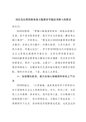 局长在自然资源系统主题教育专题读书班上的讲话同志们:XXXXXX强调,要凝心铸魂筑牢根本、锤炼品格强化忠诚、实干担当促进发展、践行宗旨为民造福、廉洁奉公树立新风。市委要求,要坚持以XXXXXX重要讲话精神为指引,实现认识大提升、问题大梳理、工作大推动、作风大转变、环境大优化。学习贯彻XXX新时代中国特色社会主义思想主题教育开展以来,全市自然资源系统以XXXXXX重要讲话重要指示精神为根本遵循,坚决落实市委部署要求,坚持五加强、五着力,提高自然资源要素服务保障能力,在服务现代化美好城市建设中锤炼坚强党性、铸牢对党忠诚。下面,我谈几点意见。一、加强理论武装,着力在凝心铸魂筑牢根本上下功夫XXXXXX指出,以学铸魂,就是要做好学习贯彻新时代中国特色社会主义思想的深化、内化、转化工作,从思想上正本清源、固本培元,筑牢信仰之基、补足精神之钙把稳思想之舵。坚定理想信念,关键在于理论武装。一要增强学习定力。要加强党的创新理论武装,这是坚定信念信仰、锤炼党性品格、提升能力水平的根本。同时,要聚焦职责任务,加强本系统本领域专业知识的学习,提升履职尽责的本领。学习是知识不断积累的过程,通过不断学习和知识积累,增强战略性谋划、前瞻性思考、系统性布局、整体性推进的能力。坚持干什么学什么,缺什么补什么,要在学中干、干中学,形成学习——实践——再学习——再实践的良性循环。二要提升实践能力。要一边学一边思考如何贯彻落实好XXXXXX重要讲话重要指示精神,时常对标对表,纠正偏差。要善于运用科学的手法、步法、打法和生态理念、工业互联网思维来改造工作方法和流程,既不能刻舟求剑、封闭僵化,也不能照抄照搬、食洋不化。三要改造思想方法。XXXXXX在视察中办的时候强调,对党中央作出的决策、部署的工作、定下的事情要雷厉风行、紧抓快办,扭住不放、一抓到底。在具体落实的过程中,要站在前沿、感知前沿、认识前沿,改造思想方法,增强系统思维,赋能工作提升。四要强化全局意识。站在全局和战略的高度想问题、办事情,体现的是一种观大事、顾全局、谋长远的工作能力,是科学世界观方法论在实际工作中的运用,也是新时代党员干部特别是领导干部必备的基本素养。要深刻理解自然资源部门在党和国家事业发展全局中的定位、内涵和作用,从全市发展大局出发思考如何服务于新发展格局、保障三地一区目标的实现、助力现代化美好城市建设。二、加强政治历练,着力在锤炼品格强化忠诚上下功夫XXXXXX强调,以学增智,就是要从党的科学理论中悟规律、明方向、学方法、增智慧,把看家本领、兴党本领、强国本领学到手。在干部干好工作所需的各种能力中,政治能力是第一位的。一要持续在提高政治判断力上用力。XXXXXX强调,增强政治判断力,就要以国家政治安全为大,以人民为重,以坚持和发展中国特色社会主义为本,增强科学把握形势变化、精准识别现象本质、清醒明辨行为是非、有效抵御风险挑战的能力。提高政治判断力,重点解决的是立场观点的问题,是对坚持什么、摒弃什么的科学判断,是对拥护什么、反对什么的清醒认知是对该干什么、不该干什么的正确选择。二要持续在提高政治领悟力上用力。只有不断强化理论思维,提高政治领悟力,才能自觉运用XXX新时代中国特色社会主义思想的世界观和方法论,深刻领会党中央决策部署,吃透市委市政府和自然资源厅的工作要求,才能真正践行好两个维护,做到对国之大者了然于胸、对市之大计心中有数。三要持续在提高政治执行力上用力。提高政治执行力,所有工作都要在XXXXXX的重要讲话重要指示中找依据、找方向、找方法、找标准,要经常同党中央精神对标对表,认真贯彻落实市委市政府决策部署,精心绘好施工图,真正做到XXX有号令、党中央有部署,我市见行动,自然资源见成效。三、加强实践锤炼,着力在实干担当促进发展上下功夫XXXXXX指出,中国式现代化是人与自然和谐共生的现代化必须牢固树立和践行绿水青山就是金山银山的理念,站在人与自然和谐共生的高度谋划发展。新时代新征程,必须聚焦自然资源两统一核心职责和四个基本定位,担当作为、推动发展。一要在严守资源安全底线上下功夫。自然资源部门工作涉及粮食、能源资源、国土等重大安全,肩负重要使命,要牢牢守住耕地红线,加强矿产资源保护,强化测绘地理信息安全,加强地质灾害防治,夯实粮食、能源资源、地理信息数据等安全保障体系,提高安全发展能力。二要在优化国土空间格局上下功夫。坚持系统观念,强化底线约束,搞好顶层设计,不断完善国土空间规划体系,严格国土空间用途管制,扎实推进全域土地综合整治,推动构建优势互补、高质量发展的区域经济布局和国土空间体系,服务全市重大战略实施和区域协调发展。三要在促进绿色低碳发展上下功夫。完整、准确、全面贯彻新发展理念,切实站在人与自然和谐共生的高度,