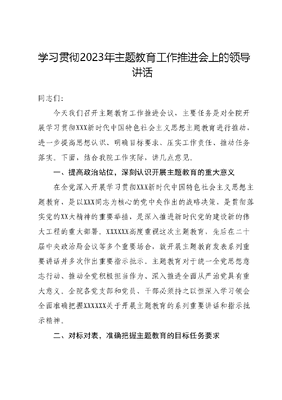 学习贯彻2023年主题教育工作推进会上的领导讲话同志们:今天我们召开主题教育工作推进会议,主要任务是对全院开展学习贯彻XXX新时代中国特色社会主义思想主题教育进行推动,进一步提高思想认识、明确目标要求、压实工作责任、推动任务落实。下面,结合我院工作实际,讲几点意见。一、提高政治站位,深刻认识开展主题教育的重大意义在全党深入开展学习贯彻XXX新时代中国特色社会主义思想主题教育,是以XXX同志为核心的党中央作出的战略决策,是贯彻落实党的XX大精神的重要举措,是深入推进新时代党的建设新的伟大工程的重大部署。XXXXXX高度重视这次主题教育,先后在二十届中央政治局会议等多个重要场合,就开展主题教育发表系列重要讲话并多次作出重要指示批示。主题教育对于统一全党思想意志行动、推动全党积极担当作为、深入推进全面从严治党具有重大意义。全院各党支部和党员、干部必须持之以恒深入学习领会全面准确把握XXXXXX关于开展主题教育的系列重要讲话和指示批示精神。二、对标对表,准确把握主题教育的目标任务要求XXXXXX的重要讲话和中央《意见》,对开展好这次主题教育作出了明确具体要求。我们要结合医院实际,紧紧围绕主题教育的根本任务、具体目标,对标对表,确保主题教育不虚不偏。一是总要求。主题教育的总要求是学思想、强党性、重实践、建新功,要将其作为一个紧密联系、相互贯通、内在统一的整体,贯穿主题教育的全过程。学思想,就是要全面学习领会新时代中国特色社会主义思想,自觉用新时代中国特色社会主义思想指导各项工作。强党性,就是要自觉用新时代中国特色社会主义思想改造主观世界,始终保持共产党人的政治本色。重实践就是要自觉践行新时代中国特色社会主义思想,积极解决医院改革发展中的难题、群众看病就医中遇到的急难愁盼问题,以及党的建设中存在的问题。建新功,就是要从新时代中国特色社会主义思想中汲取奋发进取的智慧和力量,不断提高履职尽责、干事创业的能力和水平,努力创造经得起历史和人民检验的实绩二是根本任务。主题教育的根本任务是坚持学思用贯通、知信行统一,把XXX新时代中国特色社会主义思想转化为坚定理想锤炼党性和指导实践、推动工作的强大力量,使全党始终保持统一的思想、坚定的意志、协调的行动、强大的战斗力,努力在以学铸魂、以学增智、以学正风、以学促干方面取得实实在在的成效。准确把握这一根本任务,是确保主题教育扎实开展、取得实效的基本前提。围绕这一根本任务,我们要更加自觉在真学真信真用、学懂弄通做实XXX新时代中国特色社会主义思想上下功夫着力解决理论学习、政治素质、能力本领、担当作为、工作作风廉洁自律等方面的问题。三是具体目标。主题教育的具体目标是凝心铸魂筑牢根本、锤炼品格强化忠诚、实干担当促进发展、践行宗旨为民造福、廉洁奉公树立新风,体现了我们党对新时代党员干部思想、政治、能力、作风、廉政等方面的基本要求。对于我们医疗机构,就是教育引导全体党员、干部坚定对马克思主义的信仰、对中国特色社会主义的信念,切实增强四个意识、坚定四个自信、做到两个维护,不断增强纪律意识、规矩意识,持续纠治四风,以人民为中心的发展思想、时时放心不下的责任感、积极担当作为的精气神,为党和人民履好职、尽好责。三、聚焦重点,有效推进主题教育扎实开展要结合工作实际,落实重点措施,有力有序有效推进主题教育深入扎实开展。一是学习提升。扎实抓好主题教育,要坚持读原著学原文悟原理,坚持多思多想、学深悟透,原原本本一篇一篇的学习党的XX大报告、党章、《XXX著作选读》和《XXX新时代中国特色社会主义思想专题摘编》等指定书目,全面学习领会XXXXXX关于卫生健康工作的重要讲话,认真学习中国式现代化理论,全面学习领会XXX新时代中国特色社会主义思想的科学体系、精髓要义、实践要求,真正做到学懂弄通。要对提出的新理念、新思想、新战略对各方面工作提出的具体要求,都要放在整个科学体系中来认识和把握,紧密结合医院工作实际,做到整体把握、融会贯通。二是调查研究。要按照党中央和省委、市委、区委的部署要求,积极教育引导全院党员干部沉下身子了解民情、掌握实情、解剖麻雀,搞清楚问题是什么、症结在哪里,拿出破解难题的实招、硬招。领导班子成员和各科室负责人要带头开展调研,深入服务各环节、各流程、各领域,聚焦看病不放心、就医体验差等群众反映最强烈、最突出的问题,聚焦事业改革发展中的重点难点,建立问题清单,逐一研究制定措施,分类明确解决时限,真正把调研转化为解决问题、推进工作的实际举措。要根据不同类型问题采取不同调研方式,对复杂疑难性问题,注重采取蹲点式调研,深入基层追根溯源、剥丝抽茧,找出解决问题;对流程性问题,注重采取代入式沉浸式调研,转换角色、走进群众现场解决问题;对在贯彻落实性问题,注重采取督查式跟踪式调
