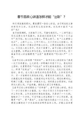 春节后收心讲话怎样才能出彩?昨天网友接到通知,要求撰写一份收心讲话,由于网友刚从事材料写作工作,还没有写过类似材料,问怎样才能写出彩呢?春节放假期间,大家抛下工作,尽情吃喝玩乐,一上班可能心思还沉浸在过年氛围内。而且我们国家还有不过十五不出年的习俗,有人以此为借口,即使上班了,也人在曹营心在汉,上班不上心,工作不用心。为了尽快让大家收心,现在单位上班第一天都会召开收心会议,主要目的就是让大家收心,尽快投入到工作中。在这个背景下,春节后收心讲话显得尤为重要,这释放出单位态度,也传递出单位工作作风。而一篇春节收心讲话稿要想出彩就要做到明+实+严三个字。1.春节后收心讲话要明目标。春节后收心讲话说白了就是一次工作部署会,让大家进一步明确今年要干什么,要达到什么目标。这里要用到对比法来写比较有说服力,而且吸引人。所谓比较法,一方面纵向与自己比,比比以前成绩、指标、排名,让大家认清现在单位是进是退,工作有没有提升。另一方面横向与其他地方比,看看本单位的位次、差距,在数据比较中找差距,在数据对比中找不足。通过纵横对比,明确了位置,才能进一步激发斗志,进而提出合理目标,才能得到大家认同,产生共情,调动起大家工作积极性。2.春节后收心讲话要给出实举措。春节后收心讲话,给出下一步工作打算十分重要。这一部分不同于工作总结中的下一步工作打算。工作总结的打算比较笼统,只是讲了一个大纲,粗略讲了一个方向。可过节收心讲话再提下一步工作打算,就要更实、更具体,这就不能仅仅提出一个大方向,还要提出围绕这个方向具体抓好哪些具体工作,并提出具体要求。可以说,这次工作打算就是具体的作战计划路线图。所以,这一部分是春节后收心讲话的重中之重,把新的一年要抓的重点工作都摆出来,讲清楚目标、实现路径和奖惩措施。这部分具体怎么写?一与主要领导沟通,有没有要求。二看上级有没有新要求、新任务。三查本部门有没有奋斗新目标,新年突出抓好新工作。围绕这三部分内容,就可以基本找出工作重点,一项一项安排部署即可。3.春节后收心讲话要传递严要求。春节后收心讲话还有重要的一部分内容,就是强调一下作风,这一部分不仅要晓之以情,还要动之以理,讲清楚收心的重要性,传递出时间紧、任务重的紧迫感;传达到严守工作纪律、团结协作的重要性;说明白不好好工作,工作懒散的惩处措施。总而言之要传递出一个严字,并推出配套的制度,这样才能真正达到讲话目的,让大家快收心、快投入工作。