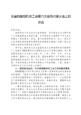 在省档案馆机关工会第六次会员代表大会上的讲话各位代表:馆领导班子对这次会议非常重视,召开馆务会议专题听取了工会换届筹备工作的汇报,并对做好这次换届和下步工会工作提出了具体要求。首先,我代表馆领导班子,向上一届机关工会为推进省档案馆发展所作的贡献表示感谢!对新一届工会和新当选的各位委员表示祝贺!多年来,馆机关工会在省直机关工会和馆领导班子的领导下,坚持以XXX新时代中国特色社会主义思想为指导,深入贯彻落实党的十九大和十九届二中、三中、四中、五中、六中全会精神,围绕中心、服务大局,团结和带领广大干部职工以饱满的热情投身各项工作,充分发挥了工会组织的桥梁和纽带作用,为促进档案工作科学发展做出了积极贡献。下面,就进一步做好机关工会工作讲三点意见:一、提高政治站位,牢牢把握新时代工会工作的根本要求XXXXXX在同中华全国总工会新一届领导班子成员集体谈话时强调:我国工运事业是党的事业的重要组成部分,工会工作是党治国理政的一项经常性、基础性工作。工会是党领导下的群团组织,因而突显政治性、保持先进性、增强群众性就体现了新时代工会工作的根本要求。一要突显政治性。政治性是工会组织的灵魂,也是工会工作的本质要求。机关工会必须把自身建设和全部工作置于党的领导之下,坚持以XXX新时代中国特色社会主义思想为指导,坚决贯彻党的路线方针政策和馆领导班子决策部署,确保工会工作正确的政治方向。我们馆机关和直属事业单位共有职工人,都是工会会员,能否把这个群体团结好服务好,应该说责任重大、使命光荣。新一届工会要认真贯彻落实XXXXXX关于工会要永远保持自觉接受党的领导这一优良传统,提高政治站位,强化政治意识,履行政治责任,把职工群众广泛地紧密地团结在党的周围,增强四个意识,坚定四个自信,坚决拥护两个确立,坚决做到两个维护。二要保持先进性。先进性是工会组织的固有属性,也是工会工作的根本着力点。机关工会必须牢牢把握时代主题,保持先进性,发展先进性,把改革作为发展先进性的生动实践,在建功新时代中发挥主力军作用。当今世界正经历百年未有之大变局,国际政治经济格局处于深度调整变化之中,信息技术的迅猛发展,互联网和数字经济的全面普及,社会结构和生产生活方式等都发生了深刻改变,职工群众的思想观念、利益诉求也发生了很大改变。新一届工会工作必须跟上时代发展的潮流,适应形势变化,不断改革创新。要培育先进文化,坚持用党的创新理论武装干部职工,用社会主义核心价值观教育干部职工,汇聚智慧力量,助力档案工作发展振兴。三要增强群众性。群众性是工会组织的根本特点,也是做好工会工作的出发点。XXXXXX强调,要把竭诚为职工群众服务作为工会一切工作的出发点和落脚点,全心全意为广大职工群众服务。新一届工会要牢固树立以人为本的理念,尊重群众的主体地位,充分信赖、坚决依靠职工群众。要发挥工会组织联系群众、服务群众、和群众面对面的天然优势,强化服务意识,提升服务理念,提高服务能力,为职工办好事办实事。加大服务力度,最大限度地帮助解决实际困难,让更多的职工群众从工会组织身上找到归属感认同感,让工会工作接地气、暖人心、聚力量,真正当好干部职工的连心桥,职工群众信赖的娘家人。二、坚持政治标准,自觉遵循新时代工会工作的特点规律机关工会是党的群团组织的重要组成部分。要准确把握新时代工会工作的新变化、新趋势、新规律、新特点,不断提高工会工作水平,不断开创工会工作新局面。一要坚持在党的领导下依法依章开展工会工作。坚持党的领导是做好工会工作的根本保证,依法依章开展工作、发挥作用是工会组织的基本特点和规律。新一届工会要认真学习贯彻《工会法》《机关工会工作暂行条例》等法律法规,围绕党之所需、职工所急、工会所能,依法组织活动,依法开展工作,把党的意志和主张落实到职工群众中去。同时,自觉接受党组织的领导,主动请示报告、积极寻求支持、勇于担当作为,团结带领职工群众高质量完成工作任务。二要坚持把围绕中心、服务大局同联系服务职工群众有机结合。服务工作大局是工会工作的主线,联系服务职工群众是工会工作的职责。围绕中心就是要求我们把工会工作放到档案工作的全局中去思考谋划,以服务大局的成效展现作为。联系服务职工群众就是要求我们坚持以职工群众为中心的工作导向,全心全意办实事做好事,强化桥梁纽带作用。新一届工会要围绕档案工作大局搞好公转,还要聚焦服务职工群众搞好自转,在服务大局中增加职工群众的获得感。三要坚持把发挥职能作用同加强自身建设相互促进。工会组织充分发挥作用离不开自身过硬。加强自身建设,实现自身过硬的目标,要求我们必须把增强三性,即前面讲过的政治性、先进性、群众性作为根本着力点,不断强化自身优势,提高工作能力和水平。新一届工会要把发挥自身作用和加强自身建设统一起来,坚持二者并重,做到同向发力,在自身过