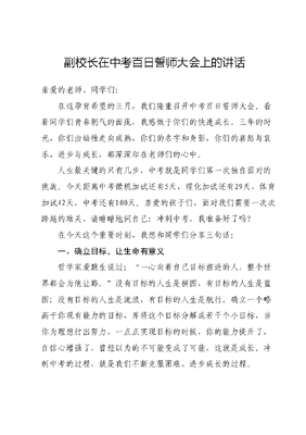 副校长在中考百日誓师大会上的讲话亲爱的老师、同学们:在这孕育希望的三月,我们隆重召开中考百日誓师大会。看着同学们青春朝气的面庞,我感慨于你们的快速成长。三年的时光,你们由幼稚走向成熟,你们的名字和身影,你们的喜怒与哀乐,进步与成长,都深深印在老师们的心中。人生最关键的只有几步,中考就是同学们第一次独自面对的挑战。今天距离中考微机加试还有5天,理化加试还有29天,体育加试42天,中考还有100天。亲爱的孩子们,面对我们需要一次次跨越的难关,请暗暗地问自己:冲刺中考,我准备好了吗?在今天这个重要时刻,我想和同学们分享三句话:一、确立目标,让生命有意义哲学家爱默生说过:一心向着自己目标前进的人,整个世界都会为他让路。没有目标的人生是拼图,有目标的人生是蓝图;没有目标的人生是流浪,有目标的人生是航行。确立一个略高于你现有能力的目标,并将这个目标分解成若干个小目标,当你为理想付出努力,一点点实现目标的时候,你的能力提升了,自信心增强了,曾经以为的不可能变成了可能,这就是成长。冲刺中考的过程,就是我们不断克服困难、进步成长的过程。二、坚持不懈,让梦想成现实不必急功近利、不必追求立竿见影,只要每天能比前一天有一点突破、一点改善,而且朝着正确的目标持续地做下去,就一定能有收获和进步。所有成功的背后,都是苦苦堆积的坚持;所有人前的风光,都是背后傻傻的不放弃。只要你愿意,并为之坚持,总有一天,你会活成自己喜欢的模样!只有熬过无人问津的日子,才能拥抱你的诗和远方。三、坚定信心,为自己赢一回改变自己命运的,从来不是别人,而是自己。只要努力,从来都不晚。种一棵树,最好的时间是十年前,其次就是现在。最初练习微机时,我们只有寥寥几人能得满分,经过两周的训练,有同学从40分练到了满分,这是什么精神?这是相信自己,挑战自己的决心和勇气。只要想学,肯学,一切皆有可能。这一生,一定要为自己赢一次,让自己的人生热辣滚烫。同学们,从现在开始,战胜自己的懒惰和懈怠,排除一切干扰,让每一天都是收获的一天。当理想的学校向你发出橄榄枝的时候,你一定会感谢那个曾经咬牙坚持的自己。在这条路上,你不是孤军奋战,你的老师,你的父母永远在你身后,给你最强大的支持。亲爱的老师们,我们曾携手送走了一批批优秀的毕业生,创造了开十中考一个又一个辉煌。但今年备考形势异常严峻。我们必须以更加团结忘我的拼搏精神,精心备课,上课,高效利用时间,陪伴学生一同冲刺。你鼓励的话语,陪伴的身影,一定会成为学生最难忘的瞬间和前行的动力。冲刺中考的100天,是初中阶段最苦、最累,也是最关键的时期,容不得我们有片刻懈怠!亲爱的孩子们,亲爱的老师们,让我们一起携手并肩,用奋斗成就梦想!