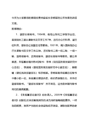 今天为大家推荐的是现任贵州省省长李炳军的公开发表的讲话文章。推荐理由:1.副部长级秘书。1984年,他在山东化工学院毕业后,直接到化工部从事秘书及文字工作7年,历任办公厅科员、副主任科员、部长办公室副主任等职务。1991年,调入国务院办公厅从事秘书及文字工作22年,历任秘书二局一组二秘、一组一秘、副局级秘书、正局级秘书、副部长级秘书等职务。据公开报道,朱镕基总理共有4位秘书:李伟(现任国务院发展研究中心主任)、李剑阁(曾任国务院发展研究中心副主任)、顾朝曦(曾任民政部副部长)和李炳军。李炳军是朱镕基历任秘书中最小的一位,朱镕基总理退休后,他仍然伴随左右,并升任副部级秘书。副部长级秘书并不常见,这也是体制内秘书岗位的最高配置。2.《朱镕基答记者问》总协调人。2009年《朱镕基答记者问》出版后,社会反响极其热烈,成为当时最畅销的图书,一时洛阳纸贵,其所产生的社会效益和经济效益,堪称出版界的奇迹。该书由20余位编辑人员根据音像资料、文字记录整理而成,历时两年,能够取得如此销售佳绩,这个强大的编辑队伍功不可没,而李炳军正是《朱镕基答记者问》的总协调人。他长期跟随朱镕基总理,亲身参与和间接接触过很多高层次、重量级的文稿起草和编辑工作,既增强了其宏观思维和大局掌控能力,也深得朱镕基总理的文风实质——不追求文章的精巧,辞藻的华丽,标题的对仗等形式,只注重务实,管用,能解决问题。3.特殊的省委副书记。2013年,他被任命为江西省副省长;2015年,成为当时江西省最年轻的省委常委,任赣州市委书记;2018年,成为江西省委副书记、赣州市委书记。省委副书记兼任省会城市党委书记的情况比较常见,但是,像以省委副书记的身份兼任地市党委书记的并不多,这也足以见得其超强的工作能力。他担任赣州市委书记后,全面实施跟随朱镕基总理学习到的经济社会管理理念,积极争取到了中央各部委的大力支持,坚持以开展六大攻坚战为主抓手,赣州实现了经济发展逆势上扬,主要经济指标增速连年稳居全省第一方阵,并荣获全国文明城市、国家森林城市、全国社会治安综文可居文库——海量学习资料,手机电脑均可下载www.wenkeju.com合治理优秀市和长安杯等荣誉;赣州作为全国性综合交通枢纽和省域副中心城市加速形成,并进入了城乡面貌变化大、产业发展推进快、经济发展量质齐升、群众获得感明显增强的时期。如今,这位大笔杆转战贵州,前途一片光明,令人期待!目 录2014年1. 在全省镇村联动建设推进会上的讲话…………………………………………12. 在省政府金融办全体干部大会上的讲话………………………………………73. 夯实练兵打仗的战斗堡垒……………………………………………………122015年4. 在市委四届七次全体会议上的讲话:解放思想振兴发展为同步实现全面小康而努力奋斗………………………………………………………………13文可居文库——海量学习资料,手机电脑均可下载www.wenkeju.com5. 关于《中共赣州市委关于制定全市国民经济和社会发展第十三个五年规划的建议》的说明………………………………………………………………296. 写在第23届世界水日、第28届中国水周之际:践行治水新思路保障江西水安全………………………………………………………………387. 讲规矩 守底线 永葆共产党人的政治本色……………………………………408. 着力主攻工业加快振兴发展…………………………………………………422016年9. 在市政协四届六次会议开幕大会上的讲话…………………………………4710. 在市四届人大七次会议闭幕式上的讲话……………………………………51文可居文库——海量学习资料,手机电脑均可下载www.wenkeju.com11. 在中国共产党赣州市第五次代表大会上的报告:打好攻坚战 同步奔小康让赣南老区人民过上富裕幸福的生活………………………………………5512. 在市委五届一次全体会议上的讲话………………………………………7213. 在市政协五届一次会议开幕式上的讲话……………………………………7614. 在市五届人大一次会议闭幕式上的讲话……………………………………802017年15. 将讲政治落实到每一个工作细节……………………………………………8416. 加快赣南苏区振兴发展 让老区人民过上富裕幸福生活……………………8617. 把赣州打造成新时代的红色样板……………………………………………89文可居文库——海量学习资料,手机电脑均可下载www.wenkeju.com18. 攻克深度贫困堡垒 提高脱贫攻坚质量………………………………………932018年19. 在指导学校领导班子民主生活会上的讲话………………………………