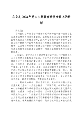 在全县2023年党内主题教育动员会议上的讲话同志们:今天我们召开全县学习贯彻习近平新时代中国特色社会主义思想主题教育动员部署会议,主要任务是以习近平新时代中国特色社会主义思想为指导,深入学习贯彻中央和省委学习贯彻习近平新时代中国特色社会主义思想主题教育动员部署会议精神,认真学习市委学习贯彻习近平新时代中国特色社会主义思想主题教育动员部署会议精神,对我县主题教育进行全面安排部署。4月3日,党中央召开了学习贯彻习近平新时代中国特色社会主义思想主题教育工作会议,习近平总书记发表重要讲话,精辟论述了主题教育的重大意义,系统阐述了主题教育的总要求、目标任务、重点措施,为开展主题教育指明了方向、提供了遵循。4月7日、8日,省委、市委相继召开了学习贯彻习近平新时代中国特色社会主义思想主题教育部署会议。刚才,XX同志宣读了《关于在全县开展学习贯彻习近平新时代中国特色社会主义思想主题教育的实施意见(讨论稿)》,请大家认真学习领会,抓好贯彻落实。下面我讲几点意见。一、提高政治站位,强化思想认识,充分认识开展主题教育重大意义党的二十大报告指出:从现在起,中国共产党的中心任务就是团结带领全国各族人民全面建成社会主义现代化强国、实现第二个百年奋斗目标,以中国式现代化全面推进中华民族伟大复兴。开展学习贯彻习近平新时代中国特色社会主义思想主题教育就是落实习近平新时代中国特色社会主义思想和党的二十大精神的实际行动,是以习近平同志为核心的党中央统揽伟大斗争、伟大工程、伟大事业、伟大梦想作出的战略部署,具有重大而深远的意义。大家要深刻领会重大意义,全面激发深入开展主题教育的责任感和使命感。(一)深刻认识开展主题教育是用新时代中国特色社会主义思想武装全党的迫切需求。政治上的坚定、党性上的坚定,都离不开理论上的坚定。中国共产党之所以能够历经艰难困苦而不断发展壮大,很重要的一个原因就是我们党始终重视思想建党、理论强党,始终把思想理论建设放在党的建设首位。今年是学习贯彻党的二十大精神开局之年,也是庆祝改革开放45周年,在共产党的带领下,新中国取得了举世瞩目的发展成就,但面对十分复杂的国内外环境,俄乌战争、与美国的贸易摩擦,都给我们实现第二个百年目标增加了很大不确定性。在我们实现中华民族伟大复兴,践行中国梦的道路上,如果缺乏理论思维,就难以保持政治上的清醒坚定,也难以战胜各种风险挑战。目前,一些党员干部在理论学习上与现实需求还存在不小差距,有的学习过于追求形式,没有认真学原著悟原理,缺少学深悟透、贯通笃行的定力;有的存在学用脱节的现象,新思想、新理念消化吸收不充分,理论指导实践效果不明显,身体进入了新时代,思想还停留在过去。我们要通过这次主题教育活动,不断加深对习近平新时代中国特色社会主义思想重大意义、科学体系、丰富内涵的理解,增强贯彻落实的自觉性、坚定性。深刻把握贯穿其中的中国共产党人的政治品格、价值追求、精神境界、作风操守。坚持读原著、学原文、悟原理,坚持把自己摆进去、把职责摆进去、把工作摆进去,聚焦解决思想根子问题,自觉对表对标,深刻领悟两个确立的决定性意义,不断增强四个意识,坚定四个自信,坚决做到两个维护。(二)深刻认识开展主题教育是加强基层党的建设的迫切需求。党的十八大以来,以习近平同志为核心的党中央坚定不移全面从严治党。县委也深入贯彻全面从严治党战略部署,抓班子带队伍、强基层打基础、纠四风树正气,营造了风清气正的良好政治生态。但是一些单位还是不同程度地存在着党的领导弱化、党的建设缺失、管党治党不力的问题,有的在贯彻落实中央重大决策部署时,重视程度不够高、行动不够迅速;部分党组织书记还有担当意识不强,培树新典型、新亮点力度不大,党建引领中心工作的互促融合效果不明显等实际问题。我们要通过这次主题教育活动,以加强党的政治建设为抓手,着力夯实基层基础,通过走实走深基层一线,掌握症结所在,切实解决基层党建中长期存在的疑难杂症。同时,主题教育在县级及各领域基层党组织开展,涉及范围广、类型多、数量大,同群众的联系更直接,面对的矛盾问题更复杂,必须充分发动各基层党组织的主动性、积极性,确保每位党员都能深刻领悟主题教育的重大意义,切身感受到开展活动对各项工作的推动作用,以此提升基层党组织的凝聚力和战斗力。(三)深刻认识开展主题教育是保持党同人民群众血肉联系的迫切需求。我们党来自人民、植根人民、服务人民,党的根基在人民、血脉在人民、力量在人民。密切联系群众,贯彻党的群众路线,带领人民创造幸福生活,是中国共产党党的性质和宗旨的体现,是我们党区别于其他政党的显著标志,也是我们党的制胜法宝。近年来,县委始终把人民利益摆在首要位置,以创建全国文明城市、卫生城市,以践行五到四从四多工作法、开展干部下基层·建功在一线为途径,察民情、解民意,有力促进了干部作风转