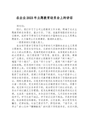 在企业2023年主题教育动员会上的讲话同志们:刚才,我们学习了公司主题教育工作方案,明确了这次主题教育的总体要求、重点任务。下面,我就贯彻落实好本次会议精神,抓好学习贯彻习近平新时代中国特色社会主义思想主题教育,大力推进公司发展建设,强调四点意见:一要要深刻认识重大意义。在全党开展学习贯彻习近平新时代中国特色社会主义思想主题教育,是坚定信仰信念、在新时代坚持和发展中国特色社会主义的必然要求,是推进党的自我革命、永葆党的生机活力的必然要求。我们要按照学思想、强党性、重实践、建新功总要求,切实把开展好主题教育作为拥护两个确立、增强四个意识、坚定四个自信、做到两个维护的具体实践,把思想和行动统一以习近平同志为核心的党中央部署要求上来,切实增强工作的责任感和使命感。近年来,我们认真落实上级决策部署,扎实开展多种形式结合的学习教育,取得了良好效果。党建工作质量不断提升,与生产经营中心工作结合愈加紧密,为推动公司高质量发展提供了坚强的政治保证。同时也要看到,在党支部和党员队伍建设也不同程度地存在着一些问题。党支部党内政治生活制度落实不到位,质量不高;党支部书记业务素质不高,政治理论学习的主动性差,业务水平难以满足工作需要;党员先锋模范作用没有得到充分发挥,尤其是一些新党员,参加活动不积极,几乎没有参加过联组学习;学习态度不端正,学习笔记记录不规范,只是抄写提纲,检查都是临阵磨枪,字迹潦草、应付差事。部分党员作风懈怠、纪律松弛,对自己要求不严,降低标准,差不多、过得去的心态和慵懒散拖的问题不同程度存在。这些问题,我们将通过学习贯彻习近平新时代中国特色社会主义思想主题教育进行解决和完善。二要准确把握标准要求。三年的疫情防控,给我们造成极大的损失,按X情况来说,三年我们至少损失X多万元,至少是一年的收入。2023年是一次重生的机会,是我们再续辉煌的重要契机。对这次主题教育,公司高度重视,成立了主题教育领导小组,负责统筹谋划,组织实施,研究解决主题教育中的重大问题,推进主题教育高质量开展。并设立了领导小组办公室、材料宣传组、督导整改组,各组成员要恪尽职守,强化沟通协调,把开展主题教育摆在突出位置,提高政治站位,增强政治自觉,切实谋划好、组织好、推进好。会后,各部门,尤其是党支部要压紧压实责,依据集团公司《实施方案》,要明确学习要求、学习任务,注重内容、形式、方法,抓牢抓好主题教育。三要突出抓好关键关节。这一次学习贯彻习近平新时代中国特色社会主义思想主题教育,与之前开展过的党史学习教育、不忘初心、牢记使命主题教育、两学一做学习教育等相比,难度更大、要求更严、标准更高。每位班子成员要形成一篇调研报告,还要召开专题民主生活会和组织生活会,还有专项整改整治。应该说,无论是民主生活会批评和自我批评发现的问题,还是上级巡视巡察反馈的问题,以及审计及各类工作检查中发现的问题,各位班子成员结合分管工作,在学习之前、调研之前认真思考目前已经暴露出来的问题,抓住问题本质分析解决,以问题整改成效作为主题教育的成效。X在全局主题教育会上指出要:X。我们要坚决贯彻X要求,立足自身的职能定位和行业特点,做到规定动作不走样,自选动作有新意,在教育的方式方法等方面注重创新,不断丰富主题教育的内容和载体,充分体现主题教育的特色,切实提高学习教育的针对性、实效性和感染力。四要切实转化学习成效。这次主题教育的总要求是学思想、强党性、重实践、建新功,主题教育对于经营部门涉及的可能相对少一些,班子成员要充分履行职责,全程掌握进展情况,进度慢的要推一推,效果不佳的要谈一谈,必要时要靠前指挥、深度参与,把工作抓实、抓深,着力发现和解决各种苗头性、倾向性问题,分管部门开展主题教育的成效也是我们自身履职尽责的工作成效。同时,结合公司面临的发展形势,坚持把开展主题教育同做好生产经营工作和年度目标任务结合起来,带动全体员工统一思想、坚定信心,深入学习贯彻习近平新时代中国特色社会主义思想,持续打造X品牌;着力抓好X;全面提升X水平;不断提高员工X;开拓党建工作新局面;深入推进X问题,圆满完成X下达的目标任务,使公司的经营管理发展水平再上一个新台阶。今天的会议就到这里,散会!