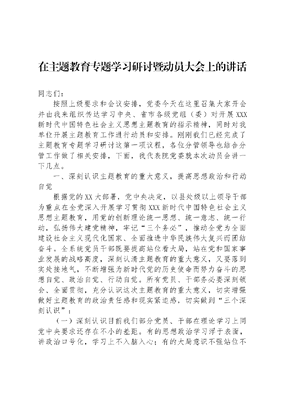 在主题教育专题学习研讨暨动员大会上的讲话同志们:按照上级要求和会议安排,党委今天在这里召集大家开会并由我来组织传达学习中央、省市各级党组(委)对开展XXX新时代中国特色社会主义思想主题教育的指示精神,同时对我单位开展主题教育工作进行动员和安排。刚刚我们已经完成了主题教育专题学习研讨这第一项议程,各位分管领导也结合分管工作做了相关安排,下面,我代表院党委就本次动员会讲一下几点。一、深刻认识主题教育的重大意义,提高思想政治和行动自觉根据党的XX大部署,党中央决定,以县处级以上领导干部为重点在全党深入开展学习贯彻XXX新时代中国特色社会主义思想主题教育,用党的创新理论统一思想、统一意志、统一行动,弘扬伟大建党精神,牢记三个务必,推动全党为全面建设社会主义现代化国家、全面推进中华民族伟大复兴而团结奋斗。全系统党员干部既要提高站位看大局,站在党和国家事业发展的战略高度,深刻认清主题教育的重大意义,又要落到实处接地气,不断增强为新时代党的历史使命而努力奋斗的思想自觉、政治自觉、行动自觉。所有党员、干部务必要深刻领会、全面贯彻,充分认识这次主题教育的重大意义,切实增强做好主题教育的政治责任感和现实紧迫感,切实做到三个深刻认识:(一)深刻认识目前我们部分党员、干部在理论学习上同党中央要求还存在不小的差距。有的思想政治学习浮于表面,讲政治口号化,学习上不入脑入心;有的大局意识不强站位不高;有的履行一岗双责打折扣、散慢拖;有的工作本领不足心态不正方法不当。站在新的历史起点上,全体党员、干部必须以高标准、严要求、踏实的作风自觉参加主题教育,以饱满的热情,迎接新挑战,全面、准确诠释XXX新时代中国特色社会主义思想伟大的真理力量和实践力量。(二)深刻认识全面从严治党永远在路上。XXXXXX强调,我们党面临的四大考验是长期的、复杂的,面临的四种危险是尖锐的、严峻的,党内存在思想不纯、政治不纯、组织不纯、作风不纯等突出问题尚未得到根本解决。开展这次主题教育,就是要我们广大党员、干部认真贯彻新时代党的建设总要求,以披荆斩棘、碰真逗硬的精神,旗帜鲜明地同一切影响党的先进性、弱化党的纯洁性等问题作坚决斗争,推动党的建设全面进步、全面过硬、全面从严。(三)深刻认识本次主题教育的重大意义。XXX新时代中国特色社会主义思想是当代中国马克思主义、二十一世纪马克思主义,是中华文化和中国精神的时代精华,是党和人民实践经验和集体智慧的结晶,是中国特色社会主义理论体系的重要组成部分,是全党全国各族人民为实现中华民族伟大复兴而奋斗的行动指南,必须长期坚持并不断发展。开展主题教育,是推动贯彻党的XX大战略部署的有力举措,是深入推进新时代党的建设新的伟大工程的重大部署,对于贯彻新发展理念、构建新发展格局、推动高质量发展,推进中国式现代化,推进党的自我革命、时刻保持解决大党独有难题的清醒和坚定,始终与人民同心,保持党的先进性和纯洁性,使全党更加紧密地团结在以XXX同志为核心的党中央周围,完成党在新时代新征程的使命任务,具有十分重大的意义。二、准确把握主题教育的目标任务,高质量推进主题教育工作为高质量推进主题教育的各项工作,确保取得预期效果,全体党员、干部务必要高度重视、深刻领会、准确把握,重点做到以下三点:(一)要把总要求贯穿主题教育始终。开展主题教育,总要求是学思想、强党性、重实践、建新功,根本任务是坚持学思用贯通、知信行统一,努力在以学铸魂、以学增智、以学正风、以学促干方面取得实实在在的成效。一要凝心铸魂筑牢根本。全面、系统、深入学习XXX新时代中国特色社会主义思想,真学真懂真信真用,推动学习往深里走、往实里走、往心里走,提高思想觉悟,切实做到筑牢信仰之基、补足精神之钙、把稳思想之舵。二是锤炼品格强化忠诚。深刻领悟两个确立的决定性意义,不断提高政治判断力、政治领悟力、政治执行力,,真心爱党、时刻忧党、坚定护党。三是实干担当促进发展。突出实践导向,真抓实干、务求实效,以时时放心不下的责任感、积极担当作为的精气神为党和人民履好职、尽好责。四是践行宗旨为民造福。坚持一切为了人民、一切依靠人民,把惠民生、暖民心、顺民意的工作做到群众心坎上,不断增强人民群众的获得感、幸福感、安全感。五是廉洁奉公树立新风。严格落实中央八项规定及其实施细则精神,持续纠治四风,坚决反对特权思想和特权现象,做到公正用权、依法用权、为民用权、廉洁用权。(二)要着力解决6个方面的问题。主题教育坚持目标导向和问题导向相统一,着力解决6个方面的突出问题。理论学习方面,主要是学习不走心不深入不系统,用党的创新理论指导实践、解决问题存在差距和不足;政治素质方面,主要是政治判断力、政治领悟力、政治执行力不够强,信仰信念淡化,做选择、搞变通、打折扣、不到位;能力本领方面,主要是新发展理念树得不牢