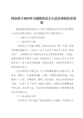国企班子2023年主题教育民主生活会对照检查剖析根据按照市委组织部关于开好主题教育党员领导干部专题民主生活会的通知要求,我代表XX班子作对照检查如下:一、对照六个方面存在的问题(一)理论学习方面一是理论学习质量不够高。能常态化落实第一议题制度但多数时候满足于已学习或已传达的形式上完成规定动作,对XXX新时代中国特色社会主义思想的科学性、系统性、战略性研究得不够深入透彻。特别是过去一年业务工作千头万绪班子每个人肩上的责任都很重、任务也更多,自觉用于钻研学习的时间相对较少。二是学用结合不够扎实。学习多是围绕重点内容集中学,通读多、精读少,未能做到完整、准确、全面领会精神内涵,未能做到入心入脑、真懂真用。同时,结合实际、结合工作的思考还不够,务虚与务实未能充分融合,未能真正把握蕴含其中的立场、观点和方法,并活学活用到谋划推动公司高质量发展等工作实践中去。(二)政治素质方面一是在践行两个确立的实践要求上有差距。领导班子对如何把握好两个确立思想理论的抽象性和实际行动的实践性上,缺少全面深入的思考;对如何将党的创新理论融入到贯彻党的路线方针政策和工作部署之中,贯穿于推动和加快XX建设和整合全过程之中,方法还不够多,措施还不够实,结合得还不够好政治态度与实际行动未能达到高度的统一性和一致性。二是政治视野还不够开阔。领导班子虽然能够自觉站在全局高度思考问题,但在吃透中央精神,准确把握中央和集团工作节奏上还不够及时到位。在作决策、抓工作时更多立足于本公司实际,未能很好融入集团高质量发展大局思考、谋划3-5年的长远工作,政治视野不够宽、大局意识不够强。(三)能力本领方面一是贯彻新理念推动高质量发展还有差距。面对新形势新挑战,贯彻新发展理念、融入新发展格局还不够。意识上已跟上,行动上还慢一步。特别是吸收新思想新知识,借鉴新经验还不够深入,一定程度上存在挂高质量的名、做老一套的事的两张皮现象,对于如何突破目前XXX存在的诸多瓶颈,新思路新举措不够多。二是服务和指导基层的热情和力度有待提高。领导班子在推进各项工作时与部门负责人联系比较密切,与基层员工群众沟通不多、对基层工作指导不够,关心关爱基层一线员工的热情有待加强。(四)担当作为方面一是忧患意识、底线思维还有所欠缺。对一些工作中的风险问题考虑得不够充分,没能完全对照凡事从最坏处着眼、作最充分准备、向最好处努力、争取最好结果的要求谋划和推进工作,XX合规化手续还存在缺陷;另隐患大排查发现的问题,特别是XX问题尚有较多未完成整治;内部管理的规范性和效率问题还比较突出。二是对新形势下的斗争形式研究还不够足。对于公司一些干部员工工作干劲不够强、斗争锐气不够足、工作存在形式主义等问题,没有结合公司实际因地制宜进行分析研判,与躺平佛系思想作斗争的方式方法和力度还需要进一步提升。(五)工作作风方面一是未能充分带动各级积极性。在贯彻落实上级各项工作要求存在中梗阻现象,导致向下宣贯及工作推动不够顺畅,基层干部在实际工作中较少进行深入思考,更多停留在完成上级规定动作,围绕扬长补短、挖掘亮点的创新动作较少,创先争优劲头不足。二是基层党组织建设还需进一步夯实。领导班子成员日常多把精力放在谋划抓实基层业务工作,对党建工作的督促指导力度还不够,与先进单位对标学习、推动党支部建设创新提质的成效不够明显,个别党支部在推动党业融合、发挥两个作用方面不够到位,党员自我要求不够高,工作上满足于过得去,先锋模范作用发挥得不充分。(六)廉洁自律方面一是党内政治生活质量有待提高。能够严格按照要求开展党内政治生活,但班子成员之间工作碰头、谈具体事务的情况多,敞开心扉谈思想、讲问题的时间少。个别党支部在落实全面从严治党主体责任方面,自觉性、主动性、积极性不强,仍存在听口令、做动作的心理。二是抓早抓小抓常不够到位。作风建设的工作力度还需进一步加强。个别监督主体仍然存在责任意识不强、主动作为积极性不高、发现问题敏锐性不强等短板,导致出现了个别领导干部违法违纪事件,对八小时以外监督管理力度还需加强。二、原因剖析(一)理论武装不够全面。对理论学习的要求还不够高,存在一定程度上的实用主义思想,缺少强烈的学习意识,学习存在碎片化和零散性,未能开展系统地学习、从内心深处透彻地领悟XXX新时代中国特色社会主义思想的本质要求和理论精髓,导致在用新思想武装头脑、指导实践上不扎实、不全面。(二)政治素养不够深厚。对符合当前中国国情的创新性治国理政学说认识不够深刻、思考不够全面,对其中所蕴含的时代性、历史性、规律性理解吸收不够充分,未能及时把握历史方位和实践基础发生的深刻变化,思想和行动有时跟不上新形势、新要求,观察事物、思考问题、研判形势、指导实践习惯传统理念和固有思维方式,缺乏创新突破和执着进取