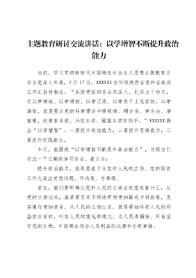 主题教育研讨交流讲话:以学增智不断提升政治能力当前,学习贯彻新时代中国特色社会主义思想主题教育正在全党深入开展,5月17日,XXXXXX在听取陕西省委和省政府工作汇报时指出:各级党组织务必在深入、扎实上下功夫,在以学铸魂、以学增智、以学正风、以学促干上见实效。以学增智,就是要从党的科学理论中悟规律、明方向、学方法、增智慧,把看家本领、兴党本领、强国本领学到手。XXXXXX提出以学增智,一要提升政治能力,二要提升思维能力,三要提升实践能力。今天,我围绕以学增智不断提升政治能力,与同志们交流一下近期的学习体会。我认为:提升政治能力,就是要善于从党和人民的立场、党和国家工作大局出发想问题、作决策、办事情。首先,我们要明确从党和人民的立场出发意味着什么。从党的立场出发,就是要坚定不移地贯彻党的路线方针政策,忠实履行党的使命。从人民的立场出发,就是要始终把人民的利益放在首位,听取人民的意见和建议,为人民谋福祉。只有坚守党的立场,才能做出符合人民利益的决策和办好事情。其次,我们要站在党和国家工作大局的高度思考问题。我们做决策、干工作、办事情要始终心怀大局,善于把握全局,抓住主要矛盾和矛盾的主要方面。我们要关注全面建设社会主义现代化国家的总体目标,以及当前的国内外形势和矛盾问题,提出符合实际、具有实际意义的问题和解决方案。同时,我们还要深入调研,充分了解所涉问题的细节和背景,避免片面和主观臆断。再次,我们要始终坚持问题导向作决策。在决策前,要敢于直面问题,找准症结,客观全面地评估各种因素的利弊和影响。我们要充分听取各方面的意见和建议,进行充分的专业分析和研究,依法依规进行决策,并及时向上级汇报。决策过程中,我们要注重实效,注重解决实际问题,确保决策的科学性、合理性和可操作性。最后,我们要始终以人民为中心办事情。无论做任何工作,都要始终把人民的利益放在首位,真正为人民办实事、解难事、暖民心。我们要注重服务意识,积极回应人民的需求和关切,及时解决人民的困难和问题。同时,我们还要加强组织协调,形成合力,确保各项事务的顺利进行。善于从党和人民的立场、党和国家工作大局出发思考问题、作决策、办事情,是我们作为一名无产阶级的接班人和党员干部的职责所在。只有坚定信念,明确目标,充分了解人民所想所思所盼,才能把工作做到人民群众的心坎里,以实际行动践行党的宗旨。提升政治能力,就是要善于从繁杂问题中把握事物的规律性、从苗头问题中发现事物的趋势性、从偶然问题中认识事物的必然性。想要从繁杂问题中把握事物的规律性,从苗头问题中发现事物的趋势性,从偶然问题中认识事物的必然性,就需要我们在工作中培养一种全面、深入的思维方式,通过不断的观察、分析和总结,逐渐掌握事物发展的规律和趋势。首先,要学会分类并层次化处理问题。在面对复杂的问题时,我们可以将其分解为若干个小问题,然后逐一解决。通过对每个小问题的分析,我们可以发现其中存在的一些共同规律,从而推导出事物的一般规律。例如,在研究社会经济问题时,我们可以将其分解为人口、产业、环境等方面进行分析,然后通过比较不同地区、不同时间段的数据,找出其中的规律性变化。其次,要善于从苗头问题中发现事物的趋势性。要做到这一点,需要我们始终保持对局势变化的敏感性。苗头问题往往是事物发展的早期信号,对其进行及时观察和分析,可以揭示事物发展的趋势和方向。例如,在经济领域,通货膨胀率的提高可能是一个经济问题的苗头,如果我们能够通过观察和分析,预测出通货膨胀的趋势,就能够及时采取相应的应对措施。最后,要善于从偶然问题中认识事物的必然性。这需要我们具备一定的历史和理论知识。偶然问题往往是在特定条件下产生的结果,并不具有普遍性。但,通过研究偶然问题,我们可以发现其中隐藏的规律和机制,从而更好地理解事物的必然性。例如,在自然科学领域,一个实验中的偶然结果可能是由于某种未知的因素或者操作失误导致的,但通过多次实验和理论分析,我们可以发现其中存在的固定因果关系。要善于从繁杂问题中把握事物的规律性、从苗头问题中发现事物的趋势性、从偶然问题中认识事物的必然性,需要具备较强的观察力、分析力和综合能力。我们只有不断提升自身的思维能力,才能够更好地理解和把握事物的本质。提升政治能力,就是要善于驾驭复杂局面、凝聚社会力量、防范政治风险,切实担负好党和人民赋予的政治责任,真正成为政治上的明白人。在一个充满复杂局面、各类风险挑战交织并存的现代社会中,如何成为政治上的明白人,善于驾驭复杂局面、凝聚社会力量、防范政治风险,是我们党政机关每名公职人员都应该认真、反复思考的问题。对这一点,我的体会是:成为政治上的明白人,首先要具备宽广的知识和深度的思考能力。作为一名国家公职人员我们要注重不断充实自己的知识储备,了解国内外的政治形势、经济发展、社会变化等各个方面的信息。只有深
