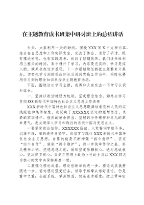 在主题教育读书班集中研讨班上的总结讲话今天,大家利用一天的时间,围绕XXX等X个方面内容,结合各自思想和工作实际发言,交流了体会,进行了研讨,既有理论研究,也有实践思考,收到了预期效果。我们读书班利用三整天的时间,集中进行了学习,内容是充实的、学习是深入的,效果也在逐步显现。下一步要继续坚持把主题教育开展好,切实把学习到的理论知识运用到实践工作当中,同时也要用学习到的理论知识来指导主题教育活动。下面,围绕这次学习主题,我再和大家交流一下学习认识和体会。一、坚持以政治建设为统领,坚定理念信念,始终在学习贯彻XXX新时代中国特色社会主义思想上作表率XXX新时代中国特色社会主义思想既凝结着党和人民的实践经验和集体智慧,也反映了XXXXXX坚定的理想信念、真挚的家国情怀、强烈的使命担当、坚韧的斗争精神和非凡的革命勇气,是必须深入学习和践行的当代中国马克思主义。一要坚定政治信仰。XXXXXX指出,入党誓词字数不多,记住不难,难的是终身坚守。我们学习践行XXX新时代中国特色社会主义思想,首要的就是不断增强四个意识、坚定四个自信、做到两个维护,进一步筑牢信仰之基、补足精神之钙、把稳思想之舵,做到坚定信赖核心,绝对忠诚核心,坚决捍卫核心,自觉在思想上政治上行动上与以XXX同志为核心的党中央保持高度一致。二要强化理论武装。理论创新每前进一步,理论武装就要跟进一步。面对理论强党任务,领导干部带头学好理论,仍是重中之重;全面系统、学深悟透,仍是基本要求;防止零碎空洞地学,仍是克服形式主义的重要内容。我们要将本次主题教育作为学习践行XXX新时代中国特色社会主义思想的重要抓手,围绕主题主线,多补补理论课,多结合实际思考些问题,力求跟上理论强党步伐。三要知信行相统一。学习的目的在于运用。要坚定不移用XXXXXX的思想伟力指导新时代XX现代化实践,聚焦十个新目标,全力走好六条路径,推进五个转型,努力实现新时代XXX全面振兴全方位振兴,以实绩实效体现政治忠诚和政治担当。二、坚持以人民为中心,增强宗旨意识,始终在一心为民服务群众上作表率我们党为人民而生,因人民而兴,根基在人民、血脉在人民、力量在人民。XXXXXX强调,牢记初心和使命,必须坚持一心为民。我们要始终把人民放在心中最高的位置,牢记责任重于泰山,时刻把人民群众的安危冷暖放在心上。一要践行群众路线。要树牢群众观点,把人民群众满意不满意、赞成不赞成作为衡量工作成效得失的标尺,始终站在群众立场上想问题、做决策、干工作,自觉把以人民为中心的要求贯穿到工作始终,做到心里装着群众、感情贴近群众,从思想深处与群众建立深厚的感情,真正做到怀为民之心、思富民之策、兴乐民之举。二要关心群众疾苦。要进一步密切联系群众,及时化解矛盾问题,千方百计为群众排忧解难,聚焦就业、教育、医疗、养老、食品药品安全等方面存在的突出问题,聚焦群众身边的涉黑涉恶问题,聚焦棚改回迁问题,聚焦公共服务水平不高等问题,全力解民忧、化民怨、纾民困。各级党员领导干部要拿出更多时间和精力到一线开展调研,深入群众,到问题多、矛盾多的地方去,设身处地了解群众所需所盼,紧扣民情民意调整工作重心,积极稳妥化解百姓难点堵点痛点。三要办好民生实事。当前,群众就业难、看病难、养老难等问题依然没有得到根本解决,改革发展所带来的获得感、幸福感和安全感仍需加强。我们必须坚持问题导向,针对民生短板确定问题清单,精心制定民生行动计划,明确时间表和路线图,一件接着一件办,一年接着一年干,切实解决好群众牵肠挂肚的热点难点问题。特别是要结合当前的重点工作,围绕推动乡村振兴、重塑营商环境等工作持续发力,有所作为、办好实事,以实际成果检验主题教育的实际成效。三、坚持以转型发展为主线,扛起时代担当,始终在奋勇争先真抓实干上作表率XXXXXX强调,要牢记我们党肩负的实现中华民族伟大复兴的历史使命,勇于担当负责、积极主动作为。具体到XX,就是要把加快转型推动经济高质量发展、实现全面振兴全方位振兴大业作为践行XX的具体实践,切实把读书班学习研讨成果转化为做好今后工作的具体行动,争做解放思想、攻坚克难、务实作为的表率。一要在解放思想上走在前列。在新的伟大时代,我们要走出一条质量更高、效益更好、结构更优、优势充分释放的高质量发展之路,就必须把思想观念转型作为城市转型发展的当头炮。要以XXX新时代中国特色社会主义思想为指导,立足实际,把解放思想推动高质量发展大讨论与主题教育结合起来,在谋划地区改革发展思路上下功夫,在解决突出矛盾问题上下功夫,在激发基层改革创新活力上下功夫,主动适应变化、不断完善思路、积极调整状态,敢于探索、勇闯新路,创造性地抓好各项工作。二要在攻坚克难中激流勇进。当前,正处于爬坡过坎、滚石上山的关键阶段,我们要坚定信心决心,勇于思变求变,聚力六个