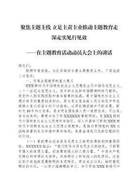 聚焦主题主线 立足主责主业推动主题教育走深走实见行见效——在主题教育活动动员大会上的讲话同志们:按照市委安排,为扎实做好全委主题教育工作,下面我讲三点意见:一、开展主题教育的重大意义XXX新时代中国特色社会主义思想是当代中国马克思主义、二十一世纪马克思主义,是中华文化和中国精神的时代精华,是党和人民实践经验和集体智慧的结晶,是中国特色社会主义理论体系的重要组成部分,是全党全国各族人民为实现中华民族伟大复兴而奋斗的行动指南,必须长期坚持并不断发展。新时代10年伟大变革,是全党全国各族人民一道拼出来、干出来、奋斗出来的,最根本在于有XXXXXX掌舵领航,有XXX新时代中国特色社会主义思想科学指引。深入开展学习贯彻XXX新时代中国特色社会主义思想主题教育,是推动贯彻党的XX大战略部署的有力举措和具体体现,也是奋进现代化新征程的实际行动。(一)重视理论武装是马克思主义政党取得胜利的重要经验。XXXXXX指出:我们党作为马克思主义执政党,不但要有强大的真理力量,而且要有强大的人格力量。中国共产党坚持以科学理论为指导,保持理论上和实践上的先进性,这是区别于其他政党最鲜明的本质特征。党自成立以来,始终重视理论的作用,一以贯之强调理论学习。学习贯彻XXX新时代中国特色社会主义思想主题教育,对全党既是一次大学习大动员,更是一次大体检大改进。开展学习贯彻XXX新时代中国特色社会主义思想主题教育,坚持不懈用XXX新时代中国特色社会主义思想凝心铸魂,切实加强党的思想建设,对于推动全党更加深刻领悟两个确立的决定性意义,更加自觉增强四个意识、坚定四个自信、做到两个维护,始终在思想上政治上行动上同以XXX同志为核心的党中央保持高度一致,具有十分重大的意义。(二)完成新时代新征程使命任务需要党的创新理论指导和武装。随着第一个百年奋斗目标的完成,从现在起,中国共产党的中心任务就是团结带领全国各族人民全面建成社会主义现代化强国、实现第二个百年奋斗目标,以中国式现代化全面推进中华民族伟大复兴。根据我们党的成功经验,要顺利完成新征程的使命任务,就必须用作为马克思主义中国化时代化的最新成果的XXX新时代中国特色社会主义思想来武装全党,有必要开展学习贯彻XXX新时代中国特色社会主义思想主题教育。作为政治性组织的活动,党内的学习是为了应用,党内的教育是为了实践,因此,每次开展主题教育,我们党既重视理论学习,又重视实践转化。通过系统化理论学习,推动全体党员和干部理论水平上一个台阶,通过针对性实践转化,使马克思主义中国化时代化的成果不断转化为党员干部的行动力量,并集中解决党内某一方面重点问题。(三)主题教育是把XXX新时代中国特色社会主义思想转化为强大力量的重要手段。党的XX大描绘了全面建设社会主义现代化国家、全面推进中华民族伟大复兴的宏伟蓝图。开展主题教育,是推动贯彻党的XX大战略部署的有力举措,是深入推进新时代党的建设新的伟大工程的重大部署,对于贯彻新发展理念、构建新发展格局、推动高质量发展,推进中国式现代化,推进党的自我革命、时刻保持解决大党独有难题的清醒和坚定,始终与人民同心,保持党的先进性和纯洁性,使全党更加紧密地团结在以XXX同志为核心的党中央周围,完成党在新时代新征程的使命任务,具有十分重大的意义。二、扎实做好主题教育的各项规定动作本次主题教育总要求是学思想、强党性、重实践、建新功,根本任务是坚持学思用贯通、知信行统一,把XXX新时代中国特色社会主义思想转化为坚定理想、锤炼党性和指导实践、推动工作的强大力量,使全党始终保持统一的思想、坚定的意志、协调的行动、强大的战斗力,努力在以学铸魂、以学增智、以学正风、以学促干方面取得实实在在的成效。要按照中央、省委、市委的统一部署,准确把握开展第二批主题教育的总体要求、重点任务,一体推进理论学习、调查研究、推动发展、检视整改、建章立制等工作,将主题教育与实现高质量发展和现代化建设互促并进,与三个年活动、推动当前重点工作任务紧密结合。一是坚持读原著学原文悟原理。市委要求通过举办读书班来深入学习相关理论,通过学习,要切实把这一思想的世界观、方法论和贯穿其中的立场观点方法转化为自己的思想武器,内化于心、外化于行,自觉用党的创新理论武装头脑、指导实践、推动工作。县级领导要把举办读书班作为加强理论武装的重要方式,认真研读指定书目,深刻领会XXX新时代中国特色社会主义思想的丰富内涵、核心要义、实践要求,把学习成果转化为解决问题、推动工作的实效。各支部要通过三会一课、主题党日等形式加强学习,确保学有所获。二是重点做好调查研究。结合前段时间的调研,对照确立的调研课题,进行回头看,看问题把握的准不准,措施提供的实不实,问题解决的有没有成效。要结合主题教育,对照自己本职工作,查找工作短板