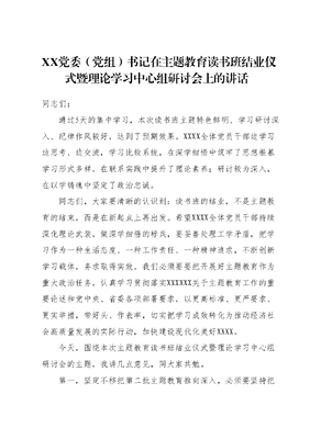 XX党委(党组)书记在主题教育读书班结业仪式暨理论学习中心组研讨会上的讲话同志们;通过5天的集中学习,本次读书班主题特色鲜明、学习研讨深入、纪律作风较好,达到了预期效果。XXXX全体党员干部边学习边思考、边交流,学习比较系统,在深学细悟中筑牢了思想根基学习形式多样,在联系实践中提升了理论素养;研讨较为深入,在以学铸魂中坚定了政治忠诚。同志们,大家要清晰的认识到:读书班的结业,不是主题教育的结束,而是在新起点上再出发。希望XXXX全体党员干部持续深化理论武装,做深学细悟的标兵,要妥善处理工学矛盾,把学习作为一种生活态度、一种工作责任、一种精神追求,不断创新学习载体,务求取得实效。我们必须要要把开展好主题教育作为重大政治任务,认真学习贯彻落实XXXXXX关于主题教育工作的重要论述和党中央、省委各项部署要求,以更高标准、更严要求、更实举措,带好头、作表率,切实把学习成效转化为推动经济社会高质量发展的实际行动,加快建设现代化美好XXXX。今天,围绕本次主题教育读书班结业仪式暨理论学习中心组研讨会的主题,我讲几点意见,同大家共勉。第一,坚定不移把第二批主题教育推向深入,必须要坚持把讲政治、顾大局摆在首要位置。习XXX作为全党核心、大国领袖、军队统帅,具有高瞻远瞩、运筹帷幄的远见卓识,心忧国家、情系人民的高尚情怀,以身许党、无私无畏的人格魅力,是当之无愧的带领全党全国人民实现初心的领路人。我们要全面学习领会XXX新时代中国特色社会主义思想的科学体系、精神实质、核心要义和实践要求,深刻把握这一思想的世界观、方法论和贯穿其中的立场观点方法,做到对党的创新理论入心见行、善思善用。坚持全面学、专题学、重点学一体推进,切实在深化、内化、转化上下功夫,真正把理论学精透,把本领学到手。更加坚定理想信念,铸牢对党忠诚,站稳人民立场,不断提升政治能力、思维能力、实践能力。我们要深刻领会两个确立的决定性意义,增强四个意识、坚定四个自信、做到两个维护,坚定不移地用XXX新时代中国特色社会主义思想武装头脑、指导实践、推动工作,切实把做到两个维护具体体现在贯彻落实具体工作上来。始终坚持在党言党、在党忧党、在党为党,把爱党、忧党、兴党、护党落实到工作生活各个环节,听党的话,跟党走。第二,坚定不移把第二批主题教育推向深入,必须要始终坚持以人民为中心的发展思想。为中国人民谋幸福,为中华民族谋复兴,是中国共产党人的初心和使命,是激励一代代中国共产党人前赴后继、英勇奋斗的根本动力。我们要坚持把人民群众的小事当作自己的大事,从人民群众关心的事情做起,从让人民群众满意的事情做起,带领人民不断创造美好生活,这充分彰显着以XXX同志为核心的党中央深厚的为民情怀。人民群众是我们党力量的源泉,推动第二批主题教育高质量走深走实,就是要树立群众观点,站稳群众立场,践行以人民为中心的发展思想,组织领导干部沉到一线查堵点、破难题,摸清社情民意,解决实际问题心贴心感知群众冷暖,手握手破解群众难题,真正做到一切为了群众、为了群众一切,用初心温暖民心,用实际行动夯实党的执政根基。第三,坚定不移把第二批主题教育推向深入,必须要大力推动干事创业。开展XXX活动,引导党员、干部在推动发展、基层治理、服务群众中主动作为、担当有为。紧扣中心工作和重点任务,结合不同类型党员特点,通过设立党员示范岗、党员责任区、组建党员突击队等形式,组织党员在重点项目、重大任务中立足岗位、发挥作用、创先争优。激励党员在急难险重中担当作为,建立完善应急动员发挥作用机制,动员广大党员在完成重大任务、抗击自然灾害、应对突发事件等关键时刻挑重担、当先锋打头阵。丰富党员服务群众、奉献社会的内容和载体,建立党员志愿者服务站点,推动在职党员到社区服务群众,广泛开展帮扶困难家庭、扶助留守儿童、照顾孤寡老人等党员志愿活动,组织党员根据自身实际为群众办实事做好事。结合日常工作开展各种形式建言献策活动,深入群众听民意、访民情,提出改进工作的办法措施。严格规范和管理党员网络言行,组织引导广大党员在网络空间充分发挥先锋模范作用,守好阵地、把好关口。开展学习身边榜样活动,大力选树宣传一批担当作为的先进典型树立可信可学的榜样标杆。第四,坚定不移把第二批主题教育推向深入,必须要深入推进全面从严治党。要教育引导党员领导干部认真开展党性分析,对标党风要求找差距、对表党性要求查根源、对照党纪要求明举措。对照XXXXXX关于以学铸魂、以学增智、以学正风、以学促干的12条具体要求,结合反面典型案例解剖式调研,把自己摆进去、把职责摆进去、把工作摆进去,特别是对形式主义、官僚主义深刻检视剖析、深挖思想根源、深入整改落实。要坚守纪律底线,从严落实中央八项规定《实施细则》、省委《实施办法》主动净化自己的生活圈、交际圈、朋友圈,切