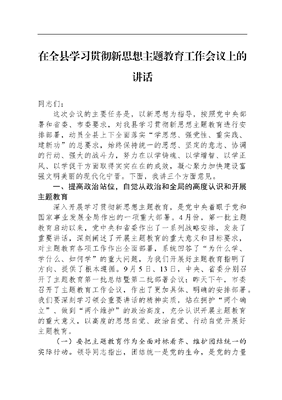 在全县学习贯彻新思想主题教育工作会议上的讲话同志们:这次会议的主要任务是,以新思想为指导,按照党中央部署和省委、市委要求,对我县学习贯彻新思想主题教育进行安排部署,动员全县上下全面落实学思想、强党性、重实践、建新功的总要求,始终保持统一的思想、坚定的意志、协调的行动、强大的战斗力,努力在以学铸魂、以学增智、以学正风、以学促干方面取得实实在在的成效,凝心聚力加快建设富强文明美丽的现代化宁晋。下面,我讲三个方面意见。一、提高政治站位,自觉从政治和全局的高度认识和开展主题教育深入开展学习贯彻新思想主题教育,是党中央着眼于党和国家事业发展全局作出的一项重大部署。4月份,第一批主题教育启动以来,党中央和省委作出了一系列战略安排,发表了重要讲话,深刻阐述了开展主题教育的重大意义和目标要求,对主题教育各项工作作出全面部署,系统回答了为什么学、学什么、如何学的重大问题,为我们开展好主题教育指明了方向、提供了根本遵循。9月5日、13日,中央、省委分别召开了主题教育第一批总结暨第二批部署会议;昨天下午,市委召开了主题教育工作会议,作出了更加具体、明确的安排部署。我们要深刻学习领会重要讲话的精神实质,站在拥护两个确立、做到两个维护的政治高度,充分认识开展主题教育的重大意义,以高度的思想自觉、政治自觉、行动自觉开展好主题教育。(一)要把主题教育作为全面对标看齐、维护团结统一的实际行动。领导同志指出,团结统一是党的生命,是党的力量所在;实现全党思想、意志、行动的统一,最根本的就是用党的基本理论武装全党。新思想,是当代中国马克思主义、二十一世纪马克思主义,是中华文化和中国精神的时代精华,实现了马克思主义中国化时代化新的飞跃。理论创新每前进一步、理论武装就要跟进一步。要通过开展这次主题教育,引导全县各级党组织和广大党员干部从思想上正本清源、固本培元,不断筑牢信仰之基、补足精神之钙、把稳思想之舵,坚定不移沿着指引的方向前进。(二)要把主题教育作为加快宁晋发展、实现富民强县的关键之举。领导同志指出,高质量发展是全面建设社会主义现代化国家的首要任务,是推进中国式现代化的本质要求。近年来,特别是换届以来,县委坚持以抓发展、惠民生、守底线为工作主线,团结带领全县广大干部群众担当实干、攻坚克难,全县呈现出经济运行稳中向好、城乡面貌明显改善、民生福祉不断提高、社会大局和谐稳定的良好局面。比如,(1)(2)工作成绩,等等。要通过开展这次主题教育,引导广大党员干部深入学习新发展理念,不断提高推动高质量发展本领、服务群众本领、防范化解风险本领,加快解决突出问题、破解发展难题,着力补短板、强弱项、扬优势,推动宁晋高质量发展取得新成效。(三)要把主题教育作为转变干部作风、提升工作效能的重要抓手。领导同志强调,我们党百年奋斗的伟大成就都是党团结带领全国各族人民拼出来、干出来的。要把党的XX大描绘的宏伟蓝图变成现实,仍然要靠拼、要靠干。近两年,我们持续深化强纪律、转作风、提效能活动,大力实施党员干部、教师队伍、医务人员、企业家四个能力素质提升工程,举办大讲堂、开展擂台赛,各级干部思想作风有了大的转变,干事创业的精气神有了明显提升,但面对新的形势和任务要求,还有一些不相适应的地方,还存在一些问题。比如,.。要通过这次主题教育,进一步提振干部精神状态、提高工作效能、提升工作规范化水平,扎实推动中央和省、市、县委各项决策部署落地见效,奋力推动全县各项事业发展迈上新台阶。(四)要把主题教育作为全面从严治党、深化自我革命的必然要求。领导同志反复强调,全面从严治党永远在路上,党的自我革命永远在路上。近年来,县委坚决扛起管党治党政治责任,认真落实新时代党的建设总要求,以刀刃向内的自我革命精神,推动全面从严治党不断向纵深发展。但是也要清醒看到,有的基层党组织政治功能和组织功能不强,党建引领基层治理作用发挥还不充分;有的四风问题不时抬头,重点领域问题尚未得到根治,尤其是省委巡视反馈的一些问题更让我们警醒。这充分说明党风廉政建设形势依然严峻复杂,遏制增量、清除存量的任务依然艰巨。要通过这次主题教育,引导各级党组织和广大党员干部突出问题导向,查不足、找差距、明方向,接受政治体检,纠正行为偏差,把严的基调、严的措施、严的氛围长期坚持下去,不断把全面从严治党引向深入。二、抓实重点措施,确保主题教育取得扎实成效这次主题教育不划阶段、不分环节,要把理论学习、调查研究、推动发展、检视整改、建章立制贯通起来、贯穿始终,有机融合、一体推进,切实在全县来一次理论大学习、思想大武装、能力大提升、作风大改进、工作大落实。(一)做深做实理论学习,做到学深悟透、知行合一。牢牢把握深入学习贯彻新思想这一主题主线,将学思想作为首要任务贯穿始终,从中悟规律、明方向、学方法、增智慧。要真学。