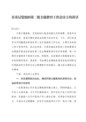在基层党组织第二批主题教育工作会议上的讲话同志们:开展主题教育,是党的XX大做出的重大决策部署,是党中央统揽全局、适逢关键时期发出的重大政治号召。今天,我们在这里召开XX镇基层党组织第二批主题教育工作会议,主要任务是深入学习贯彻中央、自治区党委、市委和城区党委的工作部署要求对我镇开展基层党组织第二批主题教育进行动员和部署,进一步调动全镇党员干部的主动性、积极性,扎实推进主题教育各项工作在XX镇开展好、落实好。等会城区主题教育指导组组长XX同志还将就如何开展好这次主题教育作具体指导,请大家认真领会会议精神。下面,我先讲三点意见。一、切实提高政治站位,增强开展主题教育的思想自觉、政治自觉和行动自觉一是要深刻认识开展主题教育的重大意义。XXXXXX指出,为中国人民谋幸福,为中华民族谋复兴,是中国共产党人的初心和使命,是激励一代代中国共产党人前赴后继、英勇奋斗的根本动力。开展这次主题教育,是党中央统揽伟大斗争、伟大工程、伟大事业、伟大梦想作出的重大部署,对统筹推进五位一体总体布局、协调推进四个全面战略布局,决胜全面建成小康社会、夺取新时代中国特色社会主义伟大胜利、实现中华民族伟大复兴的中国梦,具有重大而深远的意义。我们要深刻认识到:开展这次主题教育,是用新时代中国特色社会主义思想武装全党的迫切需要,是推进新时代党的建设的迫切需要,是保持党同人民群众血肉联系的迫切需要,是实现党的XX大确定的目标任务的迫切需要。二是要把思想统一到中央、自治区党委、市委和城区党委的决策部署上来。党中央部署开展主题教育,为我们不断进行自我革命,在斗争和考验中锤炼忠诚干净担当的政治品格,提供了难得机遇和治本良方。开展主题教育是深入学习贯彻XXX新时代中国特色社会主义思想、更好运用科学理论武装头脑的重大部署,是贯彻落实新时代党的建设总要求、夺取新时代全面从严治党更大战略性成果的重大举措,是深入践行党的群众路线、保持党同人民群众血肉联系的重大实践,是激励全区党员干部新时代新担当新作为、加快建设XX共圆复兴梦想的重大机遇。在全市基层党组织第二批主题教育工作会议上,自治区党委常委、市委XX号召全市各级党组织和广大党员干部深刻领会XXXXXX的重要讲话精神,把思想和行动统一到中央和自治区党委的决策部署上来,进一步解放思想、改革创新、扩大开放、担当实干,自觉践行四为理念,真抓实干、善作善成、造福于民,在守初心、担使命、找差距、抓落实上取得实实在在的成效,在全面落实强首府战略、推动XX高质量发展中作出新的更大贡献。9月16日,在城区基层党组织第二批主题教育工作会议上,城区党委书记XX号召城区各级党员干部要以XXX新时代中国特色社会主义思想为指导,按照中央、自治区党委、市委和城区党委的安排部署,扎扎实实开展好这次主题教育,努力实现理论学习有收获、思想政治受洗礼、干事创业敢担当、为民服务解难题、清正廉洁作表率的目标,奋力谱写新时代XX发展新篇章,为建设XX、共圆复兴梦想贡献XX力量。近年来,我们先后开展干部作风提升年、深化干部作风建设年等活动,取得了一定成效,但我们也要清醒地看到,对照党的初心使命要求我们仍有很大差距,比如:一些党员干部在理论学习上同党中央要求相比还存在不小的差距;党内四风问题依然存在,形式主义、官僚主义问题依然突出;为民服务不实在、不上心、不尽力,脱离群众;干事创业精神不振、担当劲头不够等问题。开展基层党组织第二批主题教育就是要求全镇广大党员干部一定要提高政治站位,切实把思想和行动统一到XXXXXX重要讲话精神上来,统一到中央、自治区党委、市委和城区党委的决策部署上来,以此次主题教育为契机,进一步加强理论武装,全面推进从严治党,树牢全心全意为人民服务的宗旨意识,弘扬革命传统和优良作风,唤起初心、激起斗志,顺应群众愿望、回应群众关切,主动担当作为、积极干事创业,以时不我待的精神状态扎实做好各项工作,为建设XX、共圆复兴梦想贡献XX力量。二、准确把握目标要求,深入推进主题教育有序开展这次主题教育的总体要求是十二字:学思想、强党性、重实践、建新功。根本任务是:深入学习贯彻XXX新时代中国特色社会主义思想、锤炼忠诚干净担当的政治品格、团结带领全国各族人民为实现伟大梦想共同奋斗。具体目标是五句话:理论学习有收获;思想政治受洗礼;干事创业敢担当;为民服务解难题;清正廉洁作表率。重点措施是四项:学习教育、调查研究、检视问题、整改落实。我们要把握总要求,聚焦根本任务,紧扣具体目标,强化重点措施,压紧压实责任,加强统筹谋划,实现规定动作做到位、自选动作有特色,深入推进主题教育有序开展。(一)突出抓好镇领导班子和领导干部主题教育镇领导班子要按照部署要求,以高度的政治自觉带头开展基层党组织第二批主题教育,抓好学习教育、调查研究、检