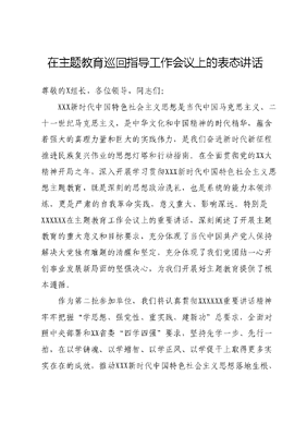 在主题教育巡回指导工作会议上的表态讲话尊敬的X组长,各位领导,同志们:XXX新时代中国特色社会主义思想是当代中国马克思主义、二十一世纪马克思主义,是中华文化和中国精神的时代精华,蕴含着强大的真理力量和巨大的实践伟力,是我们奋进新时代新征程推进民族复兴伟业的思想灯塔和行动指南。在全面贯彻党的XX大精神开局之年,深入开展学习贯彻XXX新时代中国特色社会主义思想主题教育,既是深刻的思想政治洗礼,也是系统的能力本领淬炼,更是严肃的自我革命实践,意义重大、影响深远。特别是XXXXXX在主题教育工作会议上的重要讲话,深刻阐述了开展主题教育的重大意义和目标要求,充分体现了当代中国共产党人保持解决大党独有难题的清醒和坚定,充分体现了我们党团结一心开创事业发展新局面的坚强决心,为我们开展好主题教育提供了根本遵循。作为第二批参加单位,我们将认真贯彻XXXXXX重要讲话精神牢牢把握学思想、强党性、重实践、建新功总要求,全面对照中央部署和XX省委四学四强要求,坚持先学一步、先行一拍,在以学铸魂、以学增智、以学正风、以学促干上取得更多实实在在的成效,推动XXX新时代中国特色社会主义思想落地生根、开花结果。坚持在深学深悟中永葆忠诚底色,督促引导党员干部认真读原著、学原文、悟原理,研读《XXX著作选读》《XXX新时代中国特色社会主义思想专题摘编》等权威教材,从思想上正本清源、固本培元,深刻领悟XXXXXX作为马克思主义政治家思想家战略家的恢弘气魄、远见卓识、雄韬伟略,把学思践悟的收获充分转化为坚定拥护两个确立、坚决做到两个维护的思想和行动自觉,始终在以XXX同志为核心的党中央周围团结成一块坚硬的钢铁。坚持在真信真用中提升实践成色,教育引导党员干部学好用好XXX新时代中国特色社会主义思想这一当代中国马克思主义、二十一世纪马克思主义的看家本领,深刻把握这一重要思想的世界观方法论和贯穿其中的立场观点方法,自觉以之研判形势、掌握规律、推动工作、校正偏差、解决问题,不断提高谋的发展站位、抓的专业能力、落的战略定力持续提升各项工作的科学性、预见性、主动性、创造性,奋力开创XX高质量跨越发展新局面。坚持在对标对表中塑造队伍特色,激励引导党员干部自觉对照XXXXXX关于全面从严治党的重要论述和党章党规党纪,持续激发践行XXX把周总理的家乡建设好,很有象征意义殷切嘱托的使命感、责任感、自豪感,落实省委主要领导提出的总理家乡的干部方方面面都要高标准、严要求的要求,以周总理六个杰出楷模为镜,自觉过好思想关、政治关、社会关、亲属关、生活关五关,着力锻造一支勇于攀高比强、跨越赶超的党员干部队伍,在新时代新征程展现周总理家乡党员干部的良好形象和过硬素质。当前和今后一个时期,我们最紧要的任务就是全面学习、全面把握、全面落实党的XX大精神,深入贯彻XXXXXX对XX工作提出的总要求、总目标、总蓝图,认真落实四个必须明确要求、四个走在前重大任务,以深化践行XXX对XX殷切嘱托十年再出发为新的起点,围绕聚焦打造绿色高地、枢纽新城,全面建设长三角北部现代化中心城市,更好展示象征意义的奋斗目标,聚焦高质量发展首要任务,进一步唱响攀高比强、跨越赶超的主旋律,提振党员干部敢闯敢干、进位争先的精气神,切实把学思想迸发出来的激情和干劲转化为推进中国式现代化XX新实践的新成效,重点是做到四个更好统筹。(一)更好统筹壮总量与提质量,把准高质量跨越发展的发力方向。XXXXXX强调,要推动经济实现质的有效提升和量的合理增长。XX发展最大的问题在于总量不足,最大的短板在于主导产业规模不大、层次不高、竞争力不强,也就是发展不充分。我们将更加注重在发展中推动质的有效提升,准确理解和把握量的合理增长要求,对照2035年与全省同步率先基本实现社会主义现代化的目标任务和节奏安排,把做大总量放在更加突出的位置,完整准确全面贯彻新发展理念,全力提高发展速度,加快走出跨越常规的路径,确保主要经济指标增幅高于苏北、快于全省,超越全国同类城市,争取十四五经济总量再上两个千亿台阶,利用十年左右时间实现地区生产总值较2021年翻番,到十五五末进入全国城市GDP百强榜前XX,努力实现经济总量跨越、全国位次赶超。坚持把产业作为壮总量、提质量的根本抓手积极培育壮大7+3先进制造业集群以及优势产业链,聚力推动园区改革由被动改向主动改转变,加速落地建设一批体量大、质态好、配套产业强的XX亿元和百亿级重特大项目,以锚引链,以链蓄能,更好地促进和带动产业提质,竞争力提升,加快建设以实体经济为支撑的现代化产业体系为实现既定奋斗目标提供坚强物质支撑。(二)更好统筹借外力与挖潜力,积蓄高质量跨越发展的强劲动能。XX总量不足的主要原因在于缺