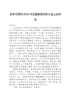 在学习贯彻2023年主题教育动员大会上的讲话同志们:以县处级以上领导干部为重点在全党开展学习贯彻XXX新时代中国特色社会主义思想主题教育,是贯彻落实党的XX大精神的重大举措,是事关全局的一件大事。3月30日,中共中央政治局召开会议,决定从今年4月开始,在全党自上而下分两批开展学习贯彻XXX新时代中国特色社会主义思想主题教育。4月3日,中央召开主题教育工作会议,XXXXXX发表重要讲话。4月5日,省委常委会扩大会议传达学习XXXXXX重要讲话精神和中央工作会议精神,研究贯彻落实方案。4月8日,全省召开主题教育动员大会,省委XXX书记强调,要紧跟XXX、奋进新征程、建功新时代,以两个先行打造重要窗口,为奋力谱写中国式现代化XX篇章注入更加强劲的动力。4月7日,市委常委会传达学习XXXXXX重要讲话精神,研究我市贯彻落实方案。4月10日,全市召开主题教育动员大会,XXX书记强调,要紧扣学思想、强党性、重实践、建新功的总要求,全程高质量、全面高质量开展好主题教育,忠诚坚定用伟大思想凝心铸魂,勠力同心奋进强国复兴新征程。根据市委部署要求,我局坚决把开展主题教育作为重大政治任务,早发动、早部署、早实施,从严抓好学习贯彻和部署落实工作。4月6日,在局务会上布置了我局开展主题教育工作;4月7日下午,局党组专题学习XXXXXX在中央工作会议上的重要讲话精神和中央、省市委有关会议精神,研究我局贯彻落实方案。今天我们召开动员大会,就是要进一步统一思想、提高认识,全面部署我局开展主题教育各项工作。下面,我代表局党组讲三点意见。一、提高政治站位,充分认识开展主题教育的重要意义在全党深入开展学习贯彻XXX新时代中国特色社会主义思想主题教育,是党中央为全面贯彻党的XX大精神、动员全党同志为完成党的中心任务而团结奋斗所作的重大部署,是深入推进新时代党的建设新的伟大工程的重大部署,对于统一全党思想、解决党内存在的突出问题、始终保持党同人民群众血肉联系、推动党和国家事业发展,意义重大、十分必要、恰逢其时。XXXXXX在中央主题教育工作会议上发表的重要讲话,从新时代新征程党和国家事业发展全局的战略高度,深刻阐述开展主题教育的重大意义和目标要求,对主题教育各项工作作出全面部署,为全党开展主题教育提供了根本遵循,是一篇马克思主义纲领性文献,我们一定要认真学习领会,深入贯彻落实。一要深刻认识这是统一意志行动、始终保持凝聚力战斗力的必然要求,更是确保农业农村部门坚定拥护两个确立、坚决做到两个维护的迫切需要。目前,一些党员干部在理论学习上同党中央要求相比还存在不少差距,没有做到往深里走、往心里走、往实里走。这些问题的存在,从根子上讲是认同缺乏、信念动摇。这次主题教育确定以学习贯彻XXX新时代中国特色社会主义思想为主题,就是要用XXX新时代中国特色社会主义思想凝心铸魂,推动全党更加自觉深刻领悟两个确立的决定性意义,增强四个意识、坚定四个自信、做到两个维护。就是要教育引导党员、干部从思想上正本清源、固本培元,始终在思想上政治上行动上同党中央保持高度一致,做到心往一处想、劲往一处使,共同把党锻造成一块攻无不克、战无不胜的坚硬钢铁。二要深刻认识这是站稳人民立场、强化宗旨意识的必然要求,更是农业农村部门践行为民初心、厚植为民情怀的迫切需要。党的一切工作都是为了实现好、维护好、发展好最广大人民的根本利益。总的来看,我局广大党员、干部的群众观念、宗旨意识是比较强的,但也有少数党员干部有意无意地脱离群众、漠视群众。有的同志宗旨观念有所弱化,主动服务基层、服务三农的意识不够强。有些同志不善于讲内行话,讲群众明白话,讲基层管用话。开展这次主题教育,就是要继续教育引导广大党员干部自觉践行党的根本宗旨,把以人民为中心的思想内化于心、外化于行,走好新时代群众路线,让群众有更多实实在在的获得感、幸福感、安全感。就是要深刻理解脚下有泥、心中有爱内涵,引导三农干部躬身践行舞台在田野,根脉在百姓的服务宗旨,紧紧抓住农民最关心最直接最现实的利益问题,全心全意助力农业增效、农民增收、农村富裕。三要深刻认识这是激发斗志干劲、凝聚奋进力量的必然要求,更是农业农村部门保持冲锋姿态、彰显三农担当的迫切需要。党的XX大报告提出全面推进乡村振兴,并强调全面建设社会主义现代化国家,最艰巨最繁重的任务仍然在农村。面对错综复杂的国际国内形势、艰巨繁重的改革发展稳定任务、各种不确定难预料的风险挑战,要实现党的XX大确定的战略目标,迫切需要广大三农干部学思想、见行动。开展这次主题教育,就是要我们不断提高推动高质量发展本领、服务群众本领、防范化解风险本领,加强斗争精神和斗争本领养成,提振锐意进取、担当作为的精气神,在助力宁波打造中国式现代化市域样板道路上走在前列、勇当