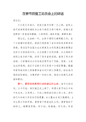 在春节后复工动员会上的讲话同志们:今天是正月初九,是我们春节后第一天上班,首先让我代表局党委给局机关全体干部职工拜个晚年,祝福大家在新的一年里身体健康、工作顺利、阖家幸福、事事如意!同志们,过去的一年,全体干部职工都积极工作,各个方面都干的很好,使我们局获得了省和市的很多荣誉和奖励,通过召开全国水生态修复及水利风景区建设管理会议和方方面面的工作,大大提高了水利形象。水文局的干部职工也干的不错,获得了很多省级奖励,取得了很大的成绩。大家确实为水利快速发展作出了贡献。但是,大家也必须看到,我们今后的工作任务还十分艰巨繁重。根据市委市政府的工作部署和省水利厅的工作要求,结合我们局的实际情况,为做好新一年的工作,我对大家提几点希望和要求:第一,要尽快将思想行动转到工作上来。春节已经过完,从今天起,我们就正式上班了,希望大家尽快从年味中走出来,从思想上、行动上转到我们的工作上来。因为我们今年的工作任务仍然很重,8大重点水利工程建设,5项主要工作的开展,需要每个科室站队公司,需要每位干部职工,都要有思路,有计划,有措施,有行动,有落实。春节前省厅就来了2个通知,一是初九要组织召开水库移民工作电视电话会,会议材料和会务都需要我们准备。二是准备参加省召开的胶东调水施工现场会,我们还要做会议发言。下一步按照省的施工计划,配合进行渠首沉沙池的迁占和施工。三是3月初要召开全市水利工作会,结合贯彻全省水利局长会议精神,安排部署全市的水利工作。我们本身制定的许多工作计划,还要做详细的研究和落实。去冬今春雨雪较少,旱情严重,春季抗旱和引水工作也需要进一步做好。所以,大家一定要对今年的工作任务有一个清醒的认识,要尽快的将思想、行动转到正常工作上来,确保今年水利再创佳绩。第二,要实现工作上的开拓创新。今年我们能否再创佳绩,关键是看各项工作是否有创新,是否有新的突破,是否有新的发展。所以各局直属单位、局机关各科室站、队、公司,特别是局各科室站队,都要结合自己的工作,研究如何开拓创新,如何实现创新的问题,确保各项工作都有开拓,都有创新,都有突破。请各位局领导和有关科室站、队、公司及局属单位的负责人都要高度重视,认真研究,理清工作思路,找准开拓创新的突破口,集中领导,集中精力,明确责任,真抓实干,确保新的一年各项工作都有创新,都有新的发展。第三,要进一步严格纪律改进作风。这两年来,随着我们局机关规章制度的不断完善,同志们思想觉悟在不断提高,文明程度不断提升,总体上说,我们局机关的纪律和遵章守纪情况还是比较好的,同志们的工作作风也是不断得到了改进和加强,这为我们圆满的完成各项水利任务和做好各项工作奠定了良好的基础条件,这样才使我们水利不断取得新的成绩,使水利得到了领导和社会各界的认可和肯定。但是我们也必须看到,我们有不少地方还存在着不足,比如有的规章执行不严,有的不按规定办事,有的作风懒散,有的工作应付从事,缺乏高标准严要求,有的个人主义、小团体意识严重,缺乏大局意识和团队观念等等。所有这些不足和问题,对我们开创新业绩,对水利事业的发展是非常有害的。必须引起我们全局干部职工的高度重视和高度警惕,必须尽快完善规章制度建设、严格规章制度的遵守;进一步转变工作作风,提高效能效率,适应紧张繁重的工作需要,以自己的模范行为,树立起水利的良好形象。第四,要建设文明节约型机关。加强文明节约型机关建设,是建设精神文明和建设资源节约型社会的重要内容。我们局的财力还很有限,欠帐还很多,经济还十分紧张,我们的各项开支还很多,还帐还贷款的压力也很大,需要花钱的地方也很多,因此希望大家都要从思想上过紧日子,不要大手大脚,从水、电、暖、办公招待、会议、车辆管理等各个方面来节约,自觉为水利局节约资金,节约每一分钱。同时也要广开财源,加强征费收费,主动向油田,向财政、向上级要政策,要项目,要资金,要支持。多为我局聚财增财。同时要加强金水公司的多种经营工作,多为局里和职工创收增收。关于加强机关文明建设问题,我不想细说了。在这里我主要强调的是,在机关卫生面貌、机关管理、文明办公、文明用语、文明接待、文明行为,文明处理同志之间的关系,文明创建活动等,请大家都要引起注意,用文明标准来约束自己的行为,应当怎样做,不应当怎样做,要体现出干部的水平,党团员的水平,国家职工的水平,做文明人,争当文明标兵,创建文明科室,争创文明机关和文明行业。总之,希望大家在新的一年里,要有新的思路,有新的风貌,有新的作风,有新的突破,有新的业绩。最后再一次祝愿大家在新的一年里身体好,工作好,运气好,事事好,一切都好!
