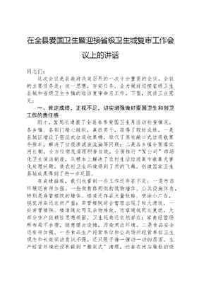 在全县爱国卫生暨迎接省级卫生城复审工作会议上的讲话同志们:这次会议是县政府决定召开的一次十分重要的会议。会议的主要任务是:统一思想,夯实任务,全力做好迎接省级卫生县城和省级卫生乡镇的暗访复审命名工作。下面,我讲三点意见:一、肯定成绩,正视不足,切实增强做好爱国卫生和创卫工作的责任感刚才,X局长通报了全县春季爱国卫生月活动检查情况,各乡镇、各部门精心组织,真抓实干,取得了较好成绩。一是县城区增设了密闭式垃圾收集桶,取代了原有敞口式垃圾收集手推车,解决了垃圾渗滤液流淌等问题;二是各乡镇全面落实河长制,全方位彻底清理积存垃圾,全面推行X公司市场化卫生保洁制度,从根本上解决了农村生活垃圾集中收集无害化处理问题,使农村卫生环境得到了质的飞越,创建国家卫生县城成果得到了进一步巩固。在成绩面前,我们也看到一些工作还存在不足:一是市容环境还有待加强。一些街巷路两侧构筑物墙体、公共设施体表,特别是弃管楼院的墙体、楼道还存在大量张贴、喷涂小广告,视觉污染还依然严重;弃管楼院综合管理出现了较大滑坡,一些弃管楼院、楼道随处可见杂物堆放,违章建筑死灰复燃,大部分住户依赖性思想顽固,卫生死角还依然存在;家禽经营场所布局不合理,随意摆点设摊,污染周边环境。二是食品安全还有待加强。一些食品生产经营单位和公共场所经营单位卫生观念和长效保洁意识不强,还只限于催一催动一动的层面,生产经营环境还没有做到搬家式清理,还存在闭店躲检的侥幸心理;一些经营单位服务人员更换频繁,亲属临时帮忙居多,持有有效健康证的比例较低。三是灭鼠力度还有待加强。今年,县农业局共向上争取了X吨农田灭鼠药物,城乡总计投放鼠药X吨,虽然鼠药分发投放到位,基本覆盖了全县X个行政村和X个社区,但灭鼠投药方法还没有真正传授给农民,仍然存在乱投乱撒和浪费鼠药的现象,还没有真正做到规范投药灭鼠,未达到灭鼠预期效果。四是农村环境还有待加强。一些乡镇对枯死树木不能及时补植,街路绿化断条断带;有的乡镇还存在街路无绿化、主路两侧漏土地面较多、一些部位还存在卫生死角等。五是城乡环境卫生整洁行动有待加强。我县农村卫生环境整治虽然取得了历史性突破,但是,按照《X确定的目标任务,农村卫生厕所普及率还相差X%、农村污水处理基本没动,任务还十分艰巨。六是创卫宣传还有待加强。爱国卫生月活动开展以来,只有少数单位通过悬挂条幅、LED电子屏插播标语实施爱国卫生和创卫宣传,群众广泛参与爱国卫生运动的优良传统还没有充分发挥,创卫氛围不够浓厚,等等,这些问题必须高度重视,采取措施加以解决。二、突出重点,明确责任,努力破解爱国卫生和创卫工作的重点难点问题今年X月—X月份,我县将迎接省爱卫会对我县巩固创建省级卫生县城的届满暗访复审命名工作。同时,按照X%的比例对X个省级卫生乡镇和X个省级卫生村进行届满复核命名,要求我们必须采取有效措施破解在爱国卫生和创卫工作中存在的一些重点难点问题:一是要进一步加强弃管楼综合管理。2023年,我县通过创建省级卫生城实施弃管楼院综合整治,弃管楼院的居住环境得到了彻底改善,各部门各单位付出了很大财力和辛劳。但是,一些住户也产生了顽固性的依懒思想,给大家增添了不少工作压力。目前,我县还没有找到解决弃管楼院的有效办法,各包保单位还不能撒手不管,在卫生保洁和小广告清理上还要重点倾注。在墙体广告粉刷覆盖方面,县爱卫办要会同X镇、城管局和财政局负责预算,由城管局负责购买与楼体颜色相近的涂料统一进行覆盖。城管局要会同住建局、公安局和X镇着手调研,年内要出台方案,推进弃管楼院卫生保洁、排水维护、路面硬化、社会治安等综合管理问题,实施规范化管理。二是要进一步完善道路硬化建设。X镇要会同发改、交通、财政等部门,调研立项,及早完成对城乡结合部破损道路的建设改造,在未建设改造之前,要采取措施,保证道路平坦干净、无积水。县城管局要会同财政局,对破损人行道板进行调研预算,加大工作力度,及时完成对破损路面、排水井的修缮工作。三是要进一步强化环境卫生保洁。县城管局和市场监督管理局,要继续加大对各街路商户、摊位业主的教育引导,完善垃圾收集设施,增强环境卫生观念,避免和减少落地垃圾的产生。同时,加大对各垃圾收集部位和排水井口的清洗处理,及时消除乱泼乱倒和垃圾渗虑液的污染痕迹,减少蚊蝇的孳生地。四是要进一步强化食品安全整治。县市场监督管理局和县卫计局,要切实加大对食品安全和公共场所的整治力度,督促商户业主对各自的食品生产经营场所和公共场所实施搬家式清理,教育和引导其树立长期的卫生观念和食品卫生安全意识,消除其闭店躲检的侥幸心理,亮证经营,持证上岗,使其全部达到相应的行业标准要求。五是要进一步规范市场经营秩序。县畜牧局要会同住建、城管和市场监督管理等部门,年内完成禽类经营市场的规划方案,及早将分散在各处的家禽宰杀经营点全部归入实施规范化管