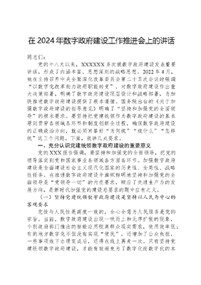 在2024年数字政府建设工作推进会上的讲话同志们:党的十八大以来,XXXXXX多次就数字政府建设发表重要讲话,形成了内涵丰富、思想深刻的战略思想。2022年4月,他在主持召开中央全面深化改革委员会第二十五次会议时强调以数字化改革助力政府职能转变,对数字政府建设作出重大决策部署,明确了数字政府建设顶层设计和战略部署,为加快推进数字政府建设提供了根本遵循。国务院出台的《关于加强数字政府建设的指导意见》明确了坚持和加强党的全面领导的根本要求。要坚持把党建统领作为数字政府建设的基本原则贯穿各领域各环节和制度创新全过程,确保数字政府建设的正确政治方向,就必须回答好为何统统什么怎样统这三个问题。下面,我讲几点要求。一、充分认识党建统领数字政府建设的重要意义党的XXX报告强调,要坚持和加强党的全面领导,把党的领导落实到党和国家事业各领域各方面各环节。加强数字政府建设是全面建设社会主义现代化国家的历史性、全局性、战略性任务。在推进数字政府建设中旗帜鲜明地坚持和加强党的全面领导是党领导一切的内在要求,顺应了先进生产力的发展方向,是新时代加强党的建设总要求的题中应有之义。(一)坚持党建统领数字政府建设是坚持以人民为中心的客观要求党性与人民性是高度一致的,全心全意为人民服务是党的宗旨。当前,数字政府建设出现一哄而上和无序扩张的现象,个别政府部门推出的智能应用脱离群众现实需求,使用效率低;有的地方数字化不但没有实现便民,还增加了公众负担,一些事项线下办理完成后,还得在线上再走一次。只有坚持党建统领数字政府建设,才能有效避免为了数字化而数字化的本末倒置行为的发生,彰显我国政府的人民性,才能充分发挥党密切联系群众的优良作风和政治优势,精准对接公众需求,用数字化手段破解企业和群众急难愁盼问题,深度开发各类便民应用,在提升政府治理效率的同时不断提升公众获得感。(二)坚持党建统领数字政府建设是提升政府履职能力的坚实支撑数字政府建设是推进政府职能转变的建设之路,更是提升政府治理能力的深刻改革。在中国共产党深入推动执政能力建设的当下,主动应对信息化挑战,推动将大数据技术创新嵌入党的建设当中,成为党在治国理政中的当务之急。转变政府职能,坚持向党建统领数字政府建设要战斗力,就是把数字政府建设的目标导向、宗旨方向牢牢掌握在党的手中。只有坚持党建统领数字政府建设,才能更好地以系统观念、应用牵引来推进数字政府建设,更公平惠及全体人民,满足人民对美好生活的向往。只有坚持党的集中统一领导,才能充分发挥数字化在政府科学决策、经济调节、社会治理、市场监管、公共服务等方面的职能作用,构建协同高效的数字化履职能力体系。(三)坚持党建统领数字政府建设是维护国家安全的有力保障数字政府安全涉及包括公共安全、数据安全、网络安全等多个方面在内的国家整体安全。坚持党建统领数字政府建设是维护国家安全的必由之路,意味着把党的领导贯穿到信息网络安全建设的各方面各环节。只有坚持党建统领数字政府建设,才能压实维护国家安全的政治责任,综合运用法律、制度,加强督查、监管,保障数字政府建设安全,筑牢国家安全防线。只有坚持党建统领数字政府建设,才能更好发挥我国制度优势,深度参与全球互联网与数据治理体系深刻变革,加快构建数字政府全方位安全保障体系,健全安全管理标准规范,强化数字政府安全管理责任,提高防范和抵御安全风险能力。二、新时代坚持党建统领数字政府建设统什么党政军民学,东西南北中,党是领导一切的。新时代加快构建党建统领数字政府建设体系,必须强化战略思维、系统思维、底线思维,明确坚持党建统领数字政府建设不是大包大揽,不是一揽无余,而是增强统的意识,在统方向、统规则、统安全、统人才等方面改革创新,统筹推进各项工作扎实有序开展。(一)聚焦统领管理体制,构建以党建统领数字政府建设的工作体系数字政府建设是一项系统工程,必须以全局思维、系统谋划的方法,协调一致地开展数字政府建设各项工作。近年来,XX坚持把高质量发展要求体现在数字政府建设的各方面,牢固树立一盘棋理念,以一朵云为载体、一张网为链接、一道墙为防线,强化省市联动、整体协同、统分结合、条块贯通,打造全省一体化高效运行的数字政府。从组织领导看,全省各级各地大都建立了一把手亲自抓数字化改革的责任落实机制,省、市、县三级成立数字化改革领导小组,党委书记担任组长,形成纵向贯通、横向协调、执行有力的高效执行链。如省级成立高规格的数字政府建设工作领导小组,构建了一局一中心一集团工作体系,省行政审批和政务信息管理局、省政务大数据中心、XX电子科技集团有限公司各司其职,厘清三者职责定位,初步建立起了局负责行政管理、中心负责信息技术服务保障、集团负责建设运营的三位一体协同工作机制。整合省直29家数据信息服务机构组建省政务大