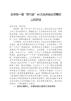 在学院一届双代会xx次全体会议闭幕式上的讲话各位代表,同志们:我院第一届双代会第七次会议,经过全体与会代表和工作人员的共同努力,圆满完成了大会预定的各项议程,即将胜利闭幕。在此,我代表学院党委对大会的成功召开和取得的成果表示热烈祝贺!向各位代表,并通过你们向辛勤工作在教学、医疗、管理和服务等一线的教职员工们表示衷心的感谢!大会期间,各位代表审议并通过了由xx同志所做的学院工作报告、xx同志所做的学院工会工作报告。会议还审议了《学院十四五发展规划》《学院财务工作报告》《工会经费审查报告》和《提案工作报告》。会议期间,从各代表团汇报情况看,代表们认为,《学院十四五发展规划》能够紧紧围绕国家、xx省和xx市十四五发展规划精神,立足新发展阶段,贯彻新发展理念,立足学院实际,科学审慎地提出了今后五年学院建设发展的总体思路、发展目标和重点工作任务,《规划》提出的学院十四五期间的建设发展总体思路,既明确了目标、路径和措施,又达到与十三五建设发展思路的有效衔接,是指导和安排部署今后五年学院工作的纲领性文件和基本工作遵循。代表们认为,《学院工作报告》《工会工作报告》能够紧紧围绕国家、xx省《职教改革实施方案》和《深化新时代教育评价改革总体方案》方向标,结合xx省建设特色高水平职业院校和专业群的现实要求,提出的2024年具体任务和学院工会年度重点工作,符合学院发展实际,请切实抓好落实,下面我再讲三点意见:一、坚持立德树人,全面加强党对教育工作的领导在全国教育大会上,XXXXXX站在新时代的战略高度,提出了教育是国之大计、党之大计,围绕培养什么人,怎样培养人,为谁培养人这一根本性问题,为新时代教育改革发展指明了方向。作为教育工作者,我们应该清醒看到教育改革发展的任务比以往任何时候都更加艰巨,教育国之大计、党之大计的地位从来没有像今天这么凸显。我们肩负着为党育人、为国育才的重大使命,落实立德树人的根本任务,必须坚持正确的办学方向。一是突出政治引领,持续加强政治建设。坚持把党的政治建设放在首位,把讲政治作为一切工作的生命线。切实加强党对教育工作的全面领导,就是要教育引导广大师生提高政治站位,就是要用四个意识导航,用四个自信强基,用两个维护铸魂,就是要在思想上、政治上、行动上同以XXX同志为核心的党中央保持高度一致。二是扎实开展党史学习教育。我们党将迎来百年华诞,党中央发出通知,XXXXXX发表重要讲话,号召全党开展党史学习教育,正当其时,十分必要。历史是最好的老师、最好的教科书、最好的营养剂。修好党史这门课,对于总结历史经验、认识历史规律、掌握历史主动,对于传承红色基因、牢记初心使命、坚持正确方向,对于深入学习领会XXX新时代中国特色社会主义思想,在新的历史起点上奋力夺取新时代中国特色社会主义伟大胜利,具有重大而深远的意义。按照省委教育工委部署安排,学院的党史学习教育范围为全体党员,重点是处级以上干部。学院党委制定的《实施方案》下发后,各党总支、支部要立即落实,压紧压实主体责任,站在一线、靠前指挥,层层传导压力,从严抓好落实,确保党史学习教育各项部署要求不折不扣落到实处。三是深入开展牢记嘱托.奋进商洛党建主题活动。开展牢记嘱托·奋进商洛党建主题活动,既是贯彻XXXXXX来陕考察重要讲话精神的具体行动,也是加强党的建设的现实需要。学院各级党组织和广大党员干部要提高政治站位,自觉把思想和行动统一到市委和院党委的部署上来,推动党建主题活动深入开展。要紧盯重点关键,以争创红旗党组织、争做时代先锋、争当奋进标兵三争创建活动为抓手,抓点示范、强化引领,做细做实创先争优活动。四是抓实基层组织建设,持续提升党建工作质量。要严格落实三会一课、组织生活会、谈话谈心、民主评议党员等制度,加强基层党支部五化建设,开展多样主题党日活动,推动党员服务师生常态化制度化,深化精技匠心育人才示范党建品牌建设,以高质量党建推动学院事业高质量发展。二、坚持三教改革,不断提升教育教学内涵质量一是持续用力,推进三教改革。要结合学院教育教学实际,落实新时代教育评价制度要求和职教20条改革路线图,深入推进教师、教材、教法三教改革。要加强师资队伍建设,抓好青蓝工程名师工程等六大工程的落实,推动师资水平整体提升;要守牢教材意识形态阵地,开展校企双元合作开发职业教育规划教材,支持教师编写校本专业教材、融媒体教材等;要进一步健全诊改常态化工作机制,加大一流专业培育项目和特色专业群建设力度,积极推进教学模式、教学方法改革,驰而不息地抓规范,提质量。二是同向同行,提升课程思政育人实效。XXXXXX在系列重要讲话中都谈到培育时代新人是教育的重要使命和根本任务。时代新人不仅体现在技术、知识等方面与时俱进,还体现