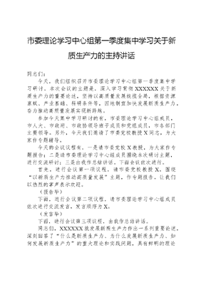市委理论学习中心组第一季度集中学习关于新质生产力的主持讲话同志们:今天,我们组织召开市委理论学习中心组第一季度集中学习研讨,本次会议的主题是,深入学习贯彻XXXXXX关于新质生产力的重要论述,坚持以高质量发展统揽全局,根据资源禀赋、产业基础、科研条件等,因地制宜加快发展新质生产力,奋力推动高质量发展实现新跨越。参加今天集中学习研讨的有,市委理论学习中心组成员,市人大、市政府、市政协领导班子成员和党组成员,市各部门主要领导。另外,今天我们邀请了市委党校教授X同志,为大家作专题辅导。今天的会议议程有,一是请市委党校X教授,为大家作专题报告;二是请市委理论学习中心组成员围绕本次研讨主题,进行交流研讨;三是由我作总结讲话。下面会议依次进行。首先,进行会议第一项议程,请市委党校教授X,围绕以新质生产力推动高质量发展主题,作专题报告。让我们以热烈的掌声表示欢迎。(报告毕)下面,进行会议第二项议程,请市委理论学习中心组成员依次进行交流发言,发言顺序为X。(发言毕)下面,进行会议第三项议程,由我作总结讲话。同志们,XXXXXX就发展新质生产力作出一系列重要论述,深刻回答了什么是新质生产力、为什么发展新质生产力、如何发展新质生产力的重大理论和实践问题,具有鲜明的理论原创性和强大的实践引领力,丰富和发展了马克思主义生产力理论,把我们党对生产力发展规律的认识提升到新高度,是XXX经济思想的最新成果,为以中国式现代化全面推进强国建设、民族复兴伟业提供了科学指引。新质生产力是对马克思主义生产力理论的创新和发展,进一步丰富了XXX经济思想的内涵,既具有重要的理论意义,又具有深刻的实践意义。我们要在深入学习贯彻XXXXXX重要讲话精神的基础上,加强对新质生产力形成和发展的规律性认识,进一步深化理解认识、把牢目标方向、把握重点任务,切实增强发展新质生产力的政治责任感和历史使命感。刚才,X教授围绕新质生产力在推动高质量发展中的重要作用,进行了生动具体的解读,下面,我从发展新质生产力需要处理的辩证关系、推动新质生产力应该如何入手、如何因地制宜发展新质生产力等方面,与大家分享几点意见,也是本次学习研讨的总结。一、正确认识新质生产力,要处理好若干辩证关系生产力是推动社会进步的最活跃、最革命的要素。新质生产力的特点是创新,关键在质优,本质是先进生产力,已经在实践中形成并展示出对高质量发展的强劲推动力、支撑力。在强国建设、民族复兴的新征程上,发展新质生产力是推动高质量发展的内在要求和重要着力点。面对新一轮科技革命和产业变革,只有抢抓机遇,加大创新力度,加快发展新质生产力,我们才能进一步增强发展新动能、塑造发展新优势,把发展主动权牢牢掌握在自己手里。发展新质生产力是一项长期任务、系统工程,涉及方方面面,需要科学谋划、统筹兼顾,坚持稳中求进,扎扎实实向前推进。发展新质生产力的前提是正确认识新质生产力,要在理解传统生产力的基础上,把握好一系列关系。一是处理好生产力和生产关系之间的关系。XXXXXX强调:高质量发展需要新的生产力理论来指导,而新质生产力已经在实践中形成并展示出对高质量发展的强劲推动力、支撑力,文可居文库——海量学习资料,手机电脑均可下载www.wenkeju.com需要我们从理论上进行总结、概括,用以指导新的发展实践。近年来,以电动载人汽车、锂电池和太阳能电池为代表的外贸新三样持续走俏,成为我国外贸出口的新增长点。这就要求我们在调查研究的基础上,加快形成和完善能够适应新质生产力发展要求的新型生产关系,充分发挥市场在资源配置中的决定性作用,更好发挥政府作用,构建科学高效的体制机制保障并引领新质生产力的发展。在全面深化改革中,应该认识到生产力是推动社会进步的最活跃、最革命要素,并主动将生产力与生产关系矛盾运动规律作为党和国家制定路线、方针和政策的重要依据。二是处理好新质生产力内外部诸要素之间的关系。从内部诸要素之间来说,首先,要培育与新质生产力发展相匹配的更高素质劳动者队伍。其次,创新和应用更高技术含量的劳动资料。最后,拓展更广范围的劳动对象。从外部诸因素之间来说。发展新质生产力,不可能不与我国经济社会的发展乃至全球局势的变化发生联系。在以中国式现代化全面推进强国建设、民族复兴伟业的新征程中,不仅要统筹兼顾,系统谋划,整体推进,更要正确处理顶层设计与实践探索、战略与策略、守正与创新、效率与公平、活力与秩序、自立自强与对外开放等一系列重大关系。新一轮科技革命和产业变革深入发展,催生了大量新产业、新业态和新模式,学科之间、科学和技术之间、自然科学和人文社会科学之间日益呈现交叉融合的趋势,国际关系民主化不可阻挡。这就要求我们统筹国内与国际、传统安全与非传统安全、改革发展稳定等多维因素,为新质生产力的发展保驾护航。三是处理好新质生产力与传统生产力
