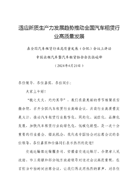 适应新质生产力发展趋势推动全国汽车租赁行业高质量发展在全国汽车租赁行业高质量发展(合肥)会议上讲话中国出租汽车暨汽车租赁协会会长张峻峰(2024年4月20日)各位领导,各位嘉宾,各位同仁:大家上午好!桃之夭夭,灼灼其华,我们在最美丽的季节相聚在安徽合肥,召开全国汽车租赁行业高峰会议,共商行业高质量发展大计,推动汽车租赁行业数字化、网约化、诚信化、品牌化发展,加快汽车租赁行业向绿色化、低碳化转型,是一次十分重要的行业盛会。借此机会,我代表中国协会对出席会议的各位领导、各位嘉宾和全体同仁表示热烈的欢迎!交通运输部运输服务司、安徽省交通运输厅、合肥市人民政府、市工商联和部分地方政府领导对这次会议高度重视,在百忙当中抽时间出席会议,让我们再次用热烈的掌声,对各位领导的莅临表示衷心感谢!刚才,交通运输部运输服务司马明处长作了重要讲话,为汽车租赁行业高质量发展指明了方向,我们要认真学习,深刻领会,全面贯彻落实。感谢合肥市人民政府何逢阳副市长亲临现场致辞,这次会议承办单位合肥市汽车租赁行业协会为办好这次会议,进行了精心准备、付出了辛勤劳动,丁家成会长在欢迎辞中表达了东道主的盛情,我代表中国协会一并表示诚挚的谢意!这次会议的指导思想是:以XXX新时代中国特色社会主义思想为指导,全面贯彻落实党的XXX精神和国家新能源发展战略,紧紧围绕汽车租赁行业高质量发展这个首要任务,总结交流汽车租赁行业工作经验,展示汽车租赁行业创建诚信企业活动成果,以推动汽车租赁行业数字化、网约化转型为手段,以加强汽车租赁行业诚信化、品牌化建设为重点,以促进汽车租赁行业适应新质生产力发展趋势为努力方向,推动汽车租赁行业在可持续发展道路上迈出新步伐。下面,我就汽车租赁行业高质量发展讲几点意见。文可居文库——海量学习资料,手机电脑均可下载www.wenkeju.com一、客观评价汽车租赁行业出现的新变化近年来,在交通运输部和各级地方政府的坚强领导下,在各地方协会的积极带领下,全国汽车租赁行业努力克服各种不利因素的影响,团结奋斗、积极探索、稳中求进,在推动高质量发展方面取得了新进展,出现了新变化。(一)行业思想认识不断深化针对高质量发展这一首要任务,全国汽车租赁行业一直在积极探索,思想认识不断深化,形成了许多重要共识。中国协会在全国汽车租赁行业高质量发展(太原)高峰论坛上,提出高质量发展既是时代要求也是重要机遇,全国汽车租赁行业要以建设数字经济为契机,以守法诚信经营为重要保障,适应新形势、把握新机遇,努力实现高质量发展。在全国汽车租赁行业高质量发展(内蒙古)高峰论坛上,中国协会提出了六个坚持:坚持政治引领,正确认识汽车租赁行业面临的形势;坚持守正创新,稳步推进汽车租赁行业企业转型发展;坚持依法经营,助力完善汽车租赁行业政策法规;坚持诚实守信,不断提升汽车租赁行业信誉度、美誉度;坚持共建共享,深化汽文可居文库——海量学习资料,手机电脑均可下载www.wenkeju.com车租赁产业链合作共赢;坚持善作善成,开创汽车租赁行业高质量发展新局面。中国协会的这些观点和意见是大家共同思考和探索的成果,是对汽车租赁行业改革发展实践的总结和提炼,对于推动汽车租赁行业高质量发展具有重要的指导作用。(二)行业发展政策不断优化一是交通运输部办公厅、文化和旅游部办公厅联合发布《关于加快推进城乡道路客运与旅游融合发展有关工作的通知》,积极推动交旅融合发展,大交通+落地租低碳出行模式正在成为异地租车的新风尚,汽车租赁行业成为助力旅游产业发展的重要力量。二是各级地方政府结合本省市地域特点和企业经营规模实际情况,制定了《小微型客车租赁管理实施细则》,优化备案管理措施,规范企业经营行为,引导企业规模化经营,降低行业经营风险,为汽车租赁行业发展提供了法治保障。三是部分城市出台专项措施,加快网点布局建设,支持企业在机场、高铁站、公路客运站和重点旅游景区设置租赁网点或柜台,提供停车便利,同时支持企业扩大网络服务覆盖范文可居文库——海量学习资料,手机电脑均可下载www.wenkeju.com围,优化经营网点布局,提供一点租多点还一城租多城还的租赁服务,为汽车租赁企业拓展业务提供了便利条件。(三)行业协会工作不断强化1.行业反映诉求的渠道更加畅通。中国协会和各地方协会作为汽车租赁行业治理体系的重要力量,积极发挥桥梁纽带作用,主动向交通运输部、发改委、公安部、商务部、财政部等相关国家部委和地方政府主管部门汇报工作或提交专题报告,已成为各级政府主管部门了解行业实际情况和收集意见建议的重要渠道。2.行业改革发展的思路更加清晰。中国协会制定并实施十四五发展规划,提出了十四五期间汽车租赁行业发展和各级协会建设的总体思路、发展目标、主要任务、工作步骤和保障措施,为汽车租赁