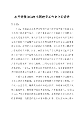 在厅开展2023年主题教育工作会上的讲话同志们:今天,我们召开开展学习贯彻习近平新时代中国特色社会主义思想主题教育工作会,主要任务是以习近平新时代中国特色社会主义思想为指导,深入学习贯彻习近平总书记在中央学习贯彻习近平新时代中国特色社会主义思想主题教育工作会议上的重要讲话精神,按照党中央和省委的工作部署,对全厅开展主题教育工作进行动员部署。刚才,XX同志传达了习近平总书记在学习贯彻习近平新时代中国特色社会主义思想主题教育工作会议上的重要讲话精神和中央、省委学习贯彻习近平新时代中国特色社会主义思想主题教育工作会议精神,XX同志对全厅主题教育工作作了具体安排。一会儿,省委第二巡回指导组成员、省委督查室调研员XX同志还要提工作要求,我们要认真学习贯彻,切实抓好落实习近平总书记强调,开展学习贯彻习近平新时代中国特色社会主义思想主题教育,是贯彻落实党的XX大精神的重大举措,对于统一全党思想、解决党内存在的突出问题、始终保持党同人民群众血肉联系、推动党和国家事业发展,具有重要意义。省委XX书记从坚持党的创新理论的铸魂工程、永葆党的先进性纯洁性的重要举措、践行党的根本宗旨的强大引擎、贯彻党的XX大精神的必然要求、激发新时代新担当新作为的生动实践五个方面深入解读了主题教育的重要意义。我们要认真学习、深刻领会,自觉把思想和行动统一到中央和省委的要求上来,进一步坚定高起点、高标准、高质量开展好主题教育的政治自觉、思想自觉和行动自觉,把严的要求、实的举措、好的作风贯穿主题教育始终,确保主题教育取得实效。下面,我讲四点意见。一、领会好开展主题教育的重大意义今年是贯彻落实党的XX大精神开局之年,是实施十四五规划承上启下的关键之年,在这个重要节点开展主题教育,其意义重大而深远。习近平总书记的重要讲话从新时代新征程党和国家事业发展全局的战略高度,深刻阐述开展主题教育的重大意义和目标要求,对主题教育各项工作作出全面部署,为全党开展主题教育提供了根本遵循,是一篇马克思主义纲领性文献。(一)开展主题教育是学习贯彻习近平新时代中国特色社会主义思想的铸魂工程。思想建党、理论强党,是我们党的鲜明特色。从延安整风运动以来,我们党开展的历次集中教育活动,都以思想教育、理论学习打头。推动学习习近平新时代中国特色社会主义思想往深里走、往心里走、往实里走,是这次主题教育的核心任务。习近平新时代中国特色社会主义思想,是当代中国马克思主义、21世纪马克思主义,是党和国家必须长期坚持的指导思想,是我们一切工作的行动指南和根本遵循。开展学习贯彻习近平新时代中国特色社会主义思想主题教育,就是要教育引导党员干部带着补钙的渴望、带着赶考的姿态、带着复兴的使命,学原文、读原著、悟原理,反复学、深入学、持久学,切实把习近平新时代中国特色社会主义思想学习透、领会准运用好,真正学出高度自信、矢志不渝的信仰追求,忠诚坚定、永不改变的绝对忠诚,发自内心、真挚热烈的爱民情怀,胸怀全局、着眼长远的宽阔视野,忧党忧国、直面问题的担当精神,勤勉工作、开拓进取的务实作风,深刻领悟两个确立的决定性意义,不断增强四个意识、坚定四个自信、做到两个维护。(二)开展主题教育是提高党的建设质量的基础工程。先进性、纯洁性是无产阶级政党区别于其它政党的根本标志,也是我们党性质、宗旨的集中体现。从《共产党宣言》到《中国共产党章程》,从马克思主义理论到习近平新时代中国特色社会主义思想,尽管我们党所处的时代不同、环境不同、使命任务不同,但对先进性、纯洁性的追求都是一脉相承的。共产党的先进性、纯洁性不是一劳永逸的,只有不断修正自我、提升自我,才能确保与历史同步伐、与时代共命运,才能赢得光明的未来。开展学习贯彻习近平新时代中国特色社会主义思想主题教育,就是要深入贯彻新时代党的建设总要求,增强忧患意识、坚持问题导向,以刀刃向内的自我革命精神,同一切影响党的先进性、弱化党的纯洁性的问题作坚决斗争,持续推动全面从严治党,严肃党内政治生活,净化党内政治生态,着力解决厅系统党的建设存在的突出问题,不断增强自我净化、自我完善、自我革新、自我提高能力经受四大考验、克服四种危险,努力把党建设得更加坚强有力。(三)开展主题教育是密切联系服务群众的民心工程。党的XX大将坚持以人民为中心确立继续推进理论创新的科学方法之一。作为马克思主义政党,人民立场是中国共产党的根本政治立场,群众观点是中国共产党的基本观点。我们党除了人民利益之外没有自己的特殊利益,党的一切工作都要为了实现好、维护好、发展好最广大人民根本利益。与人民风雨同舟、生死与共,始终保持血肉联系,是我们党战胜一切困难和风险的根本保证。开展学习贯彻习近平新时代中国特色社会主义思想主题教育,就是要继续教育引导党员干部自觉践行党的根本宗旨,牢牢把握服务人民这一交