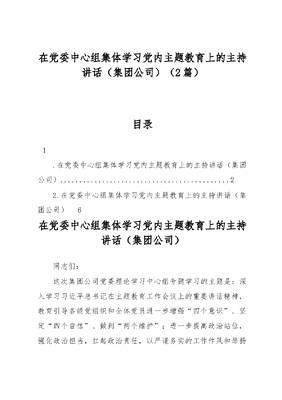 在党委中心组集体学习党内主题教育上的主持讲话(集团公司)(2篇)目录1.在党委中心组集体学习党内主题教育上的主持讲话(集团公司)..22.在党委中心组集体学习党内主题教育上的主持讲话(集团公司)6在党委中心组集体学习党内主题教育上的主持讲话(集团公司)同志们:这次集团公司党委理论学习中心组专题学习的主题是:深入学习习近平总书记在主题教育工作会议上的重要讲话精神,教育引导各级党组织和全体党员进一步增强四个意识、坚定四个自信、做到两个维护;进一步提高政治站位,强化政治担当,扛起政治责任,以严谨务实的工作作风和昂扬奋进的精神状态,坚持高标准高质量开展好主题教育;进一步弘扬伟大建党精神,牢记三个务必,更加自觉地投身集团公司高质量发展实践,不断汇聚实现强企兴业、振兴突破的强大合力。参加今天会议的有集团公司党委班子成员;总部各部(室)主要负责同志和各公司主要领导。今天会议共有三项议程。第一,请集团公司党委中心组成员围绕主题作研讨发言;第二,请总部各部(室)主要负责同志和各公司主要领导作研讨发言;第三,由我对本次专题研讨交流作总结讲话。下面,我们开始交流研讨,请大家结合这些天的所学所思,结合分管领域工作或单位实际依次谈一谈体会和收获,请大家控制发言时间。首先,进行第一项议程:请集团公司党委中心组成员围绕主题依次作研讨发言,发言顺序是x同志、x同志、x同志、x同志。xxxxxxxxxxxxxxxxxxxxxxxxx(发言完毕)接下来,进行第二项议程:总部各部(室)主要负责同志和各公司主要领导作研讨发言,发言顺序是x同志、x同志、x同志、x同志、x同志、x同志、x同志、x同志。xxxxxxxxxxxxxxxxxxxxxxxxx(发言完毕)刚才,大家紧扣研讨主题,坚持理论和实践相结合、历史和现实相贯通,结合各自分管领域、分管工作,既谈理论学习的认识体会,也讲贯彻主题教育的思路举措,作了很好的发言,听了很有启发,深受感触。从发言可以看出,通过学习,大家对习近平总书记的重要讲话精神有了较为深刻的认识,对下一步高标准开展好主题教育也形成了统一的共识。下面,结合自己的学习和思考,我谈几点认识和体会。xxxxxxxxxxxxxxxxxxxxxxxxx(发言完毕)以上是我的研讨发言材料,与大家分享,共同进步。最后,进行第三项议程,由我作总结讲话。在全党深入开展学习贯彻习近平新时代中国特色社会主义思想主题教育,是以习近平同志为核心的党中央全面贯彻党的二十大精神、动员全党同志为完成党的中心任务而团结奋斗所作的重大部署,是深入推进新时代党的建设新的伟大工程的重大部署。习近平总书记在主题教育工作会议上的重要讲话,深刻阐述了开展主题教育的重大意义和目标要求,对主题教育各项重点工作作出全面部署,具有很强的政治性、思想性、指导性,为全党开展主题教育提供了根本遵循,是一篇马克思主义纲领性文献。近日,习近平总书记在广东考察时围绕以学铸魂提出明确要求,强调坚定理想信念铸牢对党忠诚站稳人民立场。我们要牢牢把握学思想、强党性、重实践、建新功总要求,切实做到以学铸魂、以学增智、以学正风、以学促干。一要带着信仰学,在学中坚定理想信念。理论上的成熟是政治上成熟的基础,政治上的坚定源于理论上的清醒。习近平新时代中国特色社会主义思想是马克思主义中国化最新成果,是中华文化和中国精神的时代精华。回顾新时代极不寻常、极不平凡的十年,有涉滩之险,有爬坡之艰,有闯关之难,正是因为有习近平总书记的掌舵领航,有习近平新时代中国特色社会主义思想科学指引,亿万人民才有了团结奋斗的主心骨,有了思想上的定盘星、行动上的指南针。我们要坚持把学习习近平新时代中国特色社会主义思想放到马克思主义中国化的历史进程中去领会,不断增进对党的创新理论的政治认同、思想认同、理论认同、情感认同,做好深化、内化、转化工作,始终从思想上正本清源、固本培元,努力在学思践悟中筑牢信仰之基、补足精神之钙、把稳思想之舵。二要带着感情学,在学中铸牢对党忠诚。方向正确,才能行稳致远。我们要坚持读原著、学原文、悟原理,深学笃行习近平新时代中国特色社会主义思想,更加深刻领悟两个确立的决定性意义,不断增强四个意识、坚定四个自信、做到两个维护,不断提高政治判断力、政治领悟力、政治执行力,筑牢对党绝对忠诚的思想根基,始终在思想上政治上行动上同以习近平同志为核心的党中央保持高度一致。要切实把对党忠诚在落实在具体行动中,不折不扣执行党中央的决策部署和市委市政府的工作要求,做到总书记有号令、党中央有部署、市委政府有要求、集团公司有行动,确保各项工作沿着正确政治方向前进,真正以实际行动和成效践行对党忠诚。三要带着初心学,
