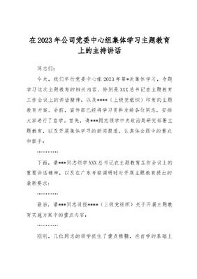 在2023年公司党委中心组集体学习主题教育上的主持讲话同志们:今天,我们举行党委中心组2023年第*次集体学习,专题学习这次主题教育的相关内容,特别是XXX总书记在主题教育工作会议上的讲话精神,以及*(上级党组织)印发的主题教育方案。会前,宣传部已经将学习资料发给各位同志,安排大家进行了自学。首先,请同志领学中央政治局研究部署主题教育,以及开展集体学习的新闻报道,认真体会题中的重点和抓手:…………下面,请同志领学XXX总书记在主题教育工作会议上的重要讲话精神,以及在广东考察调研时对开展主题教育提出的最新要求:…………最后,请同志通报*(上级党组织)关于开展主题教育实施方案中的重点内容:…………刚刚,几位同志的领学抓住了重点精髓,在自学的基础上加入了很多思考,在领学中真正起到了引领作用,而不是单纯地读稿子,这一点在今后的中心组学习中要传承下去。我们知道,开展学习贯彻XXX思想主题教育,是2023年党的建设的重大任务。正如XXX总书记强调的那样,我们要以这次主题教育为契机,加强党的创新理论武装,不断提高全党马克思主义水平,不断提高党的执政能力和领导水平,为奋进新征程凝心聚力,踔厉奋发、勇毅前行,为全面建设社会主义现代化国家、全面推进中华民族伟大复兴而团结奋斗。**单位在经历了三年疫情防控造成的*、*等发展困局之后,2023年是一次重生的机会。但同时我们也清醒地看到,诸多的新问题和老问题摆在我们面前需要彻底解决。应该怎么解决呢?单靠一腔热情是不行的,还要有科学的方法。而最科学最有效的方法,就是我们党的创新理论中贯穿的思想方法和工作方法。所以说,这次主题教育恰当其时,是我们再续辉煌的重要契机。下面,我们开始交流研讨,请大家结合这几天的自学和刚刚的领学,结合单位发展实际谈一谈自己的体会和收获。首先,请同志发言。刚才,几位同志的发言非常深刻。能够明显感受到,大家对于开展主题教育是有信心的。但客观地说,这一次学习贯彻XXX思想主题教育,与之前开展过的100周年学习教育、不忘初心、牢记使命主题教育、两学一做学习教育等相比,难度更大、要求更严、标准更高,我们必须全面深入地带着我们的发展任务和工作职责投身进去,必须真正吃透用好党的创新理论,才能取得实实在在的效果。下面,针对我们领导班子成员如何更好地在主题教育中发挥表率作用,我提四点意见:一是领导干部要在学习成果转化上作表率。党的十八大以来,我们党委组织的政治理论学习越来越密集,学习形式不断创新,研讨交流深度不断加大。特别是最近几年,无论是党委理论学习中心组,还是各类培训班,各位领导都能做到积极主动参加,撰写的心得体会、每个人的学习记录也都很规范,质量很高。这次主题教育,不仅要求学深悟透XXX思想,还要求把握这一思想的世界观、方法论和贯穿其中的立场观点方法,在学习运用上提出了更高的要求。对此,我们要深入结合年初制定的战略目标和当前的发展实际,结合我们每个人分管的工作,结合我们自己最真实的思想状态,把六个必须坚持等方法研究透,实实在在地用XXX思想的精髓要义解决具体问题。我说的这个具体问题,既包括正在干的各类工作任务,也包括如畏难心理、好人主义等思想问题。在这次主题教育推进的全过程当中,我们每一名领导在每一次学习之后都要提出至少一个以学习成果解决具体问题的思路方法。学习的目的在于运用,没有实际作用的学习等于白学,只有产生了作用并显露出来,才能称得上内化于心、外化于行。二是领导干部要在调研的有效性上作表率。这些年我们几乎每年都要组织一次综合性的调研活动,即便是在疫情期间,各位领导以电话会议的形式了解情况、作出指导也一直没有中断。从实际效果上来看,我们单人单骑随机性的调研效果比较好,为什么?因为这是奔着问题去的,去了就直接了解情况、现场办公,直接帮助协调各类关系,手把手地教、面对面地督促,直至问题解决。但是,每次的综合性调研,在效果上却差强人意,这又是为什么?专门组建调研团队、制定调研计划、领导带队开展的调研为什么做不好?最根本的问题,在于这类调研太注重形式了,太注重宣传了,太注重做了什么而不是解决了什么。上周,我们单位党的建设工作领导小组召开了专门会议,对党中央关于大兴调查研究的部署进行了学习,并确立了**个调研课题,各位领导也都领了题。这周,相关部门组建的调研小组基本到位,那么接下来,各位领导就要带队下去开展调研了。应该说,我们调研组的配备是很强的,抽调的也都是各业务部门最精干的力量,经验非常丰富。他们唯一欠缺的,就是紧盯效果开展调研,这也是我们在座的各位领导应该特别关注的,要把握好方向、把握好准头儿,去一个单位就要发现一批问题、解决一批问题。三是领导干部要在问题检视整改上作表率。这次主题教育一个最重要的动作,就是查找问题、作出整改。应
