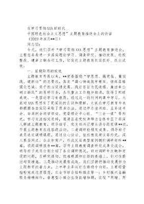 在学习贯彻XXX新时代中国特色社会主义思想主题教育推进会上的讲话(2023年8月**日)同志们:今天,我们召开学习贯彻XXX思想主题教育推进会,主要任务是进一步落实理论学习、调查研究、推动发展、检视整改、建章立制各项工作,切实把主题教育抓实抓好、抓出成效。一、前期取得的成效主题教育开展以来,**党委围绕学思想、强党性、重实践、建新功的总要求,落实凝心铸魂筑牢根本、锤炼品格强化忠诚、实干担当促进发展、践行宗旨为民造福、廉洁奉公树立新风的目标任务,各项重点工作稳步推进,取得了积极成效。一是理论学习有收获。经过这一段时间的集中学习,大家对XXX思想有了更深刻的认识和理解。大家在学习教育中也都根据各自实际采取了很多办法,通过举办读书班、业务读书会、每周例会领学领读、党委理论中心组、三会一课等形式,学习交流指定资料,邀请县委党校讲师为全体中层干部深入解读主题教育,领导班子、党支部书记带头讲专题党课**次,开展主题教育在线答题活动。二是调研检视有成果。领导班子成员选定调研课题,通过谈心谈话、征求意见建议等形式,深入基层网点、企业和商户,形成反面典型案例剖析调研材料**篇,领题调研报告**篇,召开主题教育调查研究成果交流会,领导班子成员分别介绍了各自调研情况,针对调研中反映和发现的问题,在研究透彻、找准根源和症结的基础上,针对性提出对策措施。三是推动发展有成效。我们坚持把推动发展作为主题教育的着力点,上半年业务运行态势稳中向好,主要经营指标完成进度理想,在全市综合指标排名第一;乡村振兴金融服务精耕细作,普惠型小微企业贷款增加额,实现两增、两控;普惠金融水平有效提升,完成*个智慧网点建设,持续深入开展金融服务专员驻乡包村工作;员工队伍建设取得进展,建立了财务、运营、金融市场、法律事务、等九类专业储备人才库,柜员和客户经理等级评定制度体系初步形成。总体看,学习贯彻XXX思想主题教育对做好中心工作起到了积极的促进作用。二、前期存在的问题上述成效的取得,与**党委的坚强领导,各党支部的高度重视和辛勤努力分不开。同时,我们也要清醒地看到,我们与中央、省**党委和中心党委关于主题教育的要求、与学思想、强党性、重实践、建新功的总要求还存在一定差距,主要表现在以下几个方面:一是部分党员干部的思想认识还不到位。少数党员干部对开展主题教育的重大意义和内涵理解得还不够深刻,有的还停留在过去的惯性思维中,没有更好地把自己摆进去、把思想摆进去、把工作摆进去,主题教育目标树得不明确或者有偏差。二是学习的主动性、积极性没有充分调动起来。少数部门和党员干部主动性、紧迫感还不强,积极性还没有充分调动起来,各项任务落实的进度还没有完全跟上。三是对五个贯穿始终要求的把握还不准确。有的部门觉得按照安排的集中学习研讨完成了,学习教育就算是完成了。没有做到持之以恒学、一以贯之学;有的没有做到边学边查边改,将立行立改与建章立制相结合。三、下一步工作部署7月20日,中央召开学习贯彻XXX思想主题教育整改整治工作推进会。会议强调,要深入学习贯彻XXX关于主题教育系列重要讲话和重要指示批示精神,提高政治站位、强化政治担当,坚持边学习、边对照、边检视、边整改,把问题整改贯穿主题教育始终。7月27日,XXX在四川考察时强调,要对主题教育的实效进行科学、客观评估。检验理论学习成效,检验调查研究成效,检验推动发展成效,检验检视整改成效,检验干部队伍教育整顿成效,要开好领导班子专题民主生活会和基层党组织组织生活会,结合学查改开展批评和自我批评。8月11日,省**党委召开**主题教育工作推进会,*书记在会上强调,要把理论学习、调查研究、推动发展、检视整改、组织领导贯穿始终。高质量开好主题教育专题民主生活会和组织生活会,会前要做好理论学习、征求意见、谈心谈话、检视梳理问题等环境工作,认真撰写对照检查材料。要按照省**党委要求,做好主题教育全面自查评估工作,既总结经验、梳理成效,又要查漏补缺、改进提高。同志们,距离第一批主题教育还剩不到20天时间,我们要按照中央和省**党委主题教育工作推进会要求,认真进行总结和梳理,重点做好以下五项工作。(一)理论学习方面。领导班子和全体党员干部要按要求做好学习笔记,各党支部在组织生活会召开前,组织全体党员开展一次理论学习,重点学习XXX在主题教育工作会议上的重要讲话,跟进学习XXX最新重要讲话和文章。(二)调查研究方面。领导班子要对照个人调研报告发现的问题,制定问题清单,明确整改措施,要捋清业务情况,梳理问题脉络,把握客户真实需求,了解员工内心期盼,确保问题全部整改到位,涉及到调研的相关部室要定期向主题教育领导小组办公室报送进展台账。(三)推动发展方面。我们要通过这次主题教育,找准制约**农信改革发展中的困点和难点问题,在存款结构优