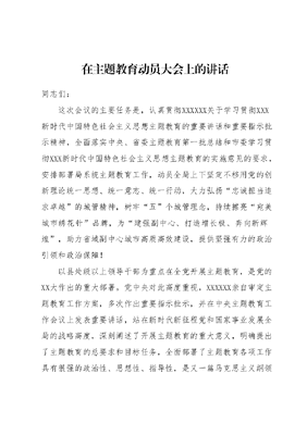 在主题教育动员大会上的讲话同志们:这次会议的主要任务是,认真贯彻XXXXXX关于学习贯彻XXX新时代中国特色社会主义思想主题教育的重要讲话和重要指示批示精神,全面落实中央、省委主题教育第一批总结和市委学习贯彻XXX新时代中国特色社会主义思想主题教育的实施意见的要求,安排部署局系统主题教育工作,动员全局上下坚定不移用党的创新理论统一思想、统一意志、统一行动,大力弘扬忠诚担当追求卓越的城管精神,树牢五个城管理念,持续擦亮宛美城市绣花针品牌,为建强副中心、打造增长极、奔向新辉煌,助力省域副中心城市高质高效建设,提供坚强有力的政治引领和政治保障!以县处级以上领导干部为重点在全党开展主题教育,是党的XX大作出的重大部署。党中央对此高度重视,XXXXXX亲自审定主题教育工作方案,多次作出重要指示批示,并在中央主题教育工作会议上发表重要讲话,站在新时代新征程党和国家事业发展全局的战略高度,深刻阐述了开展主题教育的重大意义,明确提出了主题教育的总要求和目标任务,全面部署了主题教育各项工作具有很强的政治性、思想性、指导性,是又一篇马克思主义纲领性文献,为全党深入开展主题教育提供了方向指引和根本遵循。在主题教育第一批总结暨第二批部署会议上,XX同志强调,要以高度负责的精神把第二批主题教育科学谋划好、精心组织好对第二批主题教育进行了系统安排;9月7日上午,省委对标中央精神,对全省第二批主题教育工作作出部署,楼书记明确提出了五个方面的推进要求;9月9日上午,市委召开了学习贯彻XXX新时代中国特色社会主义思想主题教育工作会议,XXX书记也提出五个方面的要求。对照中央、省委、市委的要求,局属各单位、机关各科室一定要认真学习领会,确保主题教育取得扎实成效。下面就开展好局系统主题教育工作,强调四点意见。一、提高政治站位,深刻领会主题教育工作重大意义在全党深入开展学习贯彻XXX新时代中国特色社会主义思想主题教育,是党中央全面贯彻党的XX大精神、动员全党同志为完成党的中心任务而团结奋斗所作的重大部署,是深入推进新时代党的建设新的伟大工程的重大部署,对于维护党的团结统一、激励党员干部积极担当作为、始终保持党同人民群众血肉联系、推进党的自我革命具有十分重要的意义。局系统各级党组织和广大党员干部要切实增强开展主题教育的思想自觉、政治自觉和行动自觉,深刻把握其重大考量、深远意义,矢志不渝沿着XXXXXX指引的方向奋勇前进!(一)这是拥戴核心、捍卫核心的具体行动。伟大时代,必有自己的杰出人物;伟大事业,必有众望所归的领袖指引!党的十八大以来,面对世所罕见、史所罕见的风险挑战,XXXXXX团结带领全党全军全国各族人民顺利实现了第一个百年奋斗目标,开启了全面建设社会主义现代化国家新征程,开创了新时代十年的伟大变革,中华民族伟大复兴进入了不可逆转的历史进程!这一切的根本,在于有XXXXXX的掌舵领航,有XXX新时代中国特色社会主义思想的科学指引!实践充分证明,两个确立是推动党和国家事业取得历史性成就、发生历史性变革的决定性因素,是党和人民战胜一切艰难险阻、应对一切不确定性的最大确定性、最大底气、最大保证!但实际工作中,仍有一些党员干部信仰信念产生动摇,与党和人民离心离德,在同党中央保持高度一致上调门高、表态多、行动少,等等。这些问题,尽管发生在少数党员干部身上,但危害极大,必须从根源上加以解决。开展这次主题教育,就是要教育引导局系统广大党员干部进一步深刻领悟两个确立的决定性意义,把坚决做到两个维护作为最高政治原则和根本政治责任,切实增强忠诚核心、拥戴核心、维护核心捍卫核心的政治自觉、思想自觉、行动自觉,不断在新征程上奋勇争先、更加出彩!(二)这是思想建党、理论强党的必做之功。拥有马克思主义科学理论指导,是我们党坚定信仰信念、把握历史主动的根本所在。党的十八大以来,XXXXXX坚持把马克思主义基本原理同中国具体实际相结合、同中华优秀传统文化相结合,以巨大的政治智慧和理论勇气,创立了XXX新时代中国特色社会主义思想,实现了马克思主义中国化时代化新的飞跃,为实现中华民族伟大复兴提供了行动指南。但要看到,理论武装的任务仍然任重道远,一些党员干部之所以跟不上XXX的步伐、党中央的节拍,判断形势不准确、应对风险不主动、处理复杂局面顾此失彼等等,大多都是由于对党的创新理论领悟得不深不透、一知半解,没有真正掌握精髓、把准要义。党的XX大以来,XXXXXX又提出了许多新思想新观点,进一步丰富了XXX新时代中国特色社会主义思想,对这方面的学习贯彻,我们必须抓紧抓牢。理论创新每前进一步,理论武装就要跟进一步。开展这次主题教育,就是要推动学习贯彻XXX新时代中国特色社会主义思想持续走深走实走心,教育引导局系统广大党员干部加深对XXX新时代中国特色社会主义思想的学习理解,