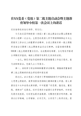 在XX党委(党组)第二批主题启动会暨主题教育领导小组第一次会议上的讲话巡回指导组的各位领导、同志们:今天我们召开XX党委(党组)第二批主题启动会暨主题教育领导小组第一次会议,主要目的是深入学习贯彻XXXXXX在中央主题教育工作会议上的重要讲话精神、全省主题教育第一批主题教育总结会议暨第二批主题教育启动会议精神,全面安排部署我XXX第二批主题教育重点任务,全流程谋划部署、全过程有序推进全周期巡回监测,确保主题教育取得扎扎实实的成效。一会儿,XX巡回指导组XX领导还要做重要工作指示要求,我代表XX常委会,先做几点工作要求。第一,深刻学习领会XXXXXX重要讲话精神,增强高质量推进第二批主题教育的政治责任感和紧迫感同志们,在全党深入开展学习贯彻XXX新时代中国特色社会主义思想主题教育,是贯彻落实党的XX大精神的重大举措。要认真落实党中央和省委决策部署,牢牢把握学思想、强党性、重实践、建新功总要求,把学思想作为首要任务贯穿始终,对标党风要求找差距,对标党性要求查根源,对照党纪要求明举措,确保在以学铸魂、以学增智、以学正风、以学促干上取得实效。要更加注重分类指导,立足客观实际,找准着力点和发力点,因地制宜、因人施策,精准科学作出安排,改进工作方式,切实增强主题教育的针对性、实效性。要坚持系统思维,在深入学习贯彻党的XX大精神和高标准落实主题教育中实现新提升,将学习贯彻党的XX大精神和XXXXXX关于主题教育的系列重要讲话精神作为当前和今后一个时期的首要政治任务,不断创新学习宣传方式,构建系统全面持续的学习宣传格局,引导广大党员干部自觉把两个确立作为第一立场、第一原则、第一要求和第一检验,把XXX新时代中国特色社会主义思想转化为坚定理想、锤炼党性和指导实践、推动工作的强大力量,把两个维护作为最高政治原则和最根本政治规矩,始终沿着党的XX大精神指引的方向奋勇前行。第二,始终坚持以人民为中心的发展思想,增强高质量推进主题教育的精准性和实效性认真解决实际问题,坚持人民至上,围绕补短板、防风险、通堵点,聚焦群众急难愁盼问题,把理论学习、调查研究、检视整改同强化宗旨意识、呼应群众要求、推动解决问题结合起来,深入开展调查研究,实打实地研究提出思路办法和政策举措。聚焦当前工作的重点难点要点,特别是要持续激发抓党建促乡村振兴活力实现新成效,坚持四个不摘,加强村级干部教育培训引导更多优秀人才到村工作,汇聚振兴力量。持续做好防返贫动态监测工作,推动脱贫攻坚成果与乡村振兴有效衔接更紧密。紧扣村级集体经济XXX倍增目标,优化一村一策一村一业,着力打造村社企融合发展模式,特别是在融资类项目上下足功夫,确保推进以实体化发展促进集体经济可持续增收目标,保障倍增目标顺利实现。要奋力办好民生实事实现新惠及,对标XX委、XX政府XX工作要求,持续开展进千家问民愿办实事实践活动,按照轻重缓急原则不断破解难题、办理实事用力抓好培训和就业工作,强化就业技能培训、组织化劳务输出确保就业率动态保持在XX%以上,脱贫户、监测户、搬迁户就业帮扶率达XX。时刻重点关注特殊困难群体,按照干部关怀、政策兜底、多方参与原则,继续落实好干部包保、政策兜底和社会帮扶。要坚持发挥党员先锋队作用,推进农村人居环境整治工作,健全村党支部+村寨党小组+党员联系户的村党组织体系,充分利用新时代文明实践站(点)功能,深入开展精神文明建设,推广XXX文明行动,集中打造XXX个党建引领乡村治理村寨示范点,以示范带动强化全域乡村治理水平提升。第三,深刻掌握XXX新时代中国特色社会主义思想的世界观和方法论,增强高质量推进主题教育的科学性和系统性要坚持一切从实际出发,牢牢把握主题教育基调,抓好主题教育规定动作,坚决防止形式主义、官僚主义,切实以群众的获得感、幸福感、安全感检验主题教育成效。XX委巡回督导组将按照党中央和省委部署要求,坚持与XX同题共答、同频共振,把握职责定位、抓住工作重点、严守政治纪律,把巡回督导工作寓于帮助服务之中,深入了解情况,提出工作建议,共同推动主题教育走深走实。要将主题教育工作业务和全XX经济社会发展的重点任务串联起来,全面贯彻落实新时代党的建设总要求和组织路线持续紧扣XX委XXX工作主线,持续凝聚推动高质量发展的强大合力我就讲这么多,谢谢!