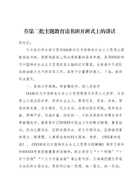 在第二批主题教育读书班开班式上的讲话同志们:今天我们举办学习贯彻XXX新时代中国特色社会主义思想主题教育读书班,是贯彻落实上级决策部署的具体举措,是用XXX新时代中国特色社会主义思想武装头脑的迫切需要,也是提升干部队伍政治能力水平的务实之举,具有十分重要的意义。下面,我讲四点意见。一、坚持以学铸魂,带着嘱托学,深入系统学XXX新时代中国特色社会主义思想贯通马克思主义哲学、马克思主义政治经济学、科学社会主义,贯通历史、现在、未来,贯通改革发展、安全稳定、民主法治、治党治国各领域,是系统全面、逻辑严密、内涵丰富、内在统一、不断发展的科学理论体系带着嘱托学,就是要牢记XXXXXX对政法工作的殷切期望、重要指示,把自己摆进去、把职责摆进去、把工作摆进去,坚持读原著学原文、悟原理,认真研读党的XX大报告、党章、《XXX著作选读》、《XXX新时代中国特色社会主义思想专题摘编》等学习材料和XXXXXX考察安徽重要讲话精神,既全面学习十个明确十四个坚持十三个方面成就等主要内容,又准确把握世界观方法论和立场方法,更好用以统一思想、统一意志、统一行动。要提高政治站位深入系统学,从世界百年未有之大变局的角度、中华民族伟大复兴的角度、中国式现代化的角度、科学社会主义的角度、党的自我革命的角度深刻感悟XXX新时代中国特色社会主义思想的强大真理力量和实践伟力,深刻感悟XXX新时代中国特色社会主义思想的强大真理力量和实践伟力,深刻领会XXXXXX作为党中央的核心、全党的核心的理论逻辑、历史逻辑、实践逻辑,不断增强对党的价值追求和前进方向的高度政治认同,更加坚定自觉捍卫两个确立、做到两个维护。二、坚持以学增智,带着任务学,带着问题学加强理论武装、深化理论学习是主题教育的重中之重,是主题教育的逻辑起点和重要基石,举办读书班既是贯彻落实XXXXXX重要讲话精神和党中央部署要求的具体举措,也是难得的学习机充电机会。全体干部队伍要在此次读书班的学习过程中边学边悟知其然更知其所以然,以如切如磋、如琢如磨的态度,找到攻克难点堵点、解决矛盾问题、防范化解重大风险、推动事业高质量发展的答案,把学习成果转化为推动发展的能动性、自觉性三、坚持以学正风,端正态度学,带领带头学领导干部和关键少数要走在前,做示范,带动全体干部队伍往深里走、往实里走、往心里走。要端正学习态度,自觉用XXX新时代中国特色社会主义思想改造主观世界,深刻领会这一思想关于坚定理想信念、提升思想境界、加强党性锻炼等一系列要求,始终保持共产党人的政治本色。要通过学习进一步牢固树立以人民为中心的发展思想,坚持一切为了人民、一切依靠人民,着力解决干部队伍急难愁盼问题,把惠民生、暖民心、顺民意的工作做到干部队伍的心坎上,不断增强干部队伍的获得感、幸福感、安全感。要通过学习进一步改进工作作风,持续纠治四风,坚决抵制形式主义、官僚主义,做到公正用权、依法用权为民用权、廉洁用权,推动形成清清爽爽的同志关系、规规矩矩的上下级关系、亲清统一的新型政商关系,当好良好政治生态的引领者、营造者、维护者。四、坚持以学促干,带着责任学,联系实际学抓好理论学习的最终落脚点体现在推动工作上,开展主题教育,归根结底是要推动事业高质量发展。要把理论学习、交流研讨同抓发展、保稳定、提质效相结合,与统筹安全与发展相结合与高质量完成年度工作目标任务相结合,做到主题教育与岗位业务同步推进,从严从细抓好防风险、保安全、护稳定、促发展各项工作落实,真正把主题教育工作成效转化为维护国家安全、社会安定,推动公平正义的动力。最后,希望大家珍惜学习机会,严格遵守读书班的规定要求真正沉下心来学、静下心来悟,力争认识高一层、感悟深一层,努力在以学铸魂、以学增智、以学正风、以学促干方面取得实实在在的成效。