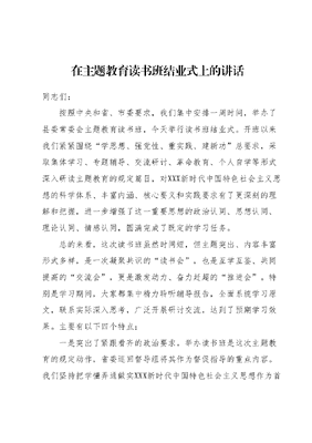 在主题教育读书班结业式上的讲话同志们:按照中央和省、市委要求,我们集中安排一周时间,举办了县委常委会主题教育读书班,今天举行读书班结业式。开班以来我们紧紧围绕学思想、强党性、重实践、建新功总要求,采取集体学习、专题辅导、交流研讨、革命教育、个人自学等形式深入研读主题教育的规定篇目,对XXX新时代中国特色社会主义思想的科学体系、丰富内涵、核心要义和实践要求有了更深刻的理解和把握,进一步增强了这一重要思想的政治认同、思想认同、理论认同、情感认同,圆满完成了既定的学习任务。总的来看,这次读书班虽然时间短,但主题突出、内容丰富形式多样,是一次凝聚共识的读书会,也是互学互鉴、共同提高的交流会,更是激发动力、奋力赶超的推进会。特别是学习期间,大家都集中精力聆听辅导报告,全面系统学习原文,联系实际深入思考,广泛开展研讨交流,达到了预期学习效果。主要有以下四个特点:一是突出了紧跟看齐的政治要求。举办读书班是这次主题教育的规定动作,省委巡回督导组将其作为督促指导的重点内容。我们坚持把学懂弄通做实XXX新时代中国特色社会主义思想作为首要政治任务,在主题教育动员部署会后的第二天就举办读书班,就是表明我们紧跟看齐的政治态度和立说立行的政治自觉,以实际行动落实政治要求,坚决做到党中央有号召、省市委有部署,我们就第一时间见行动。通过这次读书班,既提高了政治能力、增强了思想定力,更坚定了紧跟核心、追随核心的政治自觉和行动自觉。二是增强了入心见行的能力本领。在学习过程中,大家始终保持饱满的政治热情和良好的精神状态,深入学习研读党的XX大报告、党章、《XXX著作选读》《XXX新时代中国特色社会主义思想学习纲要》等重要著作,认真聆听党校专家教授的精彩辅导,静下心来学习、潜下心来思考,进一步加深了对XXX新时代中国特色社会主义思想的理解和把握,提升了真学、真懂、真信的理论修养,增添了科学谋划、精准实施的思路举措,运用党的创新理论指导实践、推动工作的能力和水平不断提高。三是锤炼了求真务实的优良作风。坚持把弘扬革命传统教育作为读书班一项重要内容,前往吴焕先烈士纪念馆现场研学,缅怀革命先烈,追忆红色故事,接受了深刻的红色文化熏陶和革命精神洗礼。同志们都非常重视和珍惜这次读书班,县级领导以身作则、率先垂范,在工作繁忙的情况下,积极克服时间紧、任务重的工学矛盾,认真学习体悟、深入交流研讨,真正从XXX新时代中国特色社会主义思想中汲取蕴含的领导方法、思想方法、工作方法,通过学习交流,提高了学在深处、谋在实处的理论修养,砥砺了勇于担当、敢于斗争的品格精神,锤炼了严于律己、清正廉洁的坚强党性。四是彰显了学用结合的高度自觉。交流研讨是最能实现互学互鉴、相互启发、共同提高的方式。在深入学习的基础上,我们先后开展了4次专题研讨,34名县级领导围绕学习贯彻XXX新时代中国特色社会主义思想这个主题,紧密结合自身学习领悟和分管工作实际,交流学习体会、展示思想收获、畅谈工作打算,特别是在思路举措、推动落实、工作作风等方面谈了许多好的建议和想法,体现了责任担当,展现了决心信心,进一步凝聚了共识、开拓了思路、振奋了精神,为全面落实全县思路目标加快建设社会主义现代化幸福美好新泾川打牢了思想根基。这次主题教育不划阶段、不分环节,读书班只是一个良好的开端,读书班虽告一段落,但是学习永远在路上。下一步,全县上下要继续围绕主题教育的总要求和具体目标,紧密结合工作实际,找准结合点,狠抓关键点,把理论学习、调查研究、推动发展、检视整改有机融合、一体推进,持续在以学铸魂、以学增智以学正风、以学促干上下功夫、见实效,不断推动主题教育走深走实走细,确保取得实实在在的效果。今天读书班就要结束了,借此机会,我就抓好主题教育下一步工作,提几点要求。一要以学铸魂,淬炼无坚不摧的钢铁之躯。这次主题教育总要求的第一句就是学思想,各乡镇各部门要坚持不懈用XXX新时代中国特色社会主义思想凝心铸魂,落实第一议题制度,深化五学联动方法,教育引导广大党员干部在深化学习中自觉经受思想淬炼、精神洗礼,常修对党忠诚的首要政治品格坚定对马克思主义的信仰、对中国特色社会主义的信念、对实现中华民族伟大复兴中国梦的信心,自觉做XXX新时代中国特色社会主义思想的坚定信仰者和忠实实践者。举办这次读书班只是学习的一种形式,会后,大家仍然要坚持以自学为主,列出学习清单沉下心来学、静下心来悟,原原本本、逐词逐句学习主题教育指定书目,全面掌握这一重要思想的基本观点、科学体系、丰富内涵,系统把握两个确立的理论逻辑、历史逻辑、实践逻辑,深刻领悟两个确立的决定性意义,不断提高政治判断力、政治领悟力、政治执行力,增强四个意识、坚定四个自信做到两个维护,始终在思想上政治上行动上同以XXX同志为核心的党中央保持高度一致。二要