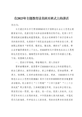 在2023年主题教育读书班开班式上的讲话同志们:今天我们举办学习贯彻XXX新时代中国特色社会主义思想主题教育读书班,是落实党中央和省委部署的实际行动,是深入学习贯彻党的创新理论的重要载体,是充分发挥领导干部示范带头作用的具体体现,也是提升干部队伍政治能力水平的务实之举。要按照主题教育学思想、强党性、重实践、建新功总要求,带头在学懂弄通做实上下功夫,把XXX新时代中国特色社会主义思想转化为坚定信念、锤炼党性和指导实践、推动工作的强大力量。下面,我强调几点意见。一、坚持以学铸魂,带着嘱托学,深入系统学要带着嘱托学,就是要牢记XXXXXX对政法工作的重要指示,把自己摆进去、把职责摆进去、把工作摆进去,坚持读原著、学原文、悟原理,认真研读党的XX大报告、党章、《XXX新时代中国特色社会主义思想专题摘编》等学习材料和XXXXXX考察安徽重要讲话精神,既全面学习十个明确十四个坚持十三个方面成就等主要内容,又准确把握世界观、方法论和立场方法,更好用以统一思想、统一意志、统一行动。要深入系统学,从世界百年未有之大变局的角度、中华民族伟大复兴的角度、中国式现代化的角度、科学社会主义的角度、党的自我革命的角度深刻感悟XXX新时代中国特色社会主义思想的真理力量和实践伟力。广大党员、干部特别是领导干部,要做好学习贯彻XXX新时代中国特色社会主义思想的深化、内化、转化工作,从思想上正本清源、固本培元,筑牢信仰之基、补足精神之钙、把稳思想之舵,诚,以实际行动坚定捍卫两个确立、坚决做到两个维护。二、坚持以学增智,带着任务学,带着问题学加强理论武装、深化理论学习是主题教育的重中之重,大家要把握此次难得的学习机会,始终把增长本领、增长才干、增长能力作为出发点,从党的科学理论中悟规律、明方向、学方法、增智慧,切实把发展本领、兴党本领、强国本领学到手。要带着任务学,以如切如磋、如琢如磨的态度,在全面学习的基础上,结合自身工作,干什么就重点学什么,缺什么就重点补什么在融会贯通、学深悟透上求实效,真正把马克思主义看家本领学到手。要带着问题学,在学习过程中边学边悟,知其然更知其所以然,找到攻克难点堵点、解决矛盾问题、防范化解重大风险的答案,把学习成果转化为推动发展的能动性、自觉性。三、坚持以学正风,端正态度学,带领带头学领导干部和关键少数要走在前,做示范,带动全体干部队伍往深里走、往实里走、往心里走。要端正学习态度,专心致志投入读书班,坚持提高站位学、循迹溯源学、交流研讨学,在认真自学、深入思考的基础上,联系工作实际相互交流、深入研讨,既对事关发展的重大问题提出真知灼见,又对分管领域提出具体办法,来一场思想大解放、思维大碰撞、难题大攻坚,在互学互鉴中形成一批指导实践的金点子,共同推动各项事业再上新台阶。要通过学习进一步改进工作作风,持续纠治四风,坚决抵制形式主义、官僚主义,做到公正用权、依法用权、为民用权、廉洁用权,推动形成清清爽爽的同志关系规规矩矩的上下级关系、亲清统一的新型政商关系,当好良好政治生态的引领者、营造者、维护者。四、坚持以学促干,带着责任学,联系实际学抓好理论学习的最终落脚点体现在推动工作上,开展主题教育,归根结底是要推动事业高质量发展。要把理论学习、交流研讨同抓发展、保稳定、提质效相结合,与统筹安全与发展相结合与高质量完成年度工作目标任务相结合,做到主题教育与岗位业务同步推进,从严从细抓好防风险、保安全、护稳定、促发展各项工作落实,真正把主题教育工作成效转化为维护国家安全、社会安定,推动公平正义的动力。最后,希望大家珍惜学习机会,严格遵守读书班的规定要求真正沉下心来学、静下心来悟,力争认识高一层、感悟深一层,努力在以学铸魂、以学增智、以学正风、以学促干方面取得实实在在的成效。