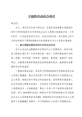 主题教育动员会讲话同志们:今天,我们召开全体干部大会,主要是安排部署全面推进全局学习贯彻XXX新时代中国特色社会主义思想主题教育活动。今年4月3日,中央政治局召开会议,决定从4月开始,在全党自上而下分两批开展学习贯彻XXX新时代中国特色社会主义思想主题教育。一、着力增强主题教育的针对性和实效性党中央对这次主题教育的总要求作出了明确规定,省委印发的《实施方案》作了全面具体安排,我们一定要严格按照中央的统一部署,牢牢把握学思想、强党性、重实践、建新功的总要求,全面落实省委和省政府党组的安排和要求,抓细抓实主题教育各项任务落实。一要强化理论武装。开展学习贯彻XXX新时代中国特色社会主义思想主题教育,根本任务是深入学习贯彻新时代中国特色社会主义思想,锤炼忠诚干净担当的政治品格,团结带领全国各族人民为实现伟大梦想共同奋斗。全局党员干部要在原有学习的基础上取得新进步、达到新高度,要进一步深入学习党的XX大报告和党章,学习《XXX著作选读》《XXX关于学习贯彻XXX新时代中国特色社会主义思想重要论述选编》《XXX新时代中国特色社会主义思想学习专题摘编》等著作,学习XXXXXX关于扶贫工作重要论述,学习XXXXXX视察××重要讲话和八个着力重要指示精神,跟进学习XXXXXX最新重要讲话文章,加深对XXX新时代中国特色社会主义思想重大意义、科学体系、丰富内涵的理解,学深悟透、融会贯通、真信笃行,增强贯彻落实的自觉性和坚定性,提高运用党的创新理论指导实践、推动工作的能力。要坚定对马克思主义的信仰、对中国特色社会主义的信念,增强四个意识、坚定四个自信、做到两个维护,自觉在思想上政治上行动上同党中央保持高度一致,始终忠诚于党、忠诚于人民、忠诚于马克思主义,自觉做政治上的明白人、老实人,经得起风浪考验,决不能在政治方向上走偏了、走歪了、走错了,更不能当面一套背后一套,搞两面派、做两面人、当老好人,任何时候任何情况下都要确保政治上坚定、思想上清醒、态度上鲜明行动上自觉,带头贯彻执行党的路线方针政策,全面落实省委省政府决策部署,积极主动践行局党组各项决议,完成局党组安排的各项任务。二要加强全面从严治党。要认真贯彻新时代党的建设总要求把政治建设摆在首位,时刻对标对表党中央要求,坚决维护XXXXXX党中央的核心、全党的核心地位,坚决维护党中央权威和集中统一领导,切实做到党中央提倡的坚决响应,党中央决定的坚决执行,党中央禁止的坚决不做。要严守政治纪律和政治规矩真正做到个人服从组织,少数服从多数,下级服从上级,时时处处讲党性、讲原则、讲大局、讲奉献,坚决克服各种无组织无纪律、不讲规则不守规矩的行为。要加强纪律教育,引导全局党员干部熟知纪律、敬畏纪律、遵守纪律,使党纪党规转化为党员干部的日常习惯和自觉遵循,坚决防止七个有之,切实做到五个必须。要坚持把政治监督寓于日常、融入经常,及时发现和纠正政治偏差。要严格落实意识形态工作责任制,牢牢把握党对意识形态工作的领导权、管理权、话语权,切实加强对网站微信群等阵地的管理,教育引导广大党员干部自觉规范线上线下言行,弘扬主旋律,凝聚正能量,掌握主动权,坚决反对和抵制各种错误思想和言论。要加强机关政治文化建设,充分发挥优秀传统文化、革命文化和社会主义先进文化的滋养作用,组织开展内容丰富、形式多样的文化活动,引导广大党员干部带头培育践行社会主义核心价值观和××核心价值观,巩固提升精神文明创建成果。三要勇于担当负责。XXXXXX指出,好干部的一个重要标准就是敢于担当,就是要敢想、敢做、敢当,做时代的劲草、真金;就是要坚持原则、认真负责,面对大是大非敢于亮剑,面对矛盾敢于迎难而上,面对危险敢于挺身而出,面对失误敢于承担责任面对歪风邪气敢于坚决斗争。希望同志们勇于担当负责,积极主动作为,保持斗争精神,敢于直面问题,矛盾面前不躲闪,挑战面前不畏惧,困难面前不退缩,想方设法把问题解决在职责范围之内,决不能推诿塞责、敷衍了事,切实提升执行力和落实力,真正做起而行之的行动者、不做坐而论道的清谈客,当攻坚克难的奋斗者、不当怕见风雨的泥菩萨。要树立以人民为中心的发展理念,把群众观点、群众路线深深植根于思想中、具体落实到行动上,增进同人民群众的感情,自觉同人民想在一起、干在一起说真话、报真情、做实事、求实效,着力解决群众的操心事、烦心事、揪心事,以为民谋利、为民尽责的实际成效取信于民,不断增强人民群众获得感、幸福感和安全感。四要严守纪律促廉政。全局党员干部要发扬革命传统和优良作风,始终坚守自己的政治生命线,自觉遵守党章,自觉按照党的组织原则和党内政治生活准则办事,经常检视自己的思想言行不断掸去思想上的灰尘,自觉同特权思想和特权现象作斗争,坚决预防和反对腐败。要严格遵守党的各项纪律,严格落实中央八项规定及其实施细则