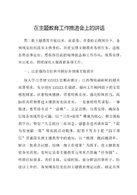 在主题教育工作推进会上的讲话第二批主题教育开展以来,在省委、市委的正确领导下,各领域党组织落实主体责任,周密安排主题教育各项任务,进展态势总体良好。要保持目前的精神状态和工作作风,统筹安排,突出重点,持续深化主题教育各项工作。一、以更强的责任担当抓好各领域主题教育深入学习贯彻XXXXXX近期在浙江、江西等地调研时的相关部署要求,充分用好XXXXXX在福建、福州工作期间留下的宝贵思想财富,怀着特殊感情、带着特殊责任、强化特殊担当,高标准高质量推进主题教育走深走实。一是继续统筹谋划、一体推进。要坚持全县一盘棋,立足县情,分类安排,确保各层级各领域有章可循,以三库+碳库基地为核心,整合现场教学点;策划矢志践行三库理念、感恩奋进再谱新篇我为发展献一策等实践活动载体;配套下发关于把四下基层贯通落实到主题教育中的通知,以梳理一批问题清单、解决一批难点问题、晾晒一批工作成果为抓手,使主题教育更务实高效。要制定县委主题教育五项重点措施任务图,明确目标要求、责任主体、完成时限。要分解县四套班子、科级以上单位、各领域基层党组织主题教育规定动作,制定具体任务细化清单,分类别分领域建立台账,做到不遗漏、不走样。每周定期召开推进会,交流商讨主题教育工作,对存在问题实行动态管理、滚动销号。要印发《指导督促事项清单》《主题教育周工作提示》,县直机关工委、县教育系统党委等主管部门加强对本行业、本系统的具体指导,使阶段任务、操作方法有据可依。二是继续以上率下、分类施策。要发挥领导干部头雁作用,压紧压实责任链,分层同步推进。县处级领导要带头下沉一线调研解决问题,同时指导所联系的乡镇、单位和挂钩联系党支部开展好主题教育,以关键少数带动绝大多数。同时,通过下沉督导、联络沟通、问题反馈等方式,全覆盖挂钩联系全县各领域118家单位,及时发现问题、纠正偏差,使各领域上下贯通、步调一致。要发挥乡镇包村干部作用,一对一指导挂钩片区、村党组织开展主题教育。县直机关单位党组织要与共建村(社区)党组织大手牵小手,共学新思想、共过主题党日、共谋发展良策。要紧盯重点环节、薄弱环节,将学习实践延伸至每个基层党组织和党员。对农村党员,着力发挥乡镇党校作用,组织开展各类培训,包村干部要对片区内行动不便党员开展送学上门,村党支部书记通过书记讲党课对村内党员进行轮训培训;对机关党员,建立机关工委导学、支部集中学、党员自学学习机制,采取线上灵活学、专题辅导学、实地沉浸学等方式,提高党员学习质效;对流动党员,驻外工委安排专人赴上海、天津等地动员部署,发放学习能量包,面对面心连心开展宣传宣讲;对两新领域党员,创新视频学习、在线打卡等方式,骨干党员以老带新、帮带新人成长;对教育系统党员开展研学实践活动,引导师生在共学共研中学真知、悟真谛;对离退休党员,组建晚霞说理宣讲小分队,进农村、进学校、进企业、进社区等宣传宣讲,推动新思想入耳入心。三是继续设岗定责、全面覆盖。激励全体党员自觉发挥先锋模范作用,让党旗在一线高高飘扬。要深化立足岗位作贡献、感恩奋进建新功活动,推行党员e报到制度,设立党员责任岗,用好用活积分制、爱心储蓄银行等方式,常态化开展五亮行动,引导全县在职党员开展扶弱济困、矛盾调解、文明创城等志愿服务,帮助协调解决问题。要结合党建聚力为民、共建美好家园活动,推广坂坑村十五三一党员联户帮带机制、试点推行党员家庭挂牌亮户行动,引导党员铭记身份、发挥先锋模范作用。持续开展学习身边榜样活动,创建党员先锋工作室,推动党员产业大户和致富能人以结对子的形式,实地提供技术指导。要构建乡镇党委、村(社区)党组织、网格党小组、党员中心户责任机制,推动微宣讲进网格、微分享进楼栋、微故事进家庭。此外,通过引导流动党员践行双向承诺、在两新领域设立党员先锋岗、塑造青老结对党建品牌等方式,确保主题教育横向到边、纵向到底,全面覆盖。二、以更实的举措紧盯重点环节任务不松劲严格对标对表上级对各领域开展主题教育的要求,在做好理论学习的深化、内化、转化,推动发展的落地、巩固、拓展,检视整改的查摆、改进、提升等各个重点环节上不断取得新成效。郡县治,天下安。县一级处在承上启下的关键环节,是发展经济、保障民生、维护稳定的重要基础,县一级的工作做好了,党和国家全局工作就有了坚实基础。主题教育中,县处级以上领导干部既要抓自身、示范带动,又要抓基层、敦促落实,树立和践行正确政绩观,确保主题教育走深走实。一是理论学习要下实功。要树立和践行正确政绩观,切实履行好职责使命,就要在理论学习上下实功,把思想和行动统一到党中央决策部署上来,不断增强政治判断力、政治领悟力、政治执行力,牢记国之大者,想问题、作
