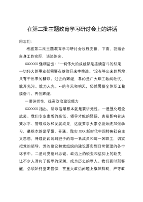 在第二批主题教育学习研讨会上的讲话同志们:根据第二批主题教育学习研讨会议程安排,下面,我结合自身工作实际,谈谈体会。XXXXXX强调指出:一切伟大的成就都是接续奋斗的结果,一切伟大的事业都需要在继往开来中推进。没有等出来的辉煌,只有干出来的精彩。过去的辉煌,靠的是广大职工敢闯敢试、敢开先河、敢为人先。**的今天和明天,仍然需要全体职工接续奋斗、再创辉煌。一要讲党性,提高政治建设能力XXXXXX指出,讲政治最根本就是要讲党性。一是强化理论武装。我们专业素质的高低、领导才能的强弱,直接影响着决策水平、管理成效和发展成果,这就要求大家必须始终加强学习,最根本的是学懂、弄通、做实XXX新时代中国特色社会主义思想,将理论武装到班子的每一名成员和每一名职工,切实把党的领导、党的建设和党组织的建设落实到日常管理的各个环节中。二是对党绝对忠诚。政治上的蜕变和信仰上的缺失,让不少人滑向了犯罪的深渊,成为历史的罪人。我们要时刻警醒,必须始终坚定信仰,在重大政治问题上旗帜鲜明,严守政治纪律,始终站稳政治立场。要深刻领悟两个维护的政治逻辑、历史逻辑、理论逻辑、实践逻辑,把坚决做到两个维护作为最高准则和根本规矩。三是增强斗争本领。我们党在内忧外患中诞生,在磨难挫折中成长,在攻坚克难中壮大。敢于斗争、敢于胜利,是中国共产党人鲜明的政治品格,也是我们的政治优势。四是树立全局观念。要进一步适应当前工作的严要求、高标准,紧紧围绕全省工作大局,紧扣高质量发展的目标任务,全面推动工作和队伍建设质量变革、效率变革、动力变革。五是严守政治纪律。在所有党的纪律和规矩中,第一位的是政治纪律和政治规矩。严明党的纪律,首要的就是严明政治纪律。二要讲担当,提高决策决断能力担当是党员干部必备的基本素质,只有拿出敢于担当、善于担当的勇气和魄力,才能提高领导决策力,增强干部决断力、强化办事执行力,推动工作持续快速发展才会步步坚实。第一,大事难事看担当。就是面对矛盾要敢于迎难而上而不是当鸵鸟,面对危机要敢于挺身而出而不是当逃兵,面对失误要敢于承担责任而不是找替身。第二,无私无畏敢担当。一是关键少数作表率。有多大的责任,就应该有多大的担当;有多大的担当,才能成就多大的事业。担当必须从领导干部做起。只有头雁效应发挥出来了,其他人才能跟着干,跟着担当。二是锐意进取谋发展。当前,我们正处在持续发力、高质量发展的最关键时期,不进则退、慢进也退,非进不可。在这里,我再讲一下经济发展问题,必须牢牢把握经济发展这个基本点。经济发展不能松、松不得,松下来会不可想象。要保持冲劲,要有不破楼兰终不还的气势,以时不我待的紧迫感谋求发展的使命感,加快完成目标任务,在激情奋进中攻坚克难。三是认准之后大胆干。说一千道一万,要干。不干,半点马克思主义都没有。谋定而后动,只要思考好了,就要胆子更大一些,步子更快一些。当前,一些人见事不快、行动迟缓,对发展的机遇认识慢,对上面的政策理解慢,对新生事物的接受慢;有的过分强调客观,畏难情绪严重,想干又怕干。殊不知,拖来拖去,拖掉了机遇,拖掉了发展,拖掉了事业。第三,容错纠错为担当。之前我就说过为担当者担当,让有为者有位。我想,只要是干事创业、不谋私利,哪怕出现一些失误、瑕疵和疏漏,**党委也会辩证地看待,决不会让担当者流泪,让负责者心寒。这里,我也要强调,宽容不是纵容,保护不是庇护。我们可以包容同志们思考工作时的一些错误观念,但绝不允许因为不学习而无观念;可以包容改革创新中的失误,但绝不允许裹足不前、贻误发展。三要讲方法,提高落地落实能力为政之道,贵在落实。坐而论道不行,争论不休更不行,我们不缺思想家,而是缺实干家,当务之急就是强力抓好落地落实。第一,坚持突出重点。就是要抓主要矛盾和矛盾的主要方面,就是要善于紧盯大事要事打攻坚战、紧盯急事难事打歼灭战、紧盯薄弱环节打持久战。要紧扣安全这个基准点,政治机关的政治性是确定的、具体的,围绕安全的每个环节都是在讲政治,守好安全底线才能守住政治底线,要把讲政治落实到安全的各项工作中去。第二,坚持问题导向。导向是行动的指引和方向。问题、目标、结果是事物发展的一体三面,三者相互贯通、相互承接、相辅相成,问题是出发点,目标是根本点,结果是落脚点。一是要以解决问题为手段。解决问题的过程,本身就是工作深入的过程。要破解困扰和影响政法工作发展进步的难题,关键要敢于正视问题,善于发现问题,勇于解决问题,需要我们以归零的心态不断强化发展自觉,切实增强补短板、破难题、抓落实的担当精神和工作能力,在全面提升科学管理水平上争取更大作为。二是要以目标任务为牵引。目标就是方向,目标汇聚力量。各单位部门要对照全年目标进行自查,看看是否实现了序时进度,以及工作质量怎么样。实现序时进度的,要总结经验,继续巩固提高,确保取得良好效