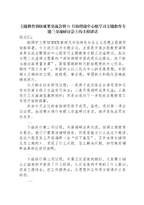 主题教育调研成果交流会暨11月份理论中心组学习主题教育专题三交流研讨会上的主持讲话同志们:按照学习贯彻XXX新时代中国特色社会主义思想主题教育安排部署,今天我们召开专题会议,主要是开展主题教育调研成果交流会暨理论中心组学习主题教育专题三交流研讨,此次专题三交流研讨要紧扣深刻领悟中国式现代化理论,实干担当推动高质量发展,紧紧围绕新时代新征程党的中心任务,胸怀国之大者,牢固树立以人民为中心的发展思想,牢固树立正确的权力观、政绩观、事业观,牢固树立和践行正确政绩观进行。今天的会议有四项议程:一是班子成员结合自身思想和工作实际就专题三交流学习体会;二是开展调研成果交流;三是进行正反面典型案例剖析;四是由我对下一步抓好主题教育工作进行安排部署。参加今天会议的有馆领导班子成员。首先,进行第一项会议议程,由我带头进行专题三交流研讨发言,班子其他成员依次发言。下面进行第二项议程,开展调研成果交流。按照主题教育办要求,我们不需要读调研报告。但是要就为什么选这个题目、选这个题目怎么开展调研(含四下基层、五字诀等关键词及怎么做的)、发现了什么问题、怎么解决问题、如何做好调研成果转化进行说明。..下面进行第三项议程,开展正反面案例剖析。大家要介绍从正面案例中收获了什么经验,从反面案例中得到了什么教训,把自己摆进去,把工作摆进去,从思想和工作两方面进行认真剖析。下面进行会议第四项议程,由我对抓好下一步主题教育工作进行安排部署。刚才大家紧扣主题教育专题三总要求,紧密结合工作实际将近阶段的所学所思所悟,进行系统化的整理和阶段性的总结,深入研讨、畅所欲言,讲出了认识深度,谈出了落实态度。结合调研成果,对开展调研的整个过程进行了说明。从正反两个典型案例中总结经验、汲取教训,为更好开展工作提供了更多的思路、举措。总体来说,本次交流研讨会议既是一次凝聚共识的读书会,也是互学互鉴、共同提高的交流会,更是激发动力、奋力赶超的推进会,大家深化了对中国式现代化理论体系的理解和把握,达到了启发工作思路、指导工作实践的学习成效。希望大家以这次交流研讨为新的起点,把理论学习作为一项长期任务,不断提高政治能力、思维能力、实践能力,持续在深入、扎实上下功夫,将切实把主题教育激发出来的学习工作热情,转化为推动工作的强大动力,以高度的责任感和奋进的姿态,以实干实绩推动主题教育走深走实。下面,就做好下一步主题教育工作,我再强调几点意见。第一,坚持学深悟透党的创新理论,做到悟深悟透、入脑入心。开展XXX新时代中国特色社会主义思想理论学习,接受思想洗礼,是中国共产党人的必修课,更是开展主题教育的题中应有之义。作为党员领导干部,要以此次主题教育为契机加强理论学习,坚持读原著学原文悟原理,坚持多思多想、学深悟透,全面学习领会XXX新时代中国特色社会主义思想的科学体系、精髓要义、实践要求,做到整体把握、融会贯通,不断增进对党的创新理论的政治认同、思想认同、理论认同、情感认同。要把学懂弄通做实XXX新时代中国特色社会主义思想作为政治责任、终身课题。要深刻领悟两个确立两个维护的重大意义,切实增强忠诚核心、拥戴核心、维护核心、捍卫核心的政治自觉、思想自觉、行动自觉,坚守共产党员精神家园,始终做到信仰如山、信念如铁、信心如磐。第二,坚持用好调研成果,大力弘扬真实、踏实、务实、求实的工作作风。要把调研成果用在实际工作中,在解决工作中求实效、在推动发展上见真章,真正用高质量发展的实绩验证调研成果的实效。会前我认真看了大家的调研报告,总的来说,都能做到把自己摆进去、把职责摆进去、把工作摆进去,通过调研取得了收获。会后,我们要坚持深入基层,深入一线,继续开展调查研究,并把此次调研成果积极运用到日常工作中,按照走在前列的要求,组织有关科室进一步细化、落实调研取得的成果,开拓工作思路、创新工作机制,改进工作方法,推动分管领域各项工作取得更大的发展。第三,坚持以学习成效推动工作,切实做到学以致用、知行合一。知为行之始,行为知之成。唯有以学促干、以知促行,才能进一步树立正确的权力观、政绩观、事业观,增强为民造福的责任感和使命感。要用好正反面典型案例,从正面案例中领悟做好下一步工作的实际举措。从反面案例中深刻反思,吸取经验教训,并加以整改。要始终坚持群众利益无小事,开展好四下基层我为群众办实事立足岗位作贡献等活动,为群众多办实事、多办好事,以实际行动取信于民,树立党员干部的良好形象。只有紧紧围绕新时代新征程党的中心任务,真抓实干、务求实效,聚焦问题、知难而进,以时时放心不下的责任感、积极担当作为的精气神为党和人民履好职、尽好责,才能以新气象新作为推动高质量发展取得新成效。乘势而上开新局,砥砺奋进谱新篇。开展好主题教育,关键在一个实字。我们