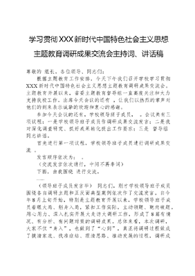 学习贯彻XXX新时代中国特色社会主义思想主题教育调研成果交流会主持词、讲话稿尊敬的 组长,各位领导、同志们:根据主题教育工作安排,今天下午我们召开学校学习贯彻XXX新时代中国特色社会主义思想主题教育调研成果交流会。主题教育开展以来,省委主题教育督导组一直高度关注和大力支持我校工作。出席今天会议的还有 ,让我们以热烈的掌声对他们的到来表示诚挚的欢迎和衷心的感谢。参加今天会议的还有,学校领导班子成员, 。会议共有三项议程:一是学校领导班子成员作调研成果交流发言;二是我对深化调查研究、抓好成果转化提出工作要求;三是 督导组 同志讲话。首先进行第一项议程,学校领导班子成员进行调研成果交流 。发言顺序依次为: 。(交流发言依次进行,中间不再串词)下面,由我围绕 进行交流。(领导班子成员发言毕) 同志们,刚才学校领导班子成员围绕各自调研主题和正反面典型案例依次作了交流发言。自今年8月上旬开始,特别是主题教育开展以来,学校领导班子成员着眼大局、躬身入局,紧扣工作实际,主动领题、靶向破题,用心用力、深入扎实开展大走访大调研工作,形成了8篇有情况、有分析、有问题对策的调研成果。总体来看,本次调研,大家不仅身入,也做到了心到,真正将调研过程做成了摸清家底、找准症结、理清思路、推动发展的过程,调研成果总结情况客观全面、分析问题深入透彻、对策建议有力有效,交流发言基本实现了统一思想、凝聚共识、明确方向、共谋良策的目的,达到了预期效果。总结本次调研的特点,可以概括为三个度:一是,选题有准度。大家坚持问题导向、系统思维,立足学校发展历史方位、面临形势和机遇挑战,以制约高质量发展最突出的难题和师生反映最强烈的热点为靶向标,研究确定了等8个调研主题,调研课题与当前重点工作方向一致、目标一致、步调一致。譬如,科教融汇是党的XX大对职业教育提出的具体要求,而科教融汇也是学校在农科院基础上办高职的优势所在。同志以科教融汇为切入点,对学校如何将办学特色外化为服务优势进行了问题梳理和系统思考,符合学校的办学定位和主攻方向,具有很强的针对性和指导性。二是,调研有深度。调研工作启动以来,领导班子成员先后赴 等近30所兄弟院校、合作企业学习先进经验;深入师生召开专题调研会议、座谈20余次,赴二级学院(部)、职能部门等基层开展调查研究65次,梳理问题清单36个,形成校级正反典型案例2个,现场解决问题23个。譬如,同志主持召开了座谈会、科研骨干座谈会,,真正做到了坐下来倾听、走下去访谈、静下心分析,达到了摸实情、听意见、找对策的目的。三是,破题有力度。大家坚持以XXX新时代中国特色社会主义思想的世界观、方法论为指导,从新思想中探寻调查研究的方式方法、开拓破题解题的思路措施,直面问题焦点和矛盾症结,从不同侧面、不同角度进行深入分析和思考,提出了破解难题的实招硬招,形成了前瞻性、针对性、操作性强的调研成果,同时持续推动调研成果转化运用,已转化运用44个,其中转化为重大改革措施2项。虽然本次调研基本达到了预期效果,但也存在规定动作做到位,自选动作不够出彩;调研的方式方法单一,缺少个性化和创新性;部分对策建议针对性、可操作性不强,成果转化不够快等问题,还需在今后的工作中加以改进。同志们,今天的会议,既是主题教育调研成果集中检阅的展示会,也是大家互学互鉴、共同提高的交流会,更是破解制约学校发展桎梏、推动高质量发展,激发奋进动力的推进会。希望大家以此次会议为契机,持续在深入、扎实上下功夫,突出抓好调查研究后半篇文章和正面案例总结、反面案例整改工作,切实将调研成果转化为学校高质量发展的现实成果。下面,就做好下一步主题教育工作,我再强调三点:第一,持续用好调查研究金钥匙XXXXXX强调,调查研究是谋事之基,成事之道,没有调查就没有发言权,没有调查就没有决策权。调查研究是学习贯彻XXX新时代中国特色社会主义思想主题教育的重点措施,也是推动学校各项事业快速发展的必修课。一是要把调查研究作为工作习惯。调查研究只有进行时,没有完成时。尽管我们的专题调研取得了阶段性成效,但接下来的主题教育乃至今后的工作中,希望大家继续将这一方法坚持下去,要以调研为契机深化理论学习,不断提升用党的创新理论研究新情况、解决新问题、总结新经验、探索新规律的能力水平,用足用好调查研究深、实、细、准、效五字诀,在学习中调研、在调研中思考、在思考中总结,在不断总结中指导实践、推动工作。二是要把调查研究作为指导实践、推动发展的实招硬招,始终坚持目标引领、调研开路、问题导向、改革破题和创新制胜的工作理念,在调查研究中找到解决问题办法措施、积极回应师生员工关切诉求,以正视问题的自觉和刀刃向内的勇气,真刀真枪进行研究解决。三是要把调查研究作为举一反三、改进工作的具体行动,
