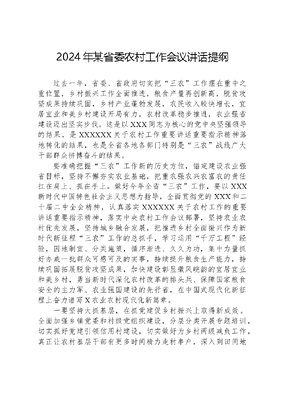 2024年某省委农村工作会议讲话提纲过去一年,省委、省政府切实把三农工作摆在重中之重位置,乡村振兴工作全面推进,粮食产量再创新高,脱贫攻坚成果持续巩固,乡村产业蓬勃发展,农民收入较快增长,宜居宜业和美乡村建设开局有力,农村改革稳步推进,农业强省建设迈出坚实步伐。这是以XXX同志为核心的党中央坚强领导的结果,是XXXXXX关于农村工作重要讲话重要指示精神落地转化的结果,也是全省各地各部门特别是三农战线广大干部群众拼搏奋斗的结果。要准确把握三农工作新的历史方位,锚定建设农业强省目标,坚持不懈夯实农业基础,把重农强农兴农富农的责任扛在肩上、抓在手上。做好今年全省三农工作,要以XXX新时代中国特色社会主义思想为指导,全面贯彻党的XXX和二十届二中全会精神,认真落实XXXXXX关于农村工作的重要讲话重要指示精神,落实中央农村工作会议部署,坚持农业农村优先发展,坚持城乡融合发展,把推进乡村全面振兴作为新时代新征程三农工作的总抓手,学习运用千万工程经验,因地制宜、分类施策,循序渐进、久久为功,集中力量抓好办成一批群众可感可及的实事,持续提升粮食生产能力,持续巩固拓展脱贫攻坚成果,加快建设彰显徽风皖韵的宜居宜业和美乡村,勇当新时代深化农村改革的排头兵、保障国家粮食安全的主力军、农业强国建设的先行省,在中国式现代化新征程上奋力谱写X农业农村现代化新篇章。一要坚持大抓基层,在抓党建促乡村振兴上取得新成效。全面加强乡镇党委和村级党组织建设,分层分类开展专题培训,切实抓好党建引领信用村建设,切实做好为乡村两级减负工作,真正让农村基层干部有更多时间精力走村串户,深入到田间地头服务群众。二要坚持守牢底线,在抓好粮食生产、巩固拓展脱贫攻坚成果上展现新作为。全面落实藏粮于地、藏粮于技战略,牢牢守住耕地保护红线,加快推进高标准农田建设和水利建设,深入实施种业振兴行动,坚持稳面积、增单产两手发力,加快建设千亿斤江淮粮仓;毫不放松抓好巩固拓展脱贫攻坚成果各项工作,坚决守住不发生规模性返贫底线。三要坚持产业兴农,在做好粮头食尾畜头肉尾农头工尾增值大文章、提高农业综合效益上实现新突破。坚持种养一块抓、粮肉一块抓、头尾一块抓,打造全国有影响力的大粮仓、大肉库、大厨房,做强农产品精深加工业,在优质粮油、绿色果蔬、徽派预制菜、休闲食品等领域打造一批头部企业,实施好秸秆变肉暨肉牛振兴计划,做大农村电商、乡村旅游、乡村民宿等新产业新业态,强化农民增收举措,引导农民参与产业发展,为他们提供更多就近就地就业机会。四要坚持由点及面,在建设宜居宜业和美乡村上迈出新步伐。聚焦千与万一起抓、点与面相统筹,狠抓各项政策举措落地见效,大力推进农村人居环境整治提升,持续推进农村黑臭水体治理,推动千村引领、万村升级工程不断取得实质性进展、阶段性成果。五要坚持和发展新时代枫桥经验,在提升乡村治理水平上探索新路径。健全党组织领导下的自治、法治、德治相结合的乡村治理体系,以自治消化矛盾,以法治定分止争,以德治春风化雨,持续深化平安乡村建设,确保农村稳定安宁、和谐有序。六要坚持敢为人先,在深化农村改革上取得新进展。大力弘扬小岗精神,扎实做好二轮延包、培育新型农业经营主体、深化农村土地制度改革等工作,不断破解乡村发展难题、增强乡村发展活力。文可居文库——海量学习资料,手机电脑下载www.wenkeju.com各级各部门要切实加强组织领导,汇聚推进乡村全面振兴的强大合力。坚持五级书记抓乡村振兴,做到上下贯通、一抓到底,县委书记要把主要精力放在三农工作上,真正当好一线总指挥。要强化要素保障,健全多元投入机制,完善乡村人才振兴的政策举措,培养更多的发展引路人、产业带头人、政策明白人。要加强作风建设,树立正确政绩观,发扬四下基层优良传统,锚定目标、真抓实干,在做好服务群众、服务人才、服务企业、服务基层四个服务上取得实打实的成果,奋力建设高质高效的农业强省,为在中国式现代化新征程上谱写更加壮丽的X篇章作出三农更大贡献。文可居文库——海量学习资料,手机电脑下载www.wenkeju.com