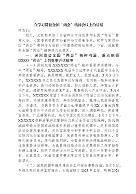 在学习贯彻全国两会精神会议上的讲话同志们:刚才,大家都参加了全省和全市传达贯彻全国两会精神大会,大家要积极落实全省和全市部署要求,把学习贯彻全国两会精神作为当前一项重要的政治任务。下面,我就贯彻全国两会精神讲几点意见。一、深刻领会全国两会精神内涵,重点把握XXXXXX两会上的重要讲话精神(一)深刻把握XXXXXX两会期间重要讲话精神。今年两会期间,XXXXXX先后多次出席多个代表团审议会议并发表重要讲话,高屋建领、视野宏大、思想深邃。3月5日下午,XXXXXX在江苏代表团审议时强调,面对新一轮科技革命和产业变革,我们必须抢抓机遇,加大创新力度,培育壮大新兴产业,超前布局建设未来产业,完善现代化产业体系。3月6日下午,XXXXXX看望了参加全国政协十四届二次会议的民革、科技界、环境资源界委员,并参加联组会,强调人民政协各党派、各团体、各族各界各方面人士要围绕中共XX大提出的重大战略任务和中央经济工作会议部署,深入调查研究,积极建言资政,广泛凝聚共识,助力中国式现代化建设。3月7日下午,XXXXXX在解放军和武警部队代表团全体会议时强调,新兴领域战略能力是国家战略体系和能力重要组成部分,关系我国经济社会高质量发展,关系国家安全和军事斗争主动,对以中国式现代化全面推进强国建设、民族复兴伟业具有重要意义。要强化使命担当,深化改革创新,全面提升新兴领域战略能力。这些重要讲话精神,为我县推动经济社会发展提供了科学指导和根本遵循,指明了前进方向和工作思路,我们一定要全面贯彻、认真落实,把我县高质量发展各项工作推向更高水平、更高层次。(二)深刻把握李强总理政府工作报告重要内涵。3月5日,李强总理作政府工作报告,全面回顾了2023年工作,明确2024年十大方面工作,一是大力推进现代化产业体系建设,加快发展新质生产力。二是深入实施科教兴国战略,强化高质量发展的基础支撑。三是着力扩大国内需求,推动经济实现良性循环。四是坚定不移深化改革,增强发展内生动力。五是扩大高水平对外开放,促进互利共赢。六是更好统筹发展和安全,有效防范化解重点领域风险。七是坚持不懈抓好三农工作,扎实推进乡村全面振兴。八是推动城乡融合和区域协调发展,大力优化经济布局。九是加强生态文明建设,推进绿色低碳发展。十是切实保障和改善民生,加强和创新社会治理。政府工作报告为加快构建新发展格局,推动高质量发展臂画了蓝图。我们要在以XXX同志为核心的党中央坚强领导下,深刻理解把握政府工作报告核心要义,振奋精神、鼓足干劲,把思想和行动统一到报告精神上来,为以中国式现代化全面推进强国建设、民族复兴伟业不懈奋斗。二、深入贯彻全国两会部署要求,结合实际推动全县各项工作有序开展结合我县工作实际,推动经济社会高质量发展,是对全国两会精神最直接、最有效、最有力的贯彻和落实。我们要重点抓好以下几方面工作:(一)坚定不移推动产业提质增效,夯实高质量发展支撑一是加速推动工业振兴。开展工业高质量发展攻坚年活动,加快建设××高端厨具、纺织服装、灯饰照明等3个轻工产业园。完善处级领导干部联系服务企业,按照《××县2024年县领导联系重大项目一览表》落实领导责任,强化对重大项目的精准服务和指导,切实推动项目落地建设投产。二是做优做特现代农业。落实田长制,推进撂荒地复耕复种,全力抓好春耕工作。加快实现乡村振兴产业园(一期)××产业园年内开园。推进橘红种植及深加工,以品牌带动橘红产业转型升级。三是持续激活现代服务业。发展壮大商贸城富安居家装建材市场、××国际市场,打造铁锅交易中心、名优农产品交易中心。精选16文可居文库——海量学习资料,手机电脑均可下载www.wenkeju.com个旅游项目开展创A创星,提档升级。(二)坚定不移培育经济增长动能,塑造高质量发展优势一是聚力发展枢纽经济。加快推进××、××珠、××高速××段建设。以建设县北××物流冷链二期三期、县中××××富安居建材交易市场、县南××××物流园等为目标,加速培育商贸物流产业体系。二是聚力发展生态经济。抓好养殖污染治理和村屯生活污水治理,对重点圩镇污水管网进行升级改造,确保××江、××江水质稳定达标。三是聚力发展项目经济。力争年内全省层面统筹推进重大项目实现新开工××个,竣工××个,完成投资××亿元以上。四是聚力发展外向经济。围绕××××产业布局,进行委托招商、驻点招商。力争签约项目××个以上,其中引进500强企业项目××个以上,新落地项目××个,招商引资到位资金××亿元。(三)坚定不移加快城乡深度融合,筑牢高质量发展根基一是巩固拓展脱贫攻坚成果。落实四个不摘要求,健全防止返贫动态监测和帮扶机制。二是全面实施乡村振兴战略。牢牢守住粮食安全和不发生规模性返贫两条底线,扎实有序做好乡村发展、乡村建设、