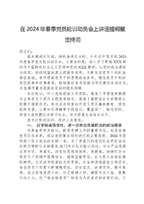 在2024年春季党员轮训动员会上讲话提纲暨主持词同志们:春来潮涌东风劲,扬帆奋进正当时。今天召开X系统2024年度春季党员轮训动员会,主要目的是:深入学习贯彻XXX新时代中国特色社会主义思想和党的XXX精神,以党的政治建设为统领,持续巩固拓展主题教育成果,不断夯实党员干部队伍建设基础,有序提高党员干部思想政治素质,强化党员干部的党性修养和纪律教育,持续推动X系统能力作风建设走深走实,为X高质量发展提供坚实的组织保障。本次轮训,中心党组根据工作实际,邀请了市委党校教授为全体党员干部作专题党课辅导、邀请了摄影协会专家帮助大家提升摄影技术,相关业务科室也开设了党风廉政教育、绿色低碳发展、公路知识讲解等专题培训,覆盖面广、贴近实际,希望大家把握这次学习机会,努力提高自身综合水平。就本次轮训活动,我讲三点意见:一、 以学铸魂强党性,进一步夯实忠诚担当的政治根基开展春季党员轮训,既是党建工作的重要内容,也是提高党员队伍素质,保证党的事业顺利进行的必要前提。2024年是实现十四五规划的关键一年,为了使我们的党员队伍更好地适应新形势新任务新要求,我们举办此次轮训活动,对从严治党要求再传达、再落实,对党性思想再培养、再教育,持续引导全体党员干部铸牢理想信念、锤炼坚强党性,在大是大非面前旗帜鲜明,在风浪考验面前无所畏惧,在各种诱惑面前立场坚定。每名党员干部要不断增强党性、坚定信念、改进作风、提升素质,真正校准思想之标、补足精神之钙、绷紧作风之弦、集聚行动之力,把做合格党员转化为内在追求和自觉行动,不断提高凝聚力、创造力和战斗力,不断提高工作能力、创新工作方法,以能力作风之变、引领行动之变,催生发展之变,进一步提高理论思想素质,保持党员的先进性和积极性,在公路建设中更好地发挥中坚骨干作用和先锋模范作用。二、 以学促干提能力,进一步激发干事创业的奋进力量年初,我们召开了持续推动市直公路系统能力作风建设走深走实工作会议,擂响了新春第一鼓,上一周召开了全市公路工作会议,对全年公路工作进行了安排部署。冲锋号已吹响,各位党员干部作风扎实不扎实、抓落实到位不到位、服务群众能力强不强,决定了全年工作任务和目标能否圆满完成和落实。因此今天的会议,既是春季党员轮训的动员会,也是持续推动能力作风建设走深走实的再动员会,通过开展系列培训,将学习软实力转化为工作硬本领。我们各单位、各科室及每个人要紧紧围绕中心工作任务,结合各自实际,找准结合点和切入点,做好全年工作计划。办公室已组织各科室及个人签订2024年度目标责任书,制定目标责任只是开端,关键在落实全体党员干部要进一步对着学、比着干、盯着赛,进一步开阔思路、解放思想、改进作风,不断提升专业能力、勇于攻坚克难,树立年年难干年年干、事事难成事事成的信心决心,千方百计攻克一个个难关,努力促进各项工作落实,确保各项工作再上新台阶、再创新辉煌。三、 以学正风树形象,营造风清气正的行业环境面对中国式现代化的新形势新任务,我们在能力作风建设上还存在一些短板和不足,特别是极个别少数人身上仍存在的作风漂浮、服务意识不强、专业能力弱、办事效率低等方面的问题。通过此次培训,全体党员干部要转变作风,学会互相尊重,互相学习、互相补台、互相关心、互相提醒,在维护、服务中心发展大局上,努力实现全局一盘棋、发展一条心;要严明纪律规矩,树立忠诚担当的干部形象;严守工作纪律,严格遵守机关工作制度,工作时间不做与工作无关的事情,有事要文可居文库——海量学习资料,手机电脑均可下载www.wenkeju.com履行请销假制度;认真落实全面从严治党要求,严格执行中央八项规定及其实施细则精神,努力树立干净、忠诚、担当的良好干部形象。各级基层党组织要落实管党治党主体责任、书记第一责任人责任,坚定不移推进全面从严治党、清廉机关建设,着力营造风清气正、团结向上的干事创业环境。同志们,组织开展这次党员培训,时间紧任务重,全体党员干部要处理好工作与学习的关系,按照要求及时参加培训,端正学习态度,真正静下心来,集中精力,认真听讲,积极思考,自觉遵守学习纪律,做到不迟到、不早退。组织学习时,要认真听讲,做好笔记;需要讨论时,要积极参加,踊跃发言。 下面进行第一项议程:签订2024年党风廉政建设目标责任书,请X中心、X科室、X公司等代表依次上台进行签约。……下面,进行第二项议程:开展专题党课辅导今天,我们很荣幸邀请到了中共X市委党校X教授,为我们围绕中国共产党历史作专题辅导授课。X教授毕业于武汉大学历史系,长期担任领导工作,从事政党政治、党史的教学和研究,在省级以上刊物发表多篇论文,参与数种著作和教材的编写工作。也是省委讲师团成员,全市重大时事政治宣讲团主要成员,X电视台特约评论员。下面,让我们以热烈的掌声欢迎X教授为我们授课。.