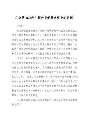 在全县2023年主题教育动员会议上的讲话同志们:今天我们召开全县学习贯彻习近平新时代中国特色社会主义思想主题教育动员部署会议,主要任务是以习近平新时代中国特色社会主义思想为指导,深入学习贯彻中央和省委学习贯彻习近平新时代中国特色社会主义思想主题教育动员部署会议精神,认真学习市委学习贯彻习近平新时代中国特色社会主义思想主题教育动员部署会议精神,对我县主题教育进行全面安排部署。4月3日,党中央召开了学习贯彻习近平新时代中国特色社会主义思想主题教育工作会议,习近平总书记发表重要讲话,精辟论述了主题教育的重大意义,系统阐述了主题教育的总要求、目标任务、重点措施,为开展主题教育指明了方向、提供了遵循。4月7日、8日,省委、市委相继召开了学习贯彻习近平新时代中国特色社会主义思想主题教育部署会议。刚才,XX同志宣读了《关于在全县开展学习贯彻习近平新时代中国特色社会主义思想主题教育的实施意见(讨论稿)》,请大家认真学习领会,抓好贯彻落实。下面我讲几点意见。一、提高政治站位,强化思想认识,充分认识开展主题教育重大意义党的XX大报告指出:从现在起,中国共产党的中心任务就是团结带领全国各族人民全面建成社会主义现代化强国、实现第二个百年奋斗目标,以中国式现代化全面推进中华民族伟大复兴。开展学习贯彻习近平新时代中国特色社会主义思想主题教育就是落实习近平新时代中国特色社会主义思想和党的XX大精神的实际行动,是以习近平同志为核心的党中央统揽伟大斗争、伟大工程、伟大事业、伟大梦想作出的战略部署,具有重大而深远的意义。大家要深刻领会重大意义,全面激发深入开展主题教育的责任感和使命感。(一)深刻认识开展主题教育是用新时代中国特色社会主义思想武装全党的迫切需求。政治上的坚定、党性上的坚定,都离不开理论上的坚定。中国共产党之所以能够历经艰难困苦而不断发展壮大,很重要的一个原因就是我们党始终重视思想建党、理论强党,始终把思想理论建设放在党的建设首位。今年是学习贯彻党的XX大精神开局之年,也是庆祝改革开放45周年,在共产党的带领下,新中国取得了举世瞩目的发展成就,但面对十分复杂的国内外环境,俄乌战争、与美国的贸易摩擦,都给我们实现第二个百年目标增加了很大不确定性。在我们实现中华民族伟大复兴,践行中国梦的道路上,如果缺乏理论思维,就难以保持政治上的清醒坚定,也难以战胜各种风险挑战。目前,一些党员干部在理论学习上与现实需求还存在不小差距,有的学习过于追求形式,没有认真学原著悟原理,缺少学深悟透、贯通笃行的定力;有的存在学用脱节的现象,新思想、新理念消化吸收不充分,理论指导实践效果不明显,身体进入了新时代,思想还停留在过去我们要通过这次主题教育活动,不断加深对习近平新时代中国特色社会主义思想重大意义、科学体系、丰富内涵的理解,增强贯彻落实的自觉性、坚定性。深刻把握贯穿其中的中国共产党人的政治品格、价值追求、精神境界、作风操守。坚持读原著、学原文、悟原理,坚持把自己摆进去、把职责摆进去、把工作摆进去聚焦解决思想根子问题,自觉对表对标,深刻领悟两个确立的决定性意义,不断增强四个意识,坚定四个自信,坚决做到两个维护。(二)深刻认识开展主题教育是加强基层党的建设的迫切需求。党的十八大以来,以习近平同志为核心的党中央坚定不移全面从严治党。县委也深入贯彻全面从严治党战略部署,抓班子带队伍、强基层打基础、纠四风树正气,营造了风清气正的良好政治生态。但是一些单位还是不同程度地存在着党的领导弱化党的建设缺失、管党治党不力的问题,有的在贯彻落实中央重大决策部署时,重视程度不够高、行动不够迅速;部分党组织书记还有担当意识不强,培树新典型、新亮点力度不大,党建引领中心工作的互促融合效果不明显等实际问题。我们要通过这次主题教育活动,以加强党的政治建设为抓手,着力夯实基层基础,通过走实走深基层一线,掌握症结所在,切实解决基层党建中长期存在的疑难杂症。同时,主题教育在县级及各领域基层党组织开展,涉及范围广、类型多、数量大,同群众的联系更直接,面对的矛盾问题更复杂,必须充分发动各基层党组织的主动性、积极性,确保每位党员都能深刻领悟主题教育的重大意义,切身感受到开展活动对各项工作的推动作用,以此提升基层党组织的凝聚力和战斗力。(三)深刻认识开展主题教育是保持党同人民群众血肉联系的迫切需求。我们党来自人民、植根人民、服务人民,党的根基在人民、血脉在人民、力量在人民。密切联系群众,贯彻党的群众路线,带领人民创造幸福生活,是中国共产党党的性质和宗旨的体现,是我们党区别于其他政党的显著标志,也是我们党的制胜法宝。近年来,县委始终把人民利益摆在首要位置,以创建全国文明城市、卫生城市,以践行五到四从四多工作法、开展干部下基层·建功在一线为途径,察民情、解民意,有力促进了干部作风转变,密切了