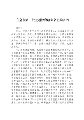 在全市第二批主题教育培训会上的讲话同志们:昨天,市委召开了全市主题教育部署会,标志着我市主题教育全面启动。今天,我们紧接着召开培训会,主要任务是深入学习贯彻XXXXXX关于主题教育的重要讲话精神,认真贯彻落实中央、省委、市委的部署要求,研究我市主题教育的组织实施、督促指导等具体工作,安排近期重点任务。下面,我讲三点意见。一、提高政治站位,扎实做好主题教育组织协调工作。在全党部署开展主题教育,是统一全党思想意志行动、始终保持党的强大凝聚力、战斗力的必然要求,是推动全党积极担当作为、不断开创事业发展新局面的必然要求,是深入推进全面从严治党、以党的自我革命引领社会革命的必然要求。XXXXXX对主题教育高度重视,亲自擎画设计、亲自动员部署、亲自领导推动、亲自调研指导,为主题教育扎实推进提供了根本遵循。大家要认真学习、深刻领会,切实把思想和行动统一到XXXXXX重要讲话和重要指示批示精神上来,统一到中央部署和省委、市委的要求上来,提高政治站位,强化责任担当,全员发动、全身心投入、全过程抓牢,确保第二批主题教育有力有序、取得实效。特别是办公室和各个组的职责任务已经很明确,关键是要把职责履行好,把任务落实好。一要当好参谋助手。办公室是领导小组决策的参谋部,要准确把握中央、省委和市委对第二批主题教育的部署要求,深入研究全市主题教育的工作安排、具体措施,为市委及领导小组把关定向提供参考。要定期召开会议进行统筹谋划和组织协调,全程把控好每项重点措施、重点工作的有效开展和衔接。既要重点抓好县处级以上领导班子和领导干部的主题教育,也要做实基层党支部的理论学习和检视整改,把理论学习抓好、把调查研究做深、把专题党课讲活、把专项整治抓实、把民主生活会和组织生活会开好。要牢牢把握主题教育的主动权,提前预判分析可能遇到的苗头性、倾向性问题,特别是在遇到重大问题、突发情况时,要高度敏锐敏感,做到第一时间了解掌握,第一时间报告报送,第一时间妥善处置。二要精心组织实施。办公室有的同志曾经参加过群众路线教育、三严三实专题教育、两学一做学习教育和党史学习教育等党内集中教育的组织协调工作,有一定的经验,但也有很多同志还是新手。此次主题教育与之前的党内教育相比,任务更重、标准更高、要求更严。为此,大家要掌握特点,把握重点,精心谋划,统筹实施,扎实推进各项工作开展。要充分运用好第一批主题教育成功经验,特别是要认真借鉴各地的典型经验做法以及我市以往几次党内集中教育经验,运用调查研究、提出建议、编发简报、通报情况、解剖麻雀、推广典型等方法、载体,确保主题教育有序有效开展。要突出高效实效,理清工作思路,权衡大事小事、急事缓事,抓大事不放,抓急事先办。三要分级分类指导。这次主题教育我市参加的单位是:市、县机关及直属单位和企事业单位、乡镇、街道和村、社区,非公有制经济组织、社会组织和其他基层组织,共有党组织x个,党员x人,县处级以上领导干部x人,基层导向更明显,面对的矛盾问题更复杂,群众期待解决的问题更具体。要在坚持标准的前提下,处理好普遍与具体、共性与个性的关系,区分不同层级、着眼不同领域、针对不同对象,统筹做好分级分类指导工作,特别是要引导市、县(区)及其直属单位聚焦精神不振、能力不足、作风不实等问题检视整改,乡镇(街道)、村(社区)突出服务群众这个着力点,把指导工作的针对性抓实抓到点子上;要鼓励探索创新,给基层留出空间,对村和社区等基层组织要适当简化程序性要求,对非公有制经济组织和社会组织可采取小型、业余、分散的方式来开展,对流动党员、年老体弱党员的学习教育要灵活施策、讲求实效,不能大而化之,搞一刀切、一锅煮。四要搞好服务协调。做好办公室综合协调服务工作,关键是要守责负责、周全周密,重点是要区分好不同服务对象的特点,抓实协调服务工作。在强化服务方面,重点是要服务好省委指导组、市委领导小组和领导同志,对省委和市委作出的决策部署、安排的重大活动,包括领导同志的调研指导等,都要专题研究、做好服务、不出纰漏;对参与主题的单位以及基层群众反映的问题困难、意见建议、诉求期盼等,要及时帮助、解疑释惑,发现工作不足的要及时指出、促其改进。在搞好协调方面,要加强与省委教育办的沟通联络,及时掌握中央、省委的新部署、新要求,同时加强与市直有关职能部门的沟通协调,发挥职能作用。五要营造良好氛围。这次主题教育社会期待,直通基层,加强宣传舆论引导至关重要。要紧扣第二批主题教育的特点,从群众的视角出发,讲好故事,用好案例,全方位、多角度、多层次宣传中央部署和省委、市委要求,宣传各地各单位特别是基层开展主题教育的好经验好做法,宣传先进典型和感人事迹,把主题教育的成果成效更好地展示给社会公众,特别是要力争在省级及以上媒体多宣传我市的教育成效,提炼总结可复制可普及的经验。要创新宣传形式和载体,重视发