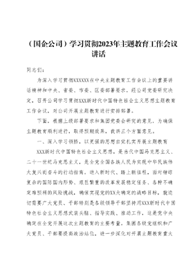 (国企公司)学习贯彻2023年主题教育工作会议讲话同志们:为深入学习贯彻XXXXXX在中央主题教育工作会议上的重要讲话精神和中央、省委、市委、区委部署要求,经公司党委研究决定,召开公司学习贯彻XXX新时代中国特色社会主义思想主题教育工作会议,对公司开展主题教育进行安排部署。下面,根据上级部署要求和集团党委会研究的意见,为确保主题教育顺利进行,取得预期效果,我讲三个方面意见。一、深入学习领悟,以更强的思想自觉扎实开展主题教育XXX新时代中国特色社会主义思想,是当代中国马克思主义、二十一世纪马克思主义,是全党全国各族人民为实现中华民族伟大复兴而奋斗的行动指南。进入新时代、踏上新征程,面对错综复杂的国际国内形势、艰巨繁重的改革发展稳定任务、各种不确定难预料的风险挑战,确保实现党的XX大确定的战略目标,就迫切需要广大党员、干部特别是各级领导干部坚持用XXX新时代中国特色社会主义思想武装头脑、指导实践、推动工作,这是党中央确定在全党开展这次主题教育的主要考量。集团各级党组织和广大党员、干部要提高政治站位,进一步深化对开展主题教育重大意义的认识,切实增强开展主题教育的责任感、使命感。(一)开展这次主题教育,是统一全党思想意志行动、始终保持党的强大凝聚力战斗力的必然要求。坚强的领导核心和科学的理论指导,是我们党创造历史伟业的根本所在。进入新时代的十年,党和国家事业取得的历史性成就、发生的历史性变革,集团改革发展取得的重要成果,最根本的在于有XXXXXX掌舵领航,有XXX新时代中国特色社会主义思想科学指引。贯彻落实好党的XX大精神、落实好集团第九次党代会和集团党委各项工作部署,推动集团高质量发展,更加有力地服务和支撑中国式现代化建设峄城实践,必须一以贯之、坚定不移地拥护两个确立,这是我们开创未来的最大底气和最大保证,也是我们应对各种不确定性的最大确定性。集团各级党组织和广大党员、干部要坚定不移坚持不懈用XXX新时代中国特色社会主义思想凝心铸魂,更加深刻领悟两个确立的决定性意义,更加自觉增强四个意识、坚定四个自信、做到两个维护,始终在思想上政治上行动上同以XXX同志为核心的党中央保持高度一致。(二)开展这次主题教育,是推动全党积极担当作为、不断开创事业发展新局面的必然要求。党的XX大明确了全面建设社会主义现代化国家、以中国式现代化全面推进中华民族伟大复兴的战略安排和目标任务。国有企业是中国特色社会主义的重要物质基础和政治基础,是中国特色社会主义经济的顶梁柱,是实现中华民族伟大复兴的重要力量。以XXX同志为核心的党中央对国有企业高度重视、极为关怀,党的十八大以来,每每在重要节点关键时刻,XXX都会对国有企业作出重要指示批示,为我们做好国企工作提供了根本遵循和行动指南。集团各级党组织和广大党员干部要切实通过开展主题教育,全面系统地学习掌握XXX新时代中国特色社会主义思想,全面学习领会XXX对国有企业的重要指示批示精神,切实把这一思想的世界观、方法论和贯穿其中的立场观点方法转化为思想武器,转化为忠诚党的事业,建设好发展好经营好国有企业,如期实现公司建设目标,更好地为社会作贡献为员工谋福祉的这种实际行动,锲而不舍地推进集团高质量发展。(三)开展这次主题教育,是深入推进全面从严治党、以党的自我革命引领社会革命的必然要求。XXX新时代中国特色社会主义思想直面新时代管党治党新形势新任务,深刻回答了建设什么样的长期执政的马克思主义政党、怎样建设长期执政的马克思主义政党的重大时代课题,为全党时刻保持清醒和坚定、解决大党独有难题指明了行动方向、提供了根本遵循。从集团来看,对照党中央的统一部署,对照省委、市委、区委和区国资中心党委的工作要求,对照国有企业的责任使命,我们仍存在着党建工作融入中心工作还不够紧密,党建引领发展还有待加强,党建品牌建设还任重道远,常态化推进干部思想能力作风建设还不够过硬,双提工作上热下冷、成效打了折扣,以及基层党组织政治功能和组织功能不够强、整体党风廉政建设责任落实还不够到位等突出问题,迫切需要我们要勇于发扬自我革命精神,持之以恒推进新时代党的建设新的伟大工程,不断筑牢国有企业的根和魂。集团各级党组织和广大党员、干部要通过开展主题教育主动接受政治体检、打扫政治灰尘、纠正行为偏差,坚决同一切影响党的先进性、弱化党的纯洁性的问题作斗争,进一步把全面从严治党引向深入,确保集团事业行稳致远、健康发展。二、把握目标要求,扎实有序地推进主题教育落实落地市委、区委高度重视本次主题教育工作,先后召开会议进行专门安排部署,提出了明确要求。我们要把开展好主题教育作为今后一个阶段的重大政治任务,切实把思想和行动统一到XXXXXX重要讲话精神上来,统一到中央部署和省市区委工作要求上来。第一,要准确把握开展主题教育的总要求。按