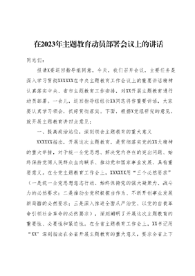 在2023年主题教育动员部署会议上的讲话同志们:报请X委巡回指导组同意,今天,我们召开会议,主要任务是深入学习贯彻XXXXXX在中央主题教育工作会议上的重要讲话精神认真落实中央、省市主题教育工作安排,对XX开展主题教育进行动员部署。一会儿,巡回指导组组长XX同志将作重要讲话,大家要认真学习领会,抓好贯彻落实。下面,根据X党组研究的意见,就开展主题教育讲四点意见:一、提高政治站位,深刻领会主题教育的重大意义XXXXXX指出,开展这次主题教育,是贯彻落实党的XX大精神的重大举措,对于统一全党思想、解决党内存在的突出问题、始终保持党同人民群众血肉联系、推动党和国家事业发展,具有重要意义。在全党主题教育工作会上,XXXXXX用三个必然要求(一是统一全党思想意志行动、始终保持党的强大凝聚力、战斗力的必然要求;二是推动全党积极担当作为、不断开创事业发展新局面的必然要求;三是深入推进全面从严治党、以党的自我革命引领社会革命的必然要求),深刻阐明了开展这次主题教育的重要性、必要性和紧迫性。在全省主题教育工作会上,XX书记用XX深刻指出在全省开展主题教育的重大意义,要求全省上下要确实增强开展主题教育的政治自觉、思想自觉和行动自觉,从政治和全局高度认识和推进主题教育。我们要深刻认识开展主题教育的重大意义和战略考量,更加深刻领悟两个确立的决定性意义,更加坚定自觉衷心拥护两个确立、忠诚践行两个维护,切实把思想和行动统一到中央和省委、XX决策部署要求上来,以更高标准、更严要求落实好主题教育各项任务,不断断增进对党的创新理论的政治认同、思想认同、理论认同、情感认同,真正把马克思主义看家本领学到手,自觉用XXX新时代中国特色社会主义思想指导XX各项工作,为推进中国式现代化的XX实践贡献更大XX力量。二、把握目标任务,高标准高质量开好主题教育党中央对这次主题教育的总要求、根本任务、具体目标作出了明确规定,省委印发的《实施意见》作了全面具体安排,我们一定要牢牢把握学思想、强党性,重实践、建新功的总要求紧紧围绕坚持学思用贯通、知信行统一,把XXX新时代中国特色社会主义思想转化为坚定理想、锤炼党性和指导实践、推动工作的强大力量,使全党始终保持统一的思想、坚定的意志、协调的行动、强大的战斗力,努力在以学铸魂、以学增智、以学正风、以学促干方面取得实实在在的成效根本任务,聚焦锚定凝心铸魂筑牢根本、锤炼品格强化忠诚、实干担当促进发展、践行宗旨为民造福、廉洁奉公树立新风5个具体目标,全面抓好贯彻落实,抓细抓实主题教育各项任务。一要加强理论学习。理论学习是这次主题教育的重中之重,也是搞好主题教育的前提基础,历次党内集中教育无不是以思想教育打头的。要拿出挤和钻的精神,全面系统学习,做到整体把握、融会贯通。一要原原本本全面学。坚持读原著、学原文、悟原理,按照中央确定的学习材料,尤其是党的XX大报告和党章、《XXX著作选读》、《XXX新时代中国特色社会主义思想学习纲要》、《XXX新时代中国特色社会主义思想专题摘编》4种必读书目,要一篇一篇读,逐段逐句悟,在反复研读中全面学习领会XXX新时代中国特色社会主义思想的科学体系、精髓要义、实践要求。二要突出重点专题学。结合XXXX工作实际,坚持学以致用、知行合一,本着干什么就重点学什么,缺什么就重点补什么原则,专题学习XXX法治思想、XXXXXX视察XX重要讲话精神和对XX工作、XX工作、XX工作重要指示批示精神,在学思践悟中站稳政治立场、提升政治能力、增强工作本领。三要领导干部示范学县以上党员干部是这次主题教育的重点,要发挥好示范带动作用要按月分专题组织党组理论学习中心组学习,组织举办不少于一周的读书班。领导班子成员、机关各党支部书记要带头个人自学深入研讨、讲授党课,发挥好带学促学作用。二要做实调查研究。这次主题教育的一个鲜明特色,就是把大兴调查研究作为重要内容。我们要认真贯彻XXXXXX关于大兴调查研究的重要指示精神,围绕推进XXXX理念、体系、机制、能力现代化加强XX政治建设建设高素质专业化XX队伍等方面的重点内容,认真组织开展领题调研。一要坚持实事求是开展调查研究,坚持从实际出发,采取四不两直方式扑下身子沉到困难多、工作打不开局面的地方和单位,听真话、察实情,解剖麻雀,形成指导XX实践、推动XX工作的思路办法和对策举措二要坚持问题导向开展调查研究,增强问题意识,奔着问题去,奔着解决问题去,发现真问题、分析真问题、解决真问题。特别是要加强对长期制约XX事业发展、困扰基层基础和队伍建设、影响XX质效等突出问题开展深入调研,寻求解决办法,提高调查研究的针对性有效性。三要坚持结果导向开展调查研究。要注重调研成果的转化,在调查的基础上深化研究,防止为调研而调研,以调研报告代替调研成果。要