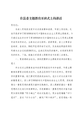 在县委主题教育开班式上的讲话同志们:为深入贯彻落实党中央决策部署和省委、市委工作安排,扎实开展好学习贯彻XXX新时代中国特色社会主义思想主题教育,今天我们在此举办学习贯彻XXX新时代中国特色社会主义思想主题教育读书班开班式。出席本次会议的有:县委常委、县人大常委会县政府、县政协、XX经开区领导班子成员,及其他在职县级领导列席本次会议的是XXX同志,让我们用热烈的掌声,欢迎淳廷勇同志的到来。下面,我就办好县委主题教育读书班提三点意见。一、要提高政治站位,深刻把握举办主题教育读书班的重大意义举办这次主题教育读书班是贯彻落实中央和省委、市委主题教育部署要求的规定动作,也是凸显领导干部示范带头、领学促学的重要举措,我们要切实提高政治站位,充分认识这次读书班的重要意义,深入学习XXX新时代中国特色社会主义思想,深刻感悟这一重要思想的真理力量和实践伟力,深入理解把握这一重要思想的历史地位和规律特点,系统掌握这一重要思想的丰富内涵更加深刻领悟两个确立的决定性意义,更加自觉增强四个意识、坚定四个自信、做到两个维护,把思想统一到XXXXXX重要讲话精神上来,统一到中央和省委、市委的安排部署上来,进一步增强政治判断力、政治领悟力、政治执行力,坚持第一议题抓学习,第一遵循抓贯彻,第一政治要件抓落实,切实增强开展主题教育的责任感和使命感。二、要立足根本任务,全力提升主题教育读书班学习实效此次主题教育将坚持学思用贯通、知信行统一,把XXX新时代中国特色社会主义思想转化为坚定理想、锤炼党性和指导实践推动工作的强大力量,使全党始终保持统一的思想、坚定的意志协调的行动、强大的战斗力,努力在以学铸魂、以学增智、以学正风、以学促干方面取得实实在在的成效作为根本任务,我们要坚决落实中央和省委、市委的部署要求,以高的标准、严的要求把主题教育读书班组织好,在以学铸魂、以学增智、以学正风以学促干上见实效。一要坚持以学铸魂,带着嘱托学,深入系统学。我们要带着嘱托学,牢记XXXXXX对XX、对XX工作的殷切期望、重要指示,把自己摆进去、把职责摆进去、把工作摆进去,坚持全面学习领会XXX新时代中国特色社会主义思想,从思想深处正本清源、固本培元,自觉做XXX新时代中国特色社会主义思想的坚定信仰者、积极传播者、忠诚实践者,始终把衷心拥护两个确立、忠诚践行两个维护作为最大的政治任务、最高的政治原则、最起码的政治纪律,坚决捍卫核心地位、维护核心权威、紧跟核心奋斗,筑牢对党绝对忠诚的思想根基,始终在思想上政治上行动上同以XXX同志为核心的党中央保持高度一致,站在全县发展全局的战略高度,在推进中国式现代化XX实践中展现新作为。二要坚持以学增智,带着任务学,带着问题学。加强理论武装、深化理论学习是主题教育的重中之重,是主题教育的逻辑起点和重要基石,举办读书班既是贯彻落实XXXXXX重要讲话精神和中央、省委、市委部署要求的具体举措,也是难得的学习充电机会。大家要在此次读书班的学习过程中边学边悟,知其然更知其所以然,找到攻克难点堵点、解决矛盾问题、防范化解重大风险推动事业高质量发展的答案,把学习成果转化为推动发展的能动性、自觉性。三要坚持以学正风,端正态度学,示范带头学。领导干部和关键少数要走在前,做示范,带动全体干部队伍往深里走、往实里走、往心里走。要端正学习态度,自觉用XXX新时代中国特色社会主义思想改造主观世界,深刻领会这一思想关于坚定理想信念、提升思想境界、加强党性锻炼等一系列要求,始终保持共产党人的政治本色。要通过学习进一步牢固树立以人民为中心的发展思想,坚持一切为了人民、一切依靠人民,着力解决人民群众急难愁盼问题,把惠民生、暖民心、顺民意的工作做到群众心坎上,不断增强群众的获得感、幸福感、安全感。要通过学习进一步改进工作作风,持续纠治四风,坚决抵制形式主义、官僚主义,做到公正用权、依法用权、为民用权、廉洁用权,推动形成清清爽爽的同志关系、规规矩矩的上下级关系、亲清统一的新型政商关系,当好良好政治生态的引领者、营造者、维护者。四要坚持以学促干,带着责任学,联系实际学。抓好理论学习的最终落脚点体现在推动工作上,开展主题教育,归根结底是要推动事业高质量发展。要把理论学习、交流研讨同抓发展、保稳定提质效相结合,与统筹安全与发展相结合,与高质量完成年度工作目标任务相结合,做到主题教育与岗位业务同步推进,从严从细抓好高质量发展的各项工作落实,真正把主题教育工作成效转化为推动发展的动力。三、要严格遵守学习纪律,发挥主题教育读书班示范引领作用举办这次主题教育读书班,将全县关键少数集中起来读书学习,就是要坚持以上率下,通过静下心来学习、沉下心来思考、潜下心来感悟,先学一步,深学一层,扎扎实实推动理论学习往深里走、心里走。一要全面系统贯通学。深入学习