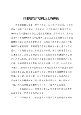 在主题教育培训会上的讲话根据党的XX大部署,党中央决定,从今年3月份开始,以县处级以上领导干部为重点,在全党自上而下分两批开展学习贯彻XXX新时代中国特色社会主义思想主题教育。今年4月3日,党中央召开学习贯彻XXX新时代中国特色社会主义思想主题教育工作会议XXXXXX出席会议并发表重要讲话,标志着主题教育正式拉开序幕XXXXXX的重要讲话,深刻阐述了开展主题教育的重大意义和目标要求,对主题教育各项工作作出全面部署,通篇闪耀着马克思主义真理光芒,是在全面建设社会主义现代化国家关键时刻向全党发出的政治动员,是指导我们学懂弄通做实党的创新理论的生动党课,是高质量开展主题教育的根本遵循。9月5日,中央召开学习贯彻XXX新时代中国特色社会主义思想主题教育第一批总结暨第二批部署会议,提出要认真学习领会、贯彻落实XXXXXX重要指示精神,坚持好、运用好第一批主题教育的有效做法和成功经验,以高度负责的精神把第二批主题教育科学谋划好、精心组织好。下面,就扎实做好主题教育各项工作,下面我讲三点意见。一、提高政治站位,把准核心要义,切实增强开展主题教育的政治自觉、思想自觉和行动自觉XXXXXX深刻指出,在全党深入开展学习贯彻新时代中国特色社会主义思想主题教育,是贯彻落实党的XX大精神的重大举措对于统一全党思想、解决党内存在的突出问题、始终保持党同人民群众血肉联系、推动党和国家事业发展,具有重要意义。我们要从三个方面准确把握开展这次主题教育的重要意义。第一,开展主题教育是统一全党思想、深化理论武装的重大行动。坚持用马克思主义中国化时代化最新成果武装全党、指导实践、推动工作,是我们党创造历史、成就辉煌的一条重要经验党的理论创新每前进一步,理论武装就要跟进一步。XXX新时代中国特色社会主义思想是当代中国马克思主义、二十一世纪马克思主义,是中华文化和中国精神的时代精华,实现了马克思主义中国化时代化新的飞跃,是党的创新理论的最新成果,也是全党全国人民为实现民族复兴伟大梦想而团结奋斗的光辉指引。开展这次主题教育,就是要引导党员干部从思想上正本清源、固本培元把马克思主义看家本领领悟透、学到手、运用好,不断提高政治判断力、政治领悟力、政治执行力,深刻领悟两个确立的决定性意义,增强四个意识、坚定四个自信、做到两个维护,始终在思想上政治上行动上同党中央保持高度一致,共同把党锻造成一块攻无不克、战无不胜的坚硬钢铁。第二,开展主题教育是激励干部担当作为、全面推进中国式现代化的现实需要。党的XX大提出,从现在起,中国共产党的中心任务就是团结带领全国各族人民全面建成社会主义现代化强国实现第二个百年奋斗目标,以中国式现代化全面推进中华民族伟大复兴。开展这次主题教育,就是要把学习贯彻XXX新时代中国特色社会主义思想与激励干部担当作为、推动事业发展统一起来,引导党员干部树立正确的权力观、政绩观、事业观,承担好光荣使命,履行好重大责任,不断提高推动高质量发展本领、服务群众本领、防范化解风险本领,以拼的精神、实的干劲、敢的担当奋进新征程、建功新时代。第三,开展主题教育是发扬优良作风、密切联系群众的内在要求。群众路线是党的生命线和根本工作路线。我们党始终坚持一切为了群众,一切依靠群众,从群众中来,到群众中去,把党的正确主张变为群众的自觉行动。这次主题教育将学习贯彻XXX新时代中国特色社会主义思想与大兴调查研究紧密结合,就是要教育引导全党牢记为民宗旨,深入基层,深入群众,拜群众为师自觉问计于民、问需于民,着力解决人民群众急难愁盼问题,把惠民生、暖民心、顺民意的工作做到群众心坎上,不断增强人民群众获得感、幸福感、安全感。二、聚焦目标要求,精准对标对表,全力推动主题教育走深走实、见行见效这次主题教育的总要求是学思想、强党性、重实践、建新功,根本任务是坚持学思用贯通、知信行统一,把XXX新时代中国特色社会主义思想转化为坚定理想、锤炼党性和指导实践、推动工作的强大力量,使全党始终保持统一的思想、坚定的意志协调的行动、强大的战斗力,努力在以学铸魂、以学增智、以学正风、以学促干方面取得实实在在的成效。具体要达到五个目标:即凝心铸魂筑牢根本、锤炼品格强化忠诚、实干担当促进发展、践行宗旨为民造福、廉洁奉公树立新风。第二批主题教育的时间从今年9月开始,到2024年1月基本结束。中央强调,这次主题教育不划阶段、不分环节,要把理论学习、调查研究、推动发展、检视整改等贯通起来,有机融合、一体推进。与第一批主题教育相比,第二批主题教育有一个显著特点,就是根据不同层级、不同领域、不同对象,区分各个单位的不同情况,因地制宜,细化目标任务和要求,提出切合实际的推进措施,不搞一刀切。要认真学习领会,抓好贯彻落实。重点要抓好四个方面。第一,坚持把理论学习贯穿始终,在学思想中强党性。