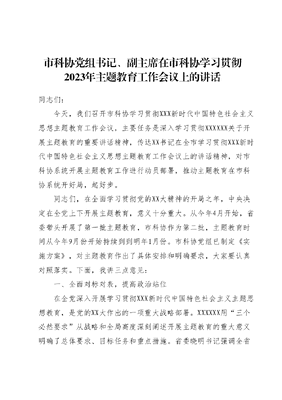 市科协党组书记、副主席在市科协学习贯彻2023年主题教育工作会议上的讲话同志们:今天,我们召开市科协学习贯彻XXX新时代中国特色社会主义思想主题教育工作会议,主要任务是深入学习贯彻XXXXXX关于开展主题教育的重要讲话精神,传达XX书记在全市学习贯彻XXX新时代中国特色社会主义思想主题教育工作会议上的讲话精神,对市科协系统开展主题教育工作进行动员部署,推动主题教育在市科协系统开好局,起好步。同志们,在全面学习贯彻党的XX大精神的开局之年,中央决定在全党上下开展主题教育,意义十分重大。从今年4月开始,省委带头开展了第一批主题教育,市科协作为第二批,主题教育时间从今年9月份开始持续到到明年1月份。市科协党组已制定《实施方案》,对主题教育作出了具体安排和明确要求,大家要认真对照落实。下面,我讲三点意见:一、全面对标对表,提高政治站位在全党深入开展学习贯彻XXX新时代中国特色社会主义主题思想教育,是党的XX大作出的一项重大战略部署。XXXXXX用三个必然要求从战略和全局高度深刻阐述开展主题教育的重大意义明确了总体要求、目标任务和重点措施。省委晓明书记强调全省第二批主题教育要全面对标、精心组织,做到六个贯穿始终市委XX书记从在政治忠诚上坚定坚决、在理论学习上入脑入心、在调查研究上走深走实、在推动发展上见行见效、在为民服务上用心用情、在检视整改上较真较劲、在自我革命上从严从实七个方面提出了明确的工作要求。市科协全体党员要切实提高政治站位,自觉把思想和行动统一到XXXXXX重要讲话精神和中央、省委市委决策部署上来,以高度的思想自觉、政治自觉、行动自觉推进主题教育。1.要从坚定捍卫两个确立、坚决做到两个维护的政治高度来提升政治站位。拥有坚强的领导核心和科学的理论指引是党的事业不断从胜利走向胜利的决定性原因。历史和实践充分证明,XXXXXX是当之无愧的党的核心、人民领袖、军队统帅,是中华民族伟大复兴号巨轮的掌舵者、领航人,XXX新时代中国特色社会主义思想是全党全国人民的思想旗帜和行动指南。但在现实中,市科协系统少数党员干部不爱学、不深学,装样子、搞形式特别是干部学用结合不紧密、判断形势不准确、工作思路不清晰应对风险不主动。归根结底讲,就是因为理论武装不到位,没有紧跟XXX和党中央的步伐。开展主题教育,就是要引导科协系统党组织和党员干部更加自觉地用好党的创新理论,更加坚定捍卫两个确立、坚决做到两个维护,确保始终紧跟XXX、奋进新征程。2.要从锚定三高四新美好蓝图、推动科协事业高质量的发展维度来提升政治站位。党的XX大紧扣新时代新征程党的中心任务,描绘了中国式现代化全面推进中华民族伟大复兴的宏伟蓝图,XXXXXX每到一个地方调研,无一遗漏都对推动高质量发展有明确的指示和要求。前段时间XXX在黑龙江省调研并在新时代推动东北全面振兴座谈会上强调,要完整准确全面贯彻新发展理念,牢牢把握高质量发展这个首要任务和构建新发展格局这个战略任务,努力走出一条高质量发展、可持续振兴的新路子。前不久召开的省委十二届四次全会,聚焦加快实现三高四新美好蓝图谋划部署了全省当前和未来五年的重点工作任务。开展这次主题教育,就是要引导市科协系统党组织和党员干部从XXX新时代中国特色社会主义思想中汲取奋进力量,以更加昂扬的精神状态、更加强烈的责任担当,全面贯彻落实党的XX大精神和省委全会精神紧紧围绕加快实现三高四新美好蓝图,紧紧围绕XX区域中心化进程,紧紧围绕制造立市、文旅兴城发展战略,为加快推进XX高质量发展贡献科协力量。3.要从深入推进全面从严治党、着力解决党内突出问题的现实角度来提升政治站位。XXXXXX强调,开展主题教育是深入推进全面从严治党、以党的自我革命引领社会革命的必然要求。近年来,我会以清廉科协建设为抓手,着力营造风清气正的政治生态。但还是存在一些问题,比如,贯彻落实上级政策部署不够扎实;落实中央八项规定精神不够严格;少数党员干部能力素质不高、精神状态不佳,为了不出事,宁愿不干事等等。分析这些问题的根源,就在于思想建设抓得不够,理论武装抓得不紧。开展主题教育,就是引导科协系统党组织和党员干部以深化理论武装推进自我革命,主动接受政治体检、打扫政治灰尘,解决好思想不纯、作风不纯、组织不纯等的问题,不断增强自我净化、自我完善、自我革新、自我提高的能力,切实把市科协系统党员干部队伍锻造得更加有力,凝聚起干事创业的强大合力。二、把握目标要求,提升工作实效认真贯彻XXXXXX重要讲话精神,紧紧围绕学思想、强党性重实践、建新功的总要求,牢牢把握深入学习贯彻XXX新时代中国特色社会主义思想这一主题主线和根本任务,全面落实以学铸魂、以学增智、以学正风、以学促干的重要要求,坚持理论学习、调查研究、推动发展、检视整改、建章立制等重点措施