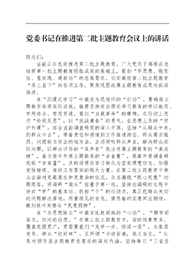 党委书记在推进第二批主题教育会议上的讲话同志们:当前正在扎实推进第二批主题教育。广大党员干部要在总结好第一批主题教育经验成效的基础上,紧扣学思想、强党性、重实践、建新功的总体要求,切实做好第二批主题教育承上启下的各项工作,聚焦巩固拓展主题教育成果向纵深推进。在沉浸式学习中激发为民情怀的行动。要确保主题教育取得实际成效,就要坚持突出理论学习教育的学以致用、学用结合、学思贯通。要以自我革命的精神,在行动上进行检视反思,以挑战青春的勇气,在思想上及时回炉补课。结合当前调查研究的深入开展,坚持从群众中来,到群众中去,带着责任和感情到工作推进滞后、群众需求强烈、问题较为突出的地方去,主动倾听群众声音,解决群众实际问题,以群众评价的真声音亮出开展主题教育的真成绩,着力提升开展主题教育的含金量,提高开展调查研究的含真量,及时将理论学习转化为坚定理想信念、加强党性锤炼、推动工作落实的强大力量。在第二批主题教育中势必会面对更高要求和更复杂的状况,自当围绕民心民意切题而答,将调研镜头前置于第一线,坚持在调研的过程中夯实学的基本功、折射干的行动力,真正把群众关切的问题解决落地,用看得见的变化、摸得着的实惠回应期待,做到枝叶关情与民意同频。在为思想除尘中激发比赶超越的心动。博学而笃志,切问而近思。在第二批主题教育中,面向对象更多、覆盖范围更广,更需要我们先学一步、悟深一层,为基层党员、群众打好样。正所谓书读百遍,其义自见。认真对照开展主题教育总要求的深刻内涵,坚持每日三省吾身,坚持时刻反躬自省,充分用好批评和自我批评的这剂良方好药,在红脸出汗中做实政治体验,在深加工,杜绝一团和气式的查不足找差距,警惕交卷时自答应付式调研,坚持善学真学、力求深研细学,不掺杂虚假漂浮,不回避问题短板,摒弃搞形式主义,既要解决老问题,也要处理新矛盾,在总结第一批主题教育成效建章立制的基础上,写好第二批主题教育前后衔接的后半篇文章。因此,党的创新理论发展到哪里,我们的理论学习、思想武装就应该深入到哪里,只有结合最新实践和发展要求,做到常学常新、善学善做、活学活用,方能达到触类旁通、融会贯通的效果,真正增强政治认同、思想认同、理论认同、情感认同,确保耳畔常有矢志不渝跟党走的忠诚强音。在知信行统一中诠释示范带头的主动。一日三省吾身,则知明而行无过矣。既要全面查找自身不足和工作偏差,带头抓好整改落实,更要坚持问题导向,切实解决群众急难愁盼问题,以整改的实际成效让群众满意、使群众认可。坚持规定动作严格落实不走样,切忌走过场,聚焦自选动作特色鲜明有亮点,杜绝搞形式,对推动整改整治形成的问题清单,加强闭环管理,逐一挂账销号,摒弃装样子。在巩固拓展脱贫攻坚成果中强化发展意识,在全面推进乡村振兴高质量发展中争当关键变量,以精益求精的态度,抓好事关大事的小事,以放大格局的认知,抓细关系全局的细节,在深学细研上,把握时代坐标点,在学以致用上,跑出发展加速度,把示范带头作用贯穿于主题教育全过程,切实推动主题教育取得扎实成效。广大党员干部在驰而不息、久久为功中捍卫成果,赴一场涤荡心行之约,以检身若不及的清醒时时反省自我、鞭策自我,在进行批评与自我批评中红脸出汗,在虚心接受群众意见中敲打提神,在对标规矩制度中正心修身,真正对生活、工作、言行举止来一次全面检视、深度体检,真正激荡好风气促形象焕新。