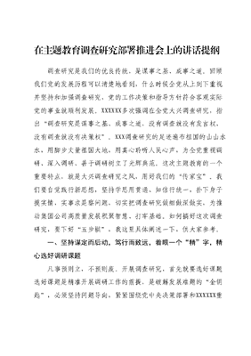 在主题教育调查研究部署推进会上的讲话提纲调查研究是我们的优良传统,是谋事之基、成事之道。回顾我们党的发展历程可以清楚地看到,什么时候全党从上到下重视并坚持和加强调查研究,党的工作决策和指导方针符合客观实际党的事业就顺利发展。XXXXXX多次强调在全党大兴调查研究,指出调查研究是谋事之基、成事之道,没有调查就没有发言权,没有调查就没有决策权。XXX调查研究的足迹遍布祖国的山山水水,用脚步丈量祖国大地,用真心聆听人民心声,为全党重视调研、深入调研、善于调研树立了光辉典范。这次主题教育的一个重要特点,就是大兴调查研究之风,用好我们的传家宝。我们要自觉践行新思想,坚持学思用贯通、知信行统一,扑下身子摸实情,实事求是察问题,切实把调查研究做细做深做实,为推动集团公司高质量发展积聚智慧、打牢基础。如何搞好这次调查研究,要下好五步棋,我这里具体阐述一下,供大家参考。一、坚持谋定而后动,笃行而致远,着眼一个精字,精心选好调研课题凡事预则立,不预则废。开展调查研究,首先就要选好课题选好课题是精准开展调研工作的前提,是破解发展难题的金钥匙,必须坚持问题导向,紧紧围绕党中央决策部署和XXXXXX重要指示批示精神,围绕社会经济发展中存在的突出问题和群众反映强烈的热点难点问题,围绕解决党的建设面临的紧迫问题,聚焦加强政治建设、思想建设、作风建设的要求,把握调研方向,突出调研重点,明确调研主题。作为基层组织部门,要学会开拓调研思维,准确把握新时代新形势对于组织工作的新要求新任务精准选定理论性与实践性高度契合的调研课题,确保调查研究新主题。要充分掌握调研本领,立足全面推进乡村振兴战略这个大前提,把搜集反馈上来的各种问题梳理汇总、分门别类,选择具有重大影响的关键问题和群众最关注的热点问题,并且结合实际选择最急须解决的难点重点问题,虚心听取当地群众反映的现实和难点,多方面求证、多角度勘察,采取用问卷调查、面谈访问观察比较等科学方法,获取有效数据和信息,真正做到,找好调研方向、踏实调研点位、摆正调研态度,全面了解、直达症结核心。二、坚持纸上得来终觉浅,绝知此事要躬行,抓住一个准字,深入调查找准问题。调研准备是搞好调研的重要前提,包括:制定方案,提出调研的人员、时间、地点、任务分工、保障及要求等。收集资料,提前梳理出调研需要解决的问题,制定问卷调查内容等。储备知识,围绕调研课题,在网上网下广泛学习。加强协调,同步做好保障工作,明确任务分工等。开展调研前,就应该把问题往细处想、往深处问,比如:访谈群从时用什么样的语言和方式,以消除他们的顾虑,真正摸清实情;又如:实地查看采取何种方式避免人为干扰,看到表面光鲜下存在的真实问题,等等。做调研方案时,调研组成员要多一些讨论,把自己摆进真实场景去模拟,集中智慧,群策群力,尽可能设想可能会出现的各种问题。实地调研时,要奔着问题去、向着难处攻,做到有的放矢。最后,调研重点要善于发现问题,调研不是走马观花的作秀,而是脚踏实地的寻访,要走出办公室,深入基层一线,广泛倾听基层群从诉求,真正把情况摸清、把问题找准、把对策提实。只有掌握全面准确、客观、生动的第一手材料,才能把事情全貌和真相了解清楚,为决策提供科学依据。三、坚持凡事预则立,不预则废,突出一个硬字,切实转变工作作风调查研究是每个党员干部必备的基本功,是能力作风建设的基础,是必修课。反对形式主义调研,关键是要有蹲下去看蚂蚁的精神和解剖麻雀的态度,着重解决好作风飘浮、工作不实的问题。调查研究要务求深、实、细、准、效,深入基层、深入一线,多到困难多、群众意见集中、工作打不开局面的地方去,与群众同坐一条板凳,让群众敞开心扉、讲掏心窝子的话,为群众解决急难愁盼问题,用心用情为民造福。要在调查的基础上深化研究,把脉问诊、解剖麻雀,真正把情况摸清、把问题找准、把对策提实,力戒形式主义、官僚主义。要对调研中发现的问题,逐一梳理形成问题清单、责任清单、任务清单,一抓到底、务求实效。要在求深上下功夫,夯实理论基础,学深悟透XXX新时代中国特色社会主义思想,掌握运用贯穿其中的立场观点方法,从而透过纷繁复杂的现象准确认识和把握问题的本质和规律;要在求准上下功夫,掌握科学的调研方法,做到身入更要心到,采取蹲点调查、开会调查、实地考察、问卷调研等,同时充分利用互联网、大数据等信息技术,不断创新调查研究的方式方法;要在求效上下功夫,党员干部要切实做好调查研究后半篇文章,在调查的基础上进行深入细致的研究,对症下药、因情施策,从调研成果中提炼解难题的金钥匙,在不断解决问题的中赢得群众信任。四、坚持板凳甘坐十年冷,文章不写半句空,讲究一个巧字,注重创新调研方法掌握实情是调查研究的基石,只有深入基层、摸清情况、吃透问题,才能提出破解之策,助推